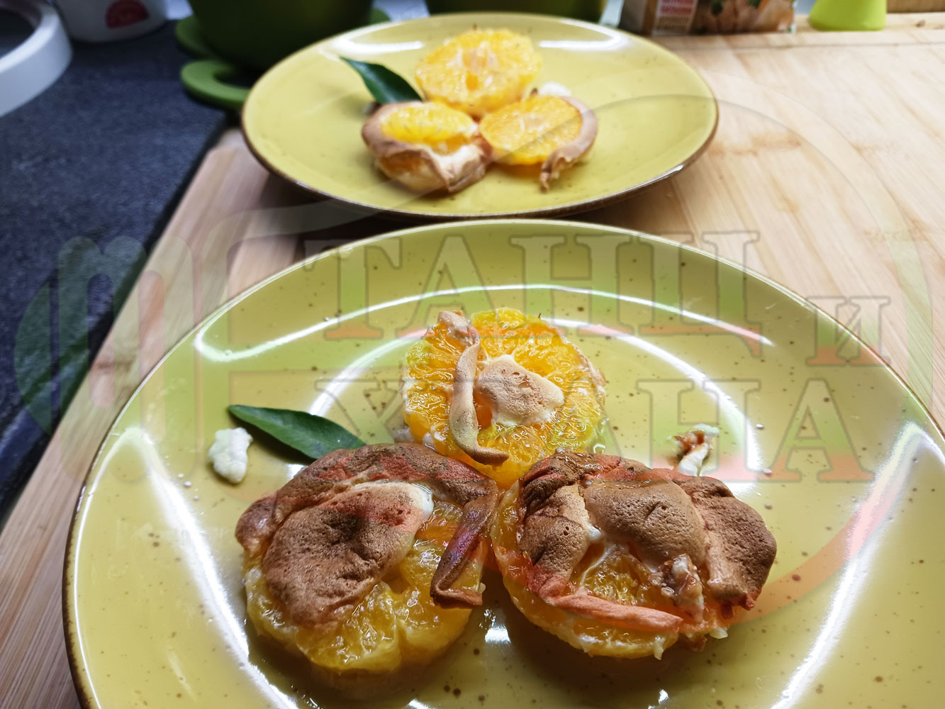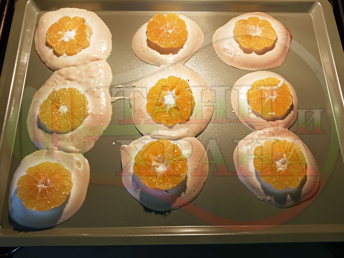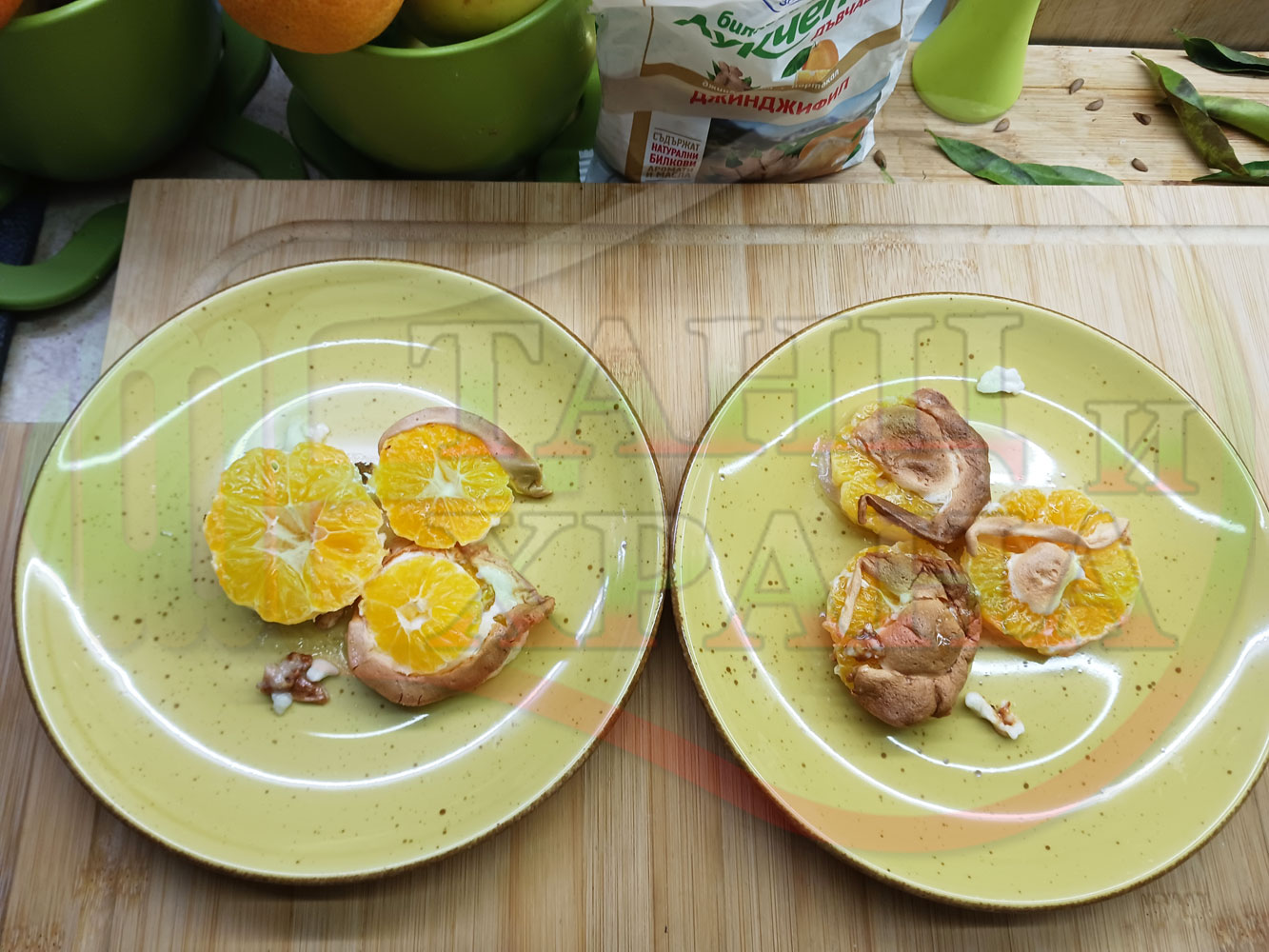 Белтъчен кремообразен плодов десерт "Мандаринов белтъчнозахарен" приготвен с яйчени белтъци, кристална захар и щипка готварска сол запечен с пресни мандарини