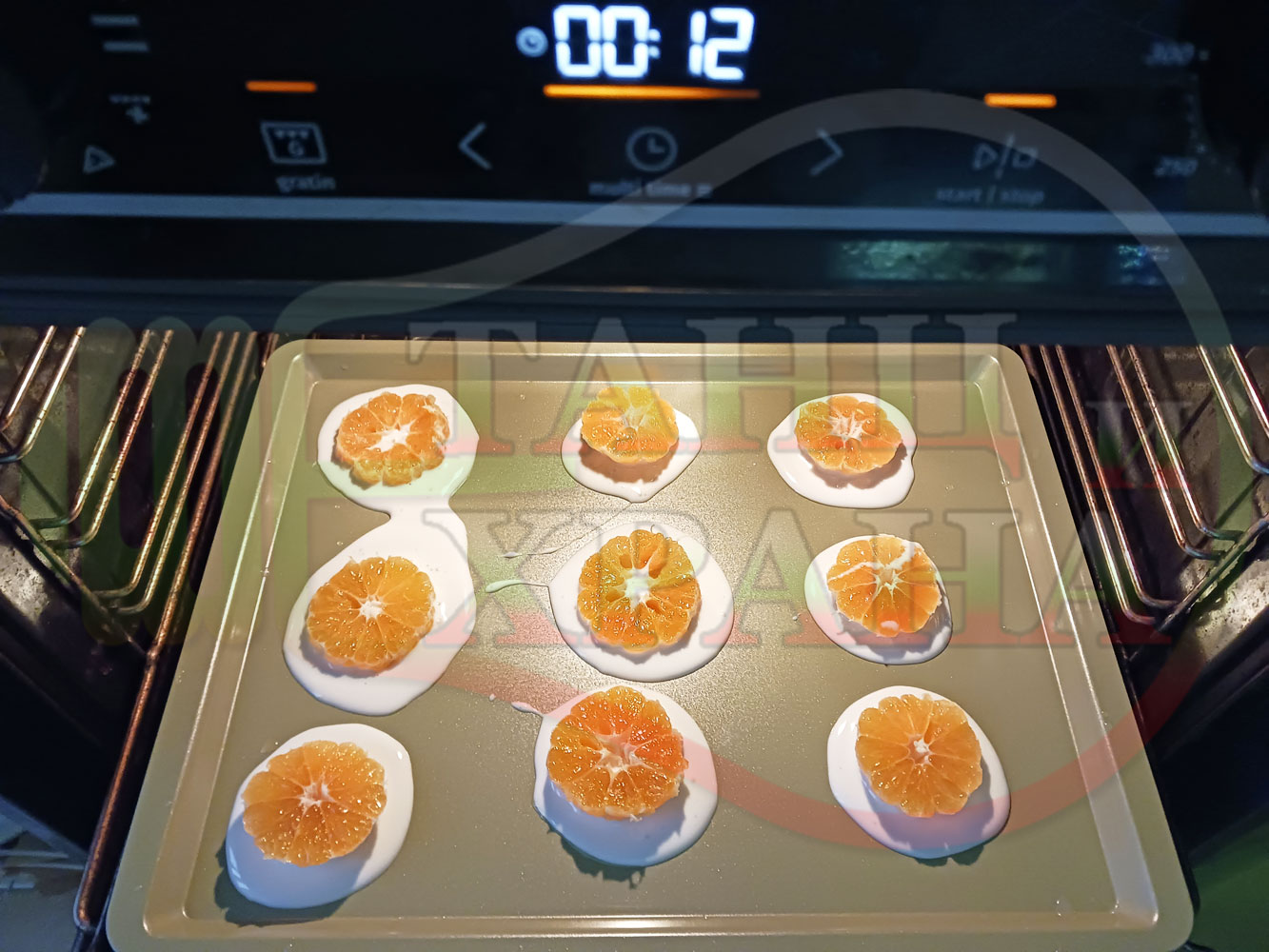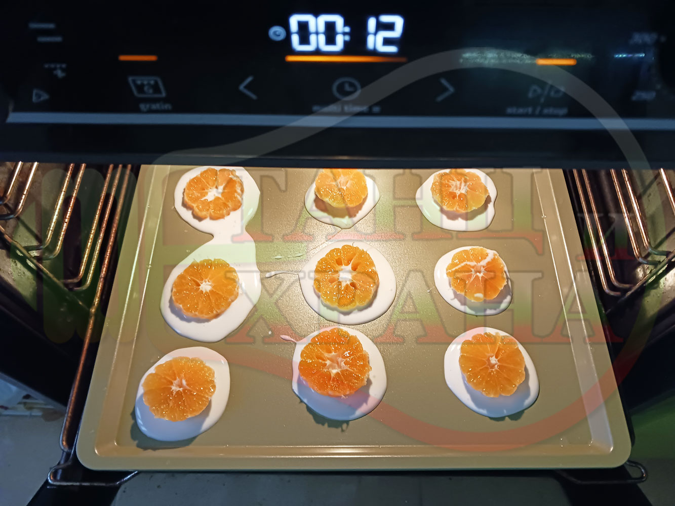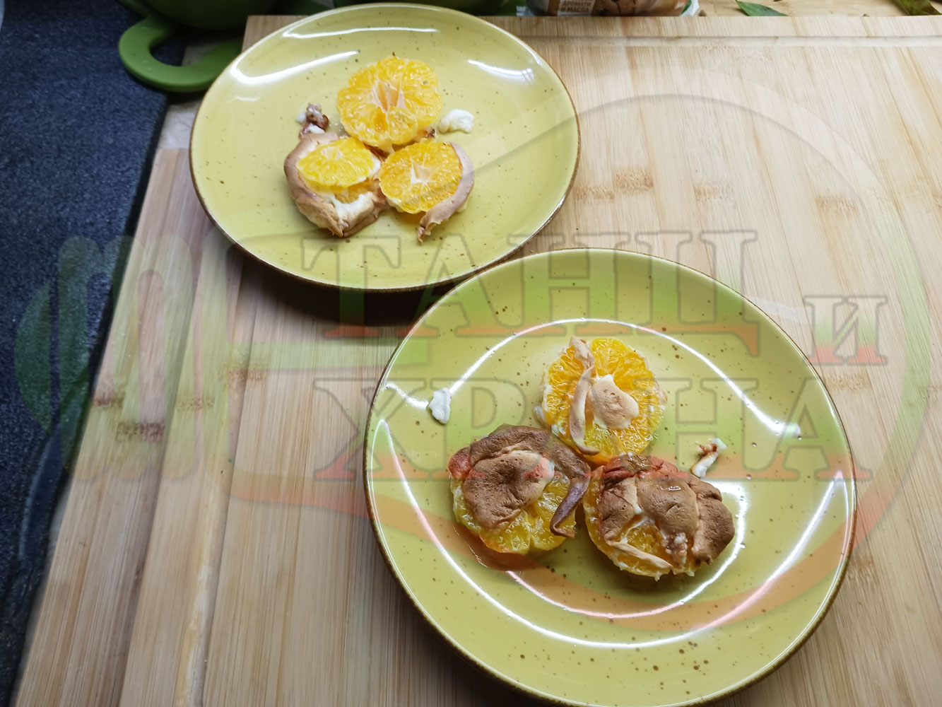 Белтъчен кремообразен плодов десерт "Мандаринов белтъчнозахарен" приготвен с яйчени белтъци, кристална захар и щипка готварска сол запечен с пресни мандарини