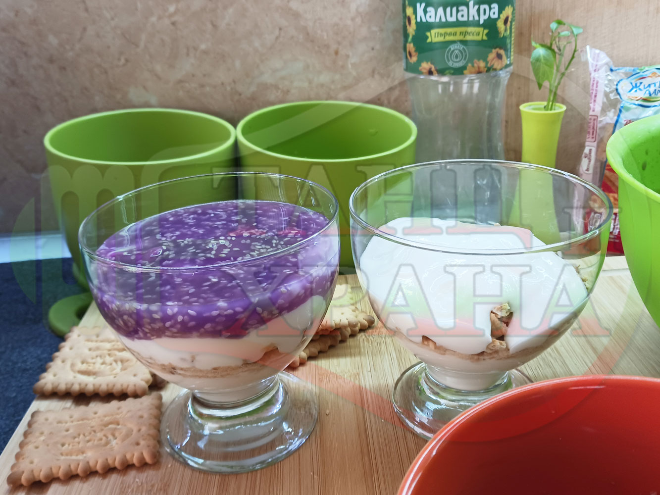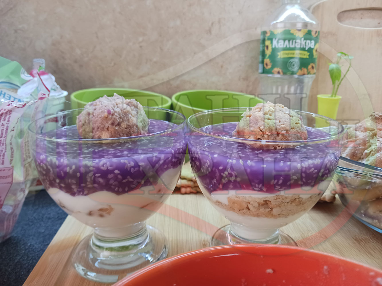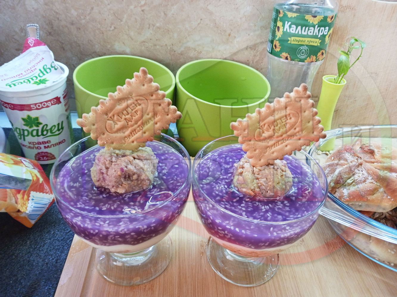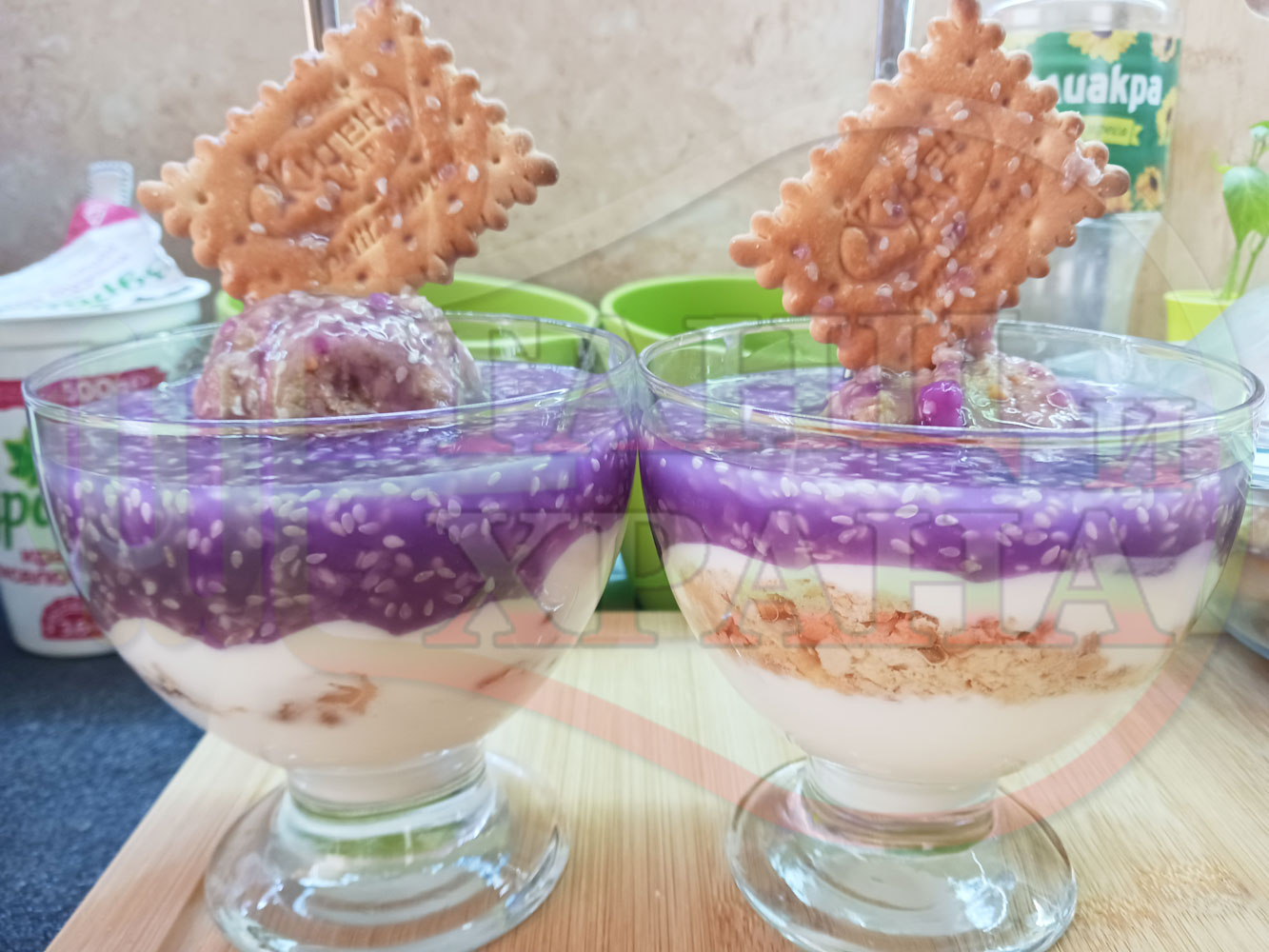 Разпределете малка част от киселото мляко в стъклени чаши, начупете по 5 бисквити на едро във всяка чаша и покрийте бисквитите с равномерно количество от останалото мляко. Сипете по 10 супени лъжици от нишестения рядък крем върху млякото във всяка чаша и поставете по 1 топка от бисквитеното тесто в средата. Гарнирайте с по 1 цяла бисквита върху всяка топка и сипете по 1 супена лъжица от нишестения крем със сусам върху бисквитите и топките (гарнирайте и украсете по ваше желание и усмотрение).