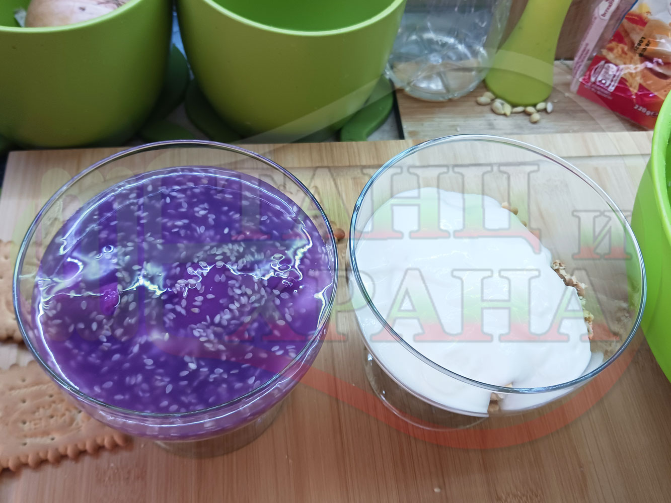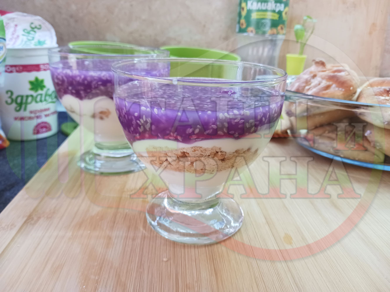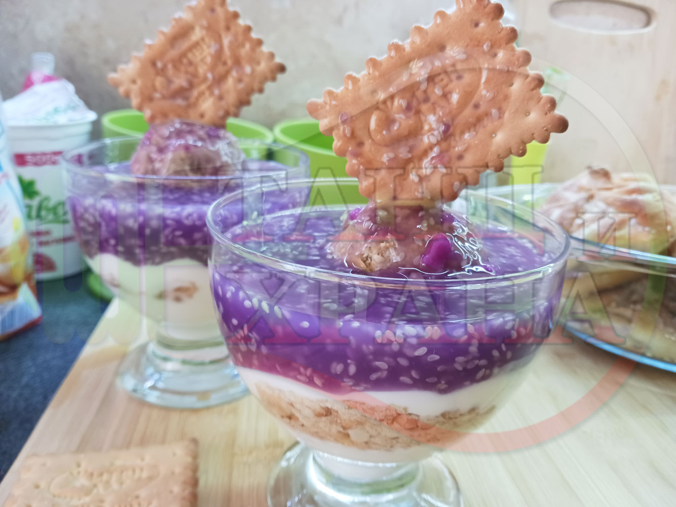 Разпределете малка част от киселото мляко в стъклени чаши, начупете по 5 бисквити на едро във всяка чаша и покрийте бисквитите с равномерно количество от останалото мляко. Сипете по 10 супени лъжици от нишестения рядък крем върху млякото във всяка чаша и поставете по 1 топка от бисквитеното тесто в средата. Гарнирайте с по 1 цяла бисквита върху всяка топка и сипете по 1 супена лъжица от нишестения крем със сусам върху бисквитите и топките (гарнирайте и украсете по ваше желание и усмотрение).