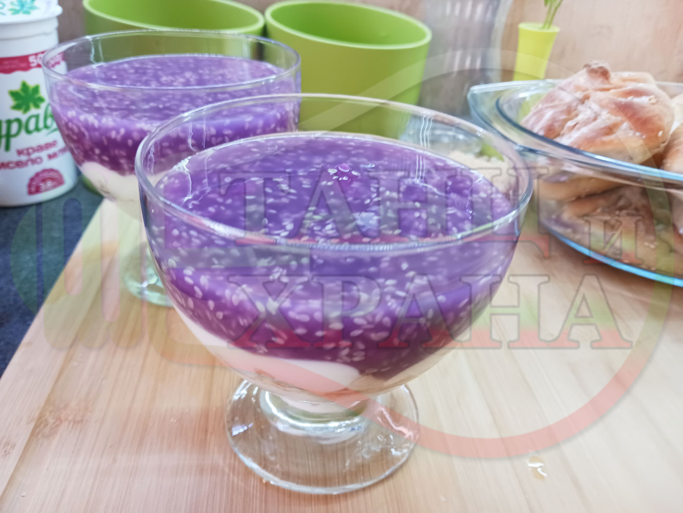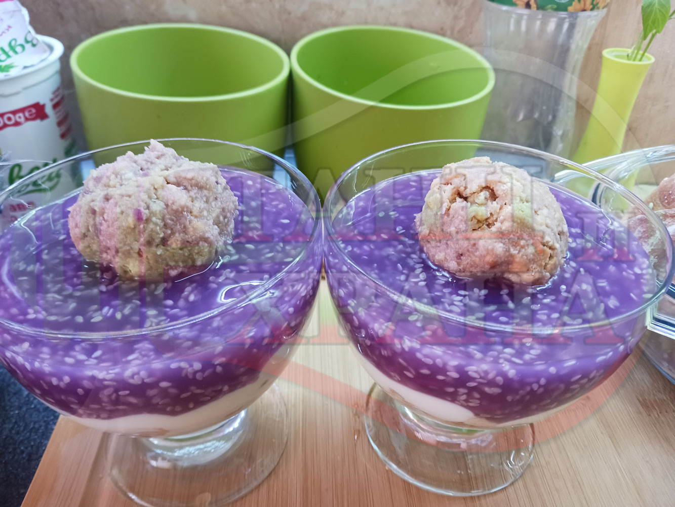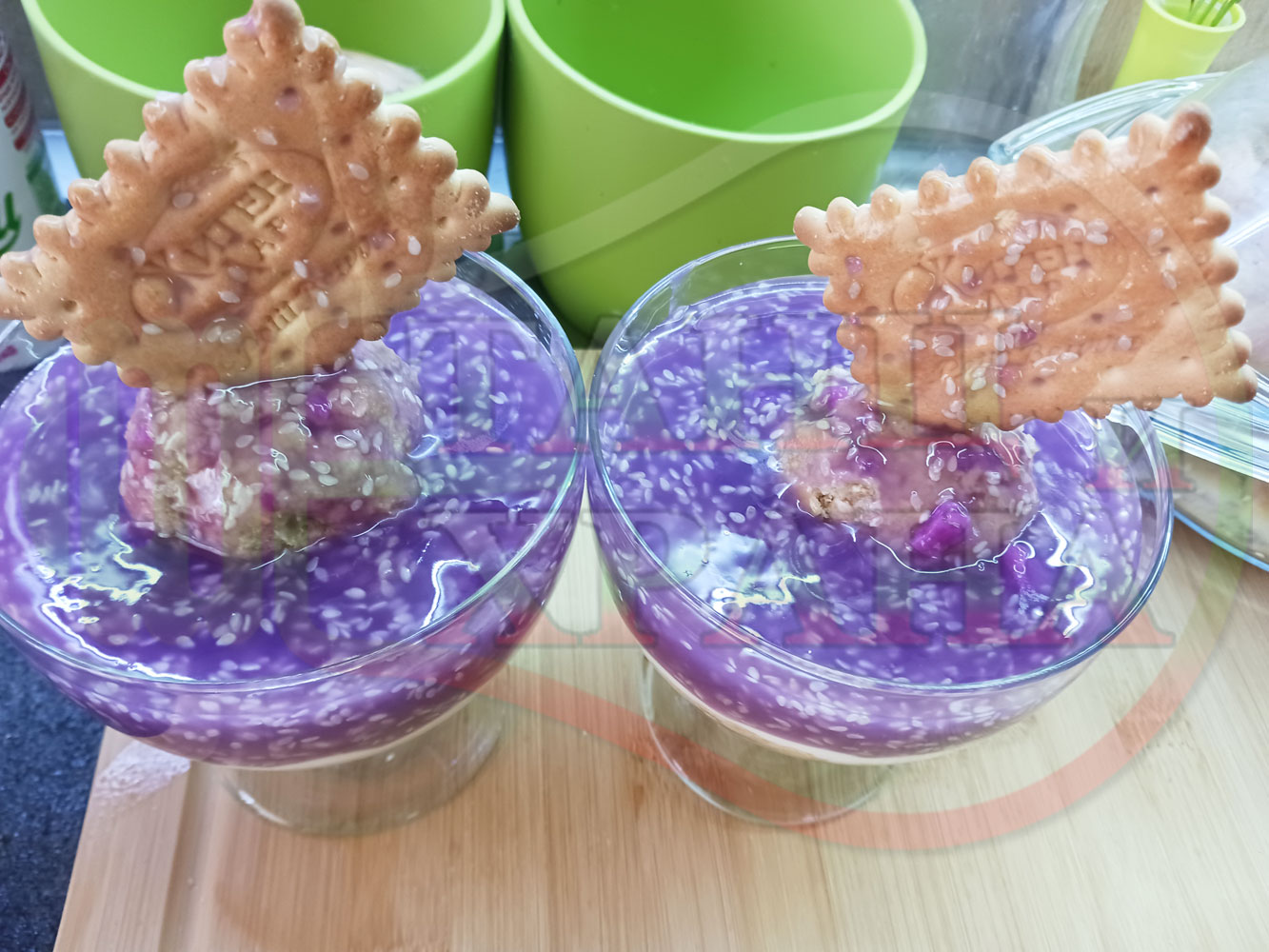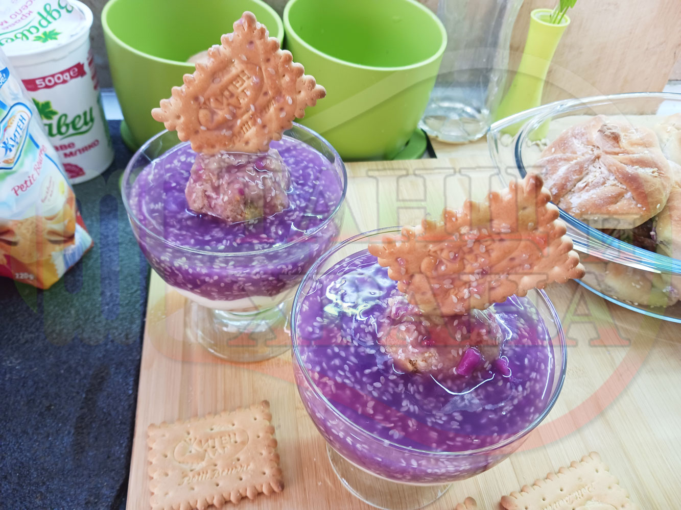 Разпределете малка част от киселото мляко в стъклени чаши, начупете по 5 бисквити на едро във всяка чаша и покрийте бисквитите с равномерно количество от останалото мляко. Сипете по 10 супени лъжици от нишестения рядък крем върху млякото във всяка чаша и поставете по 1 топка от бисквитеното тесто в средата. Гарнирайте с по 1 цяла бисквита върху всяка топка и сипете по 1 супена лъжица от нишестения крем със сусам върху бисквитите и топките (гарнирайте и украсете по ваше желание и усмотрение).