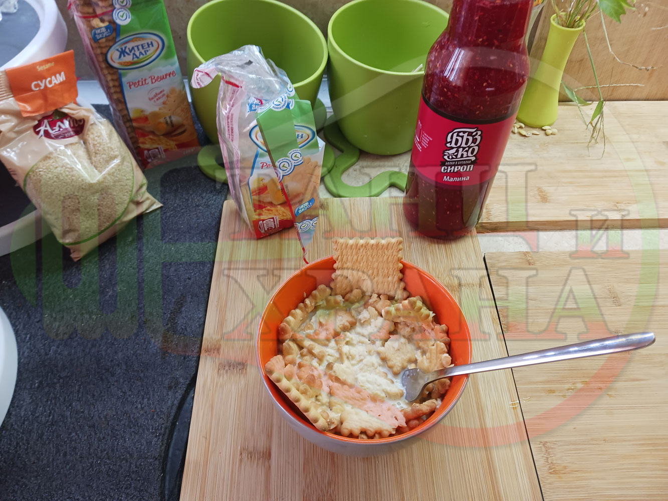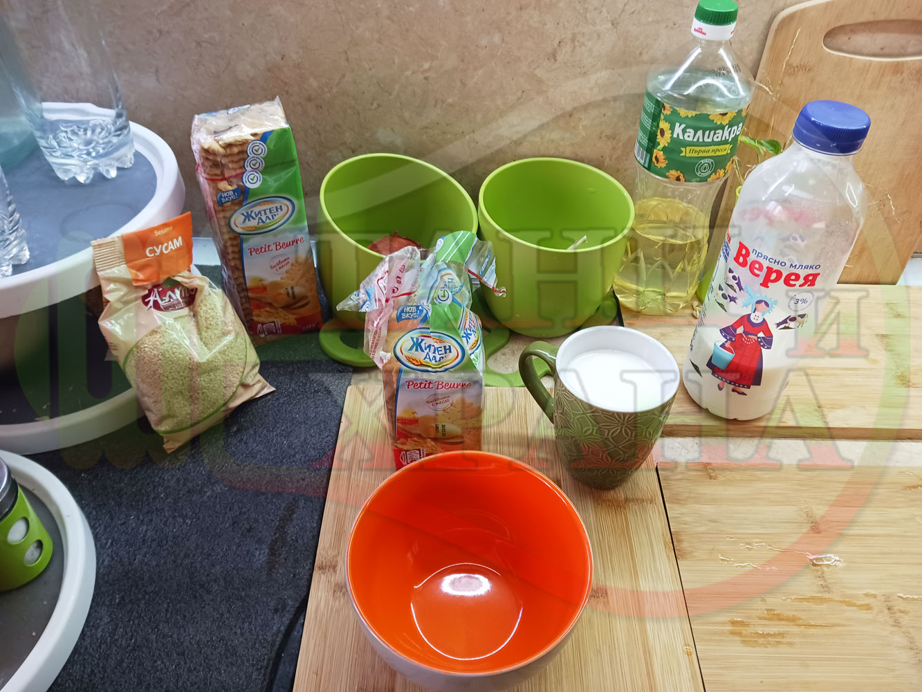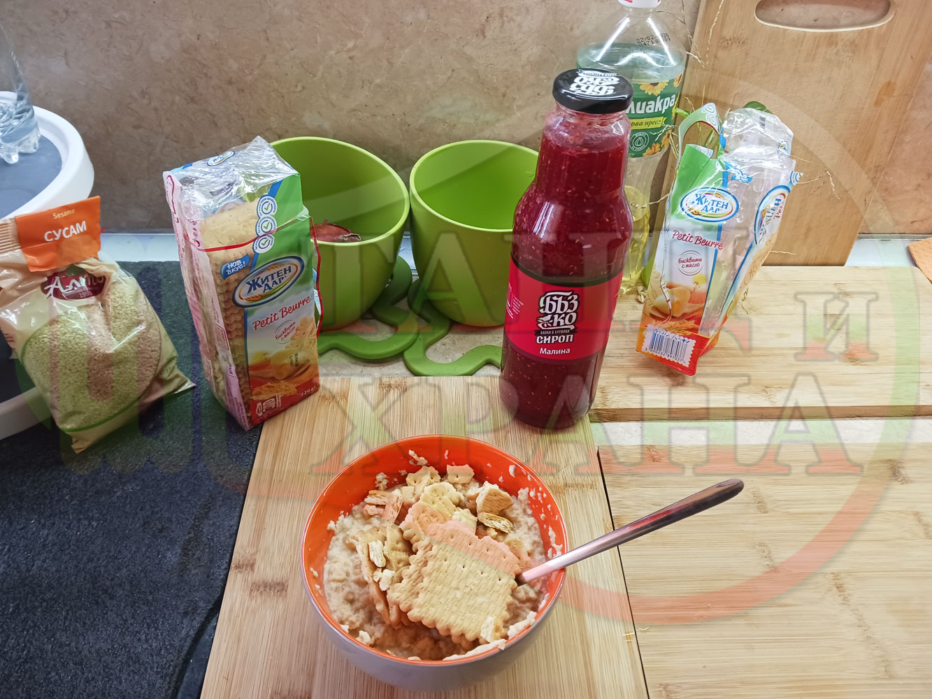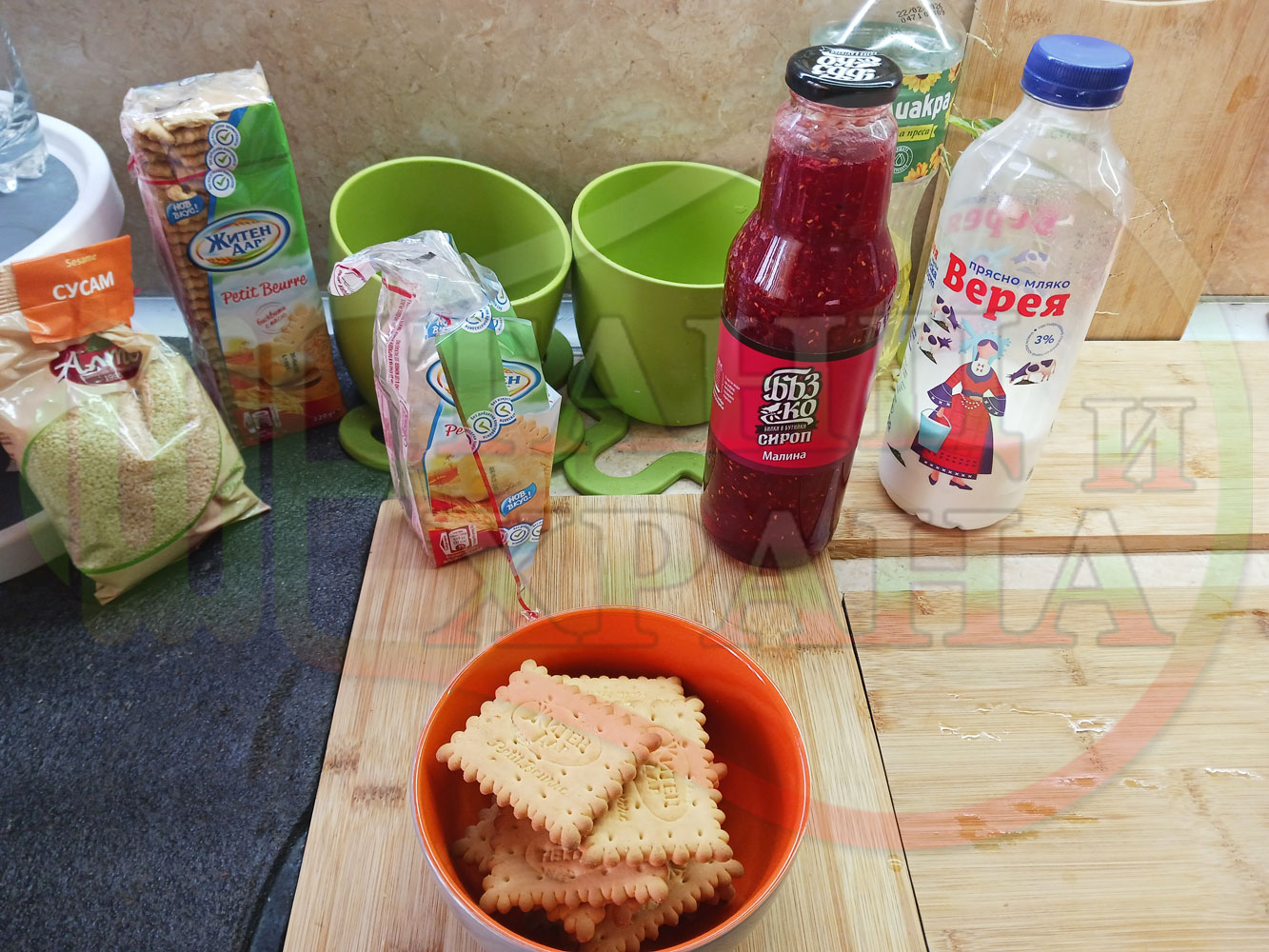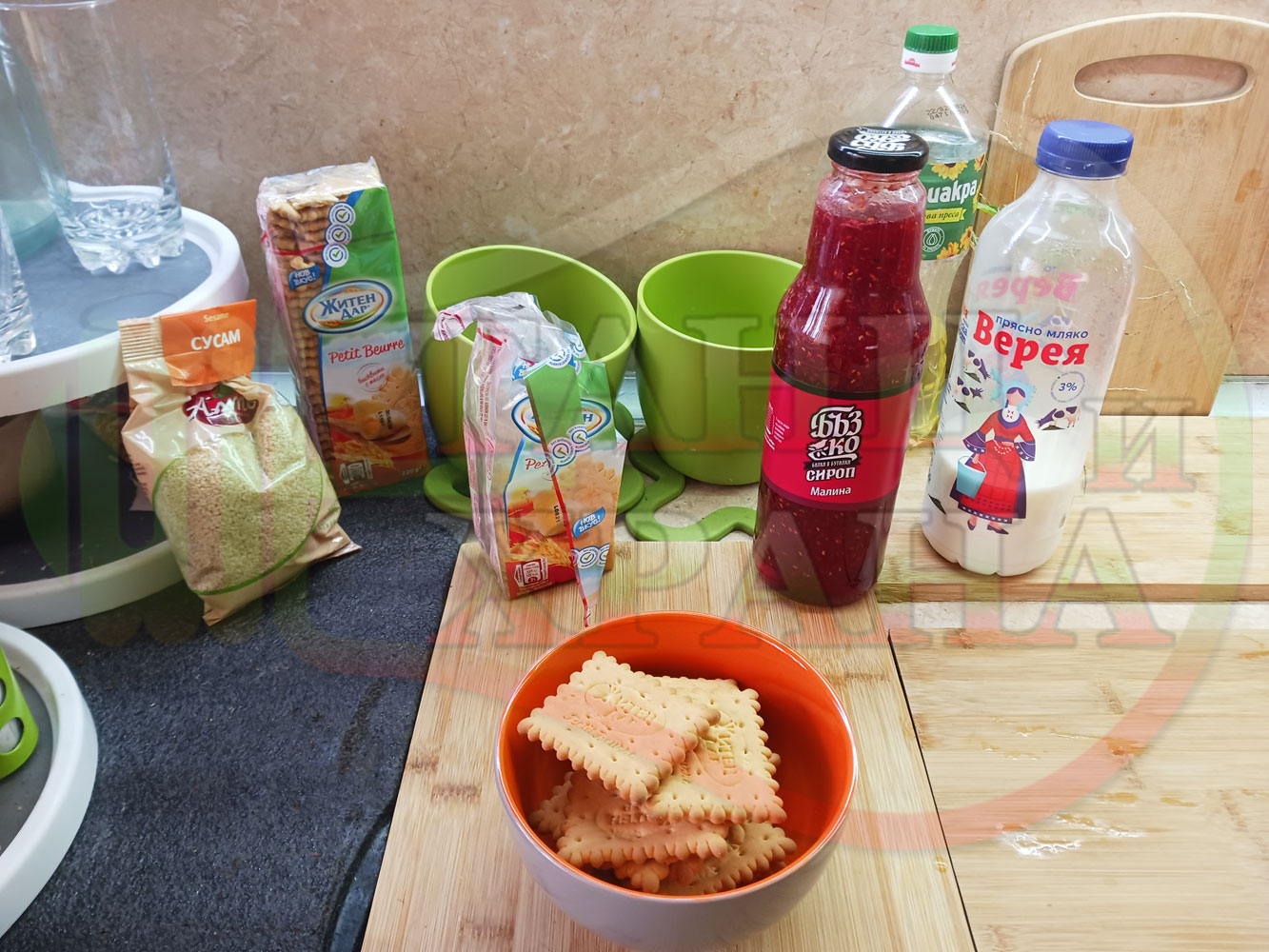 1. Бисквити - 1 пакет (обикновени с масло от 220 гр.)