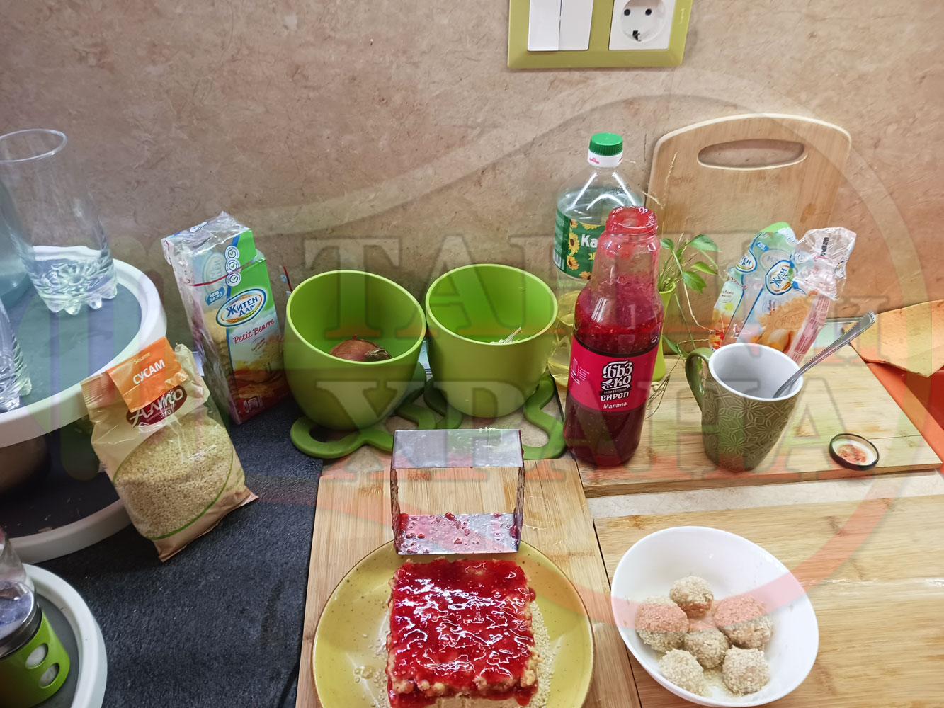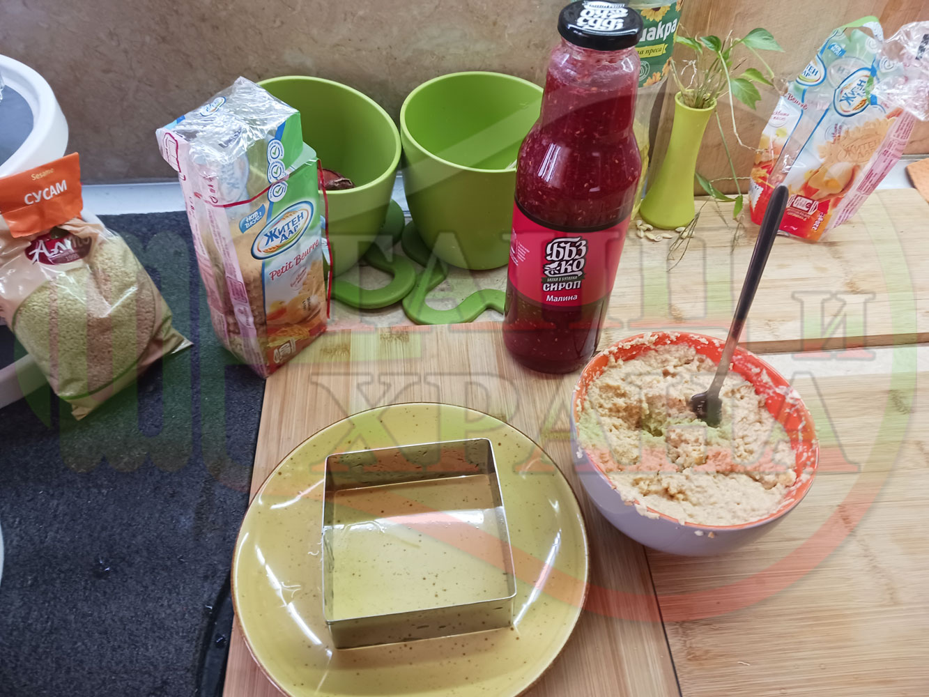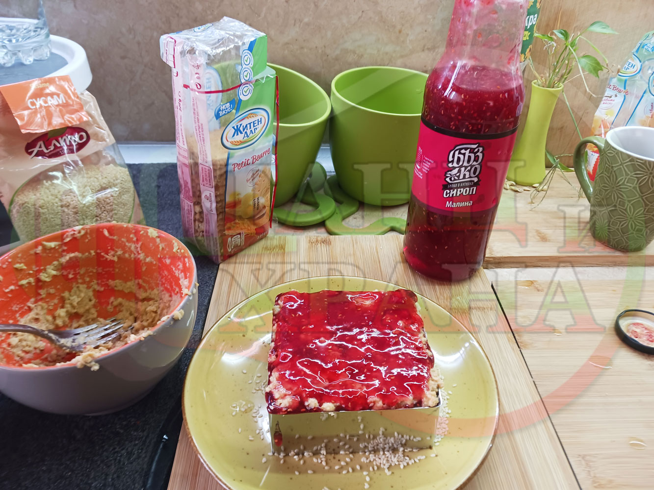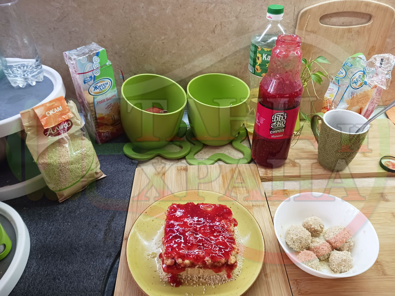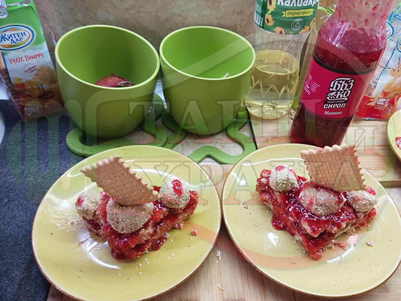 ПРОДУКТИ: Приблизителни количества за бисквитена плодова млечна мини торта "Малиновосиропена прясномлечна топчестосусамова" приготвена с обикновени бисквити с масло, малинов сироп и прясно мляко гарнирана с бисквитени трюфели със суров сусам