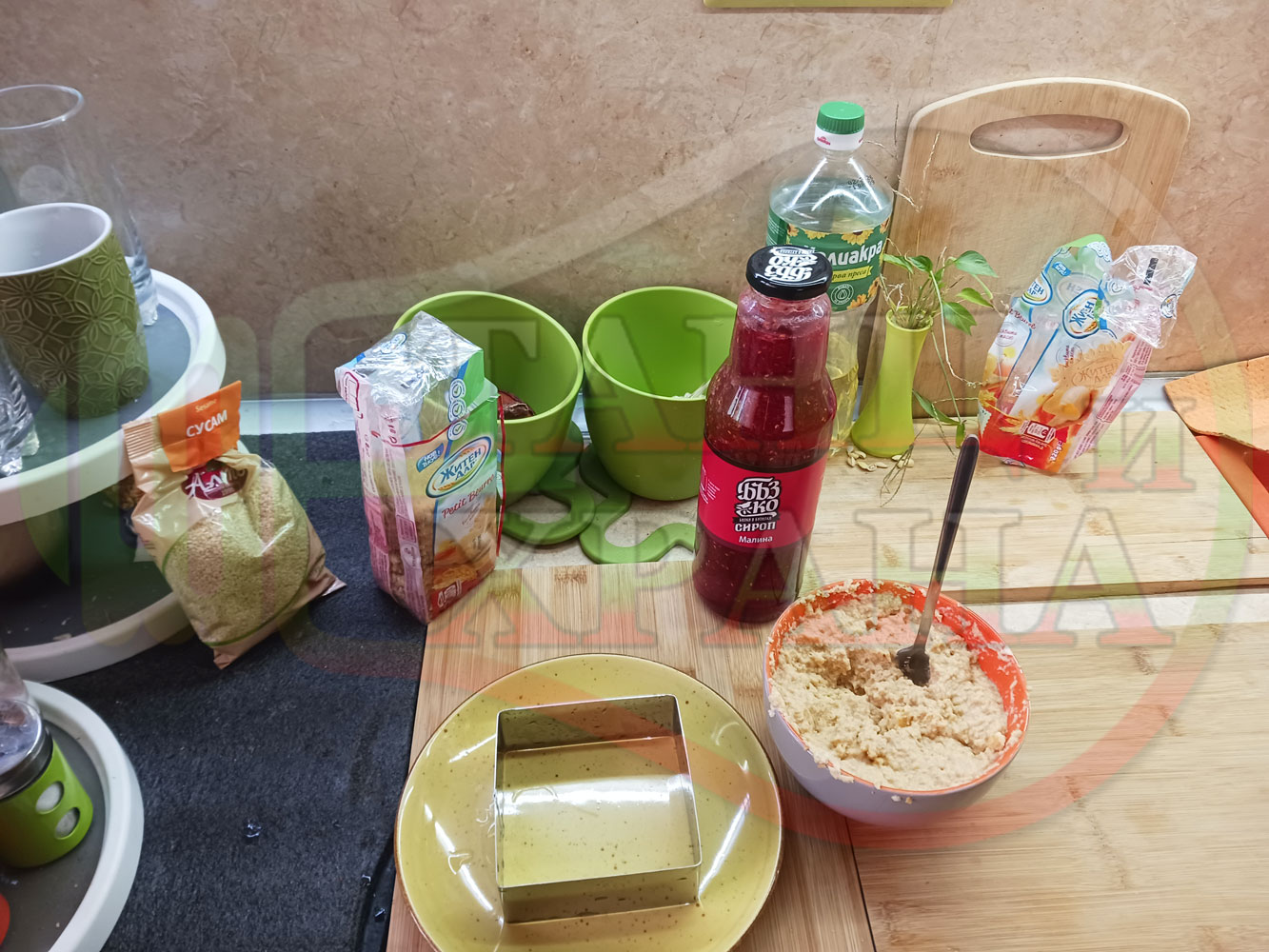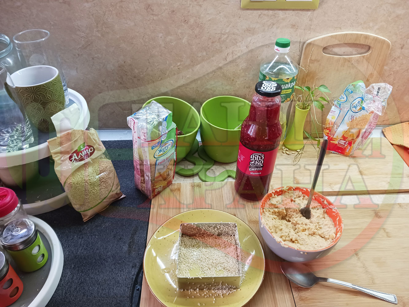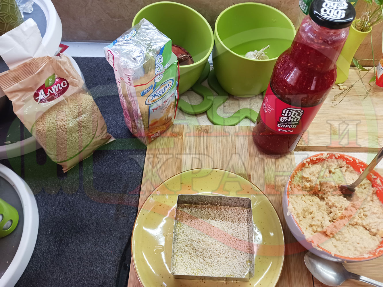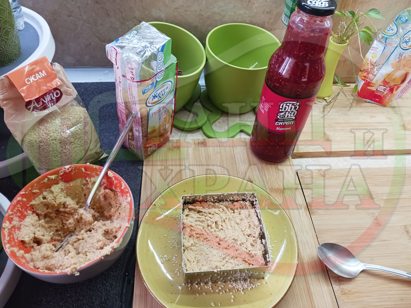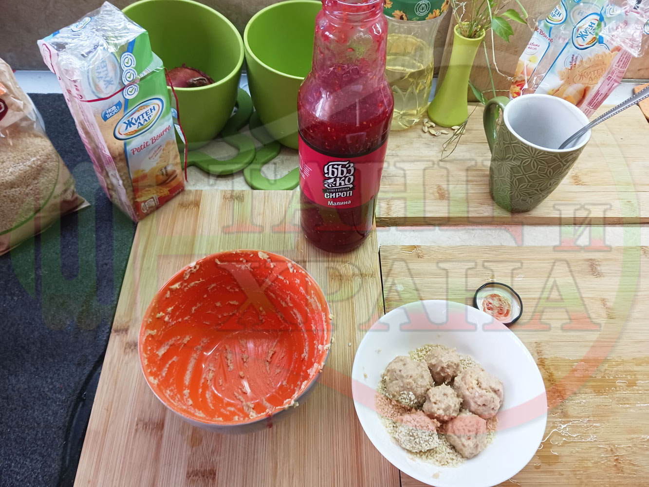 ПРОДУКТИ: Приблизителни количества за бисквитена плодова млечна мини торта "Малиновосиропена прясномлечна топчестосусамова" приготвена с обикновени бисквити с масло, малинов сироп и прясно мляко гарнирана с бисквитени трюфели със суров сусам
