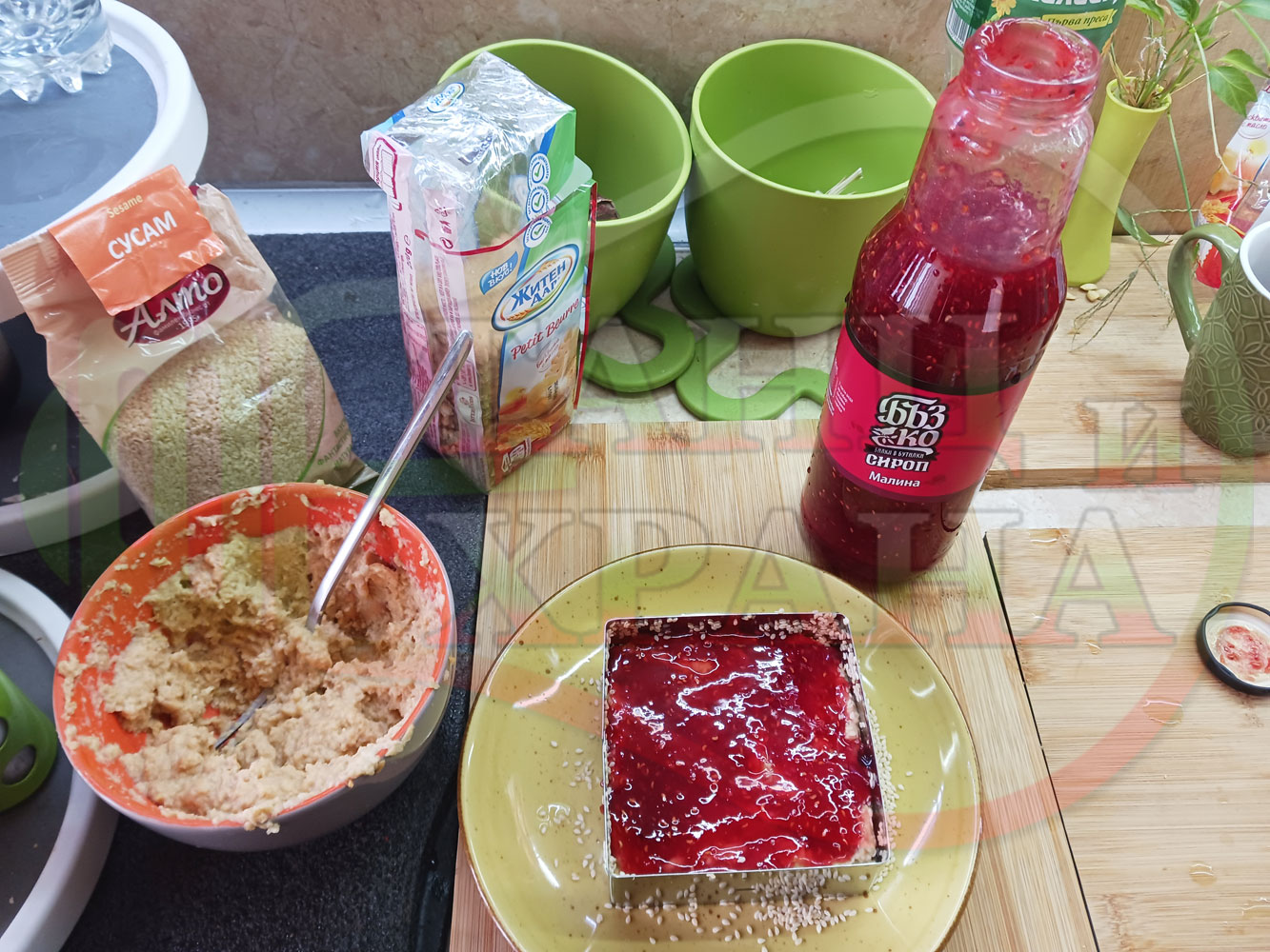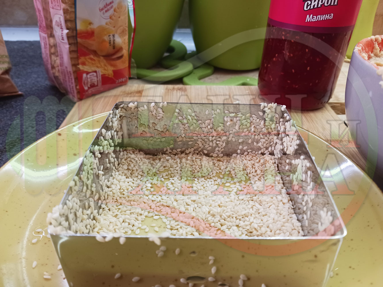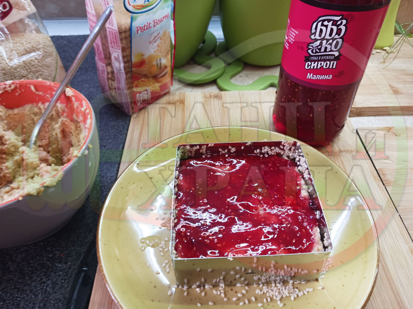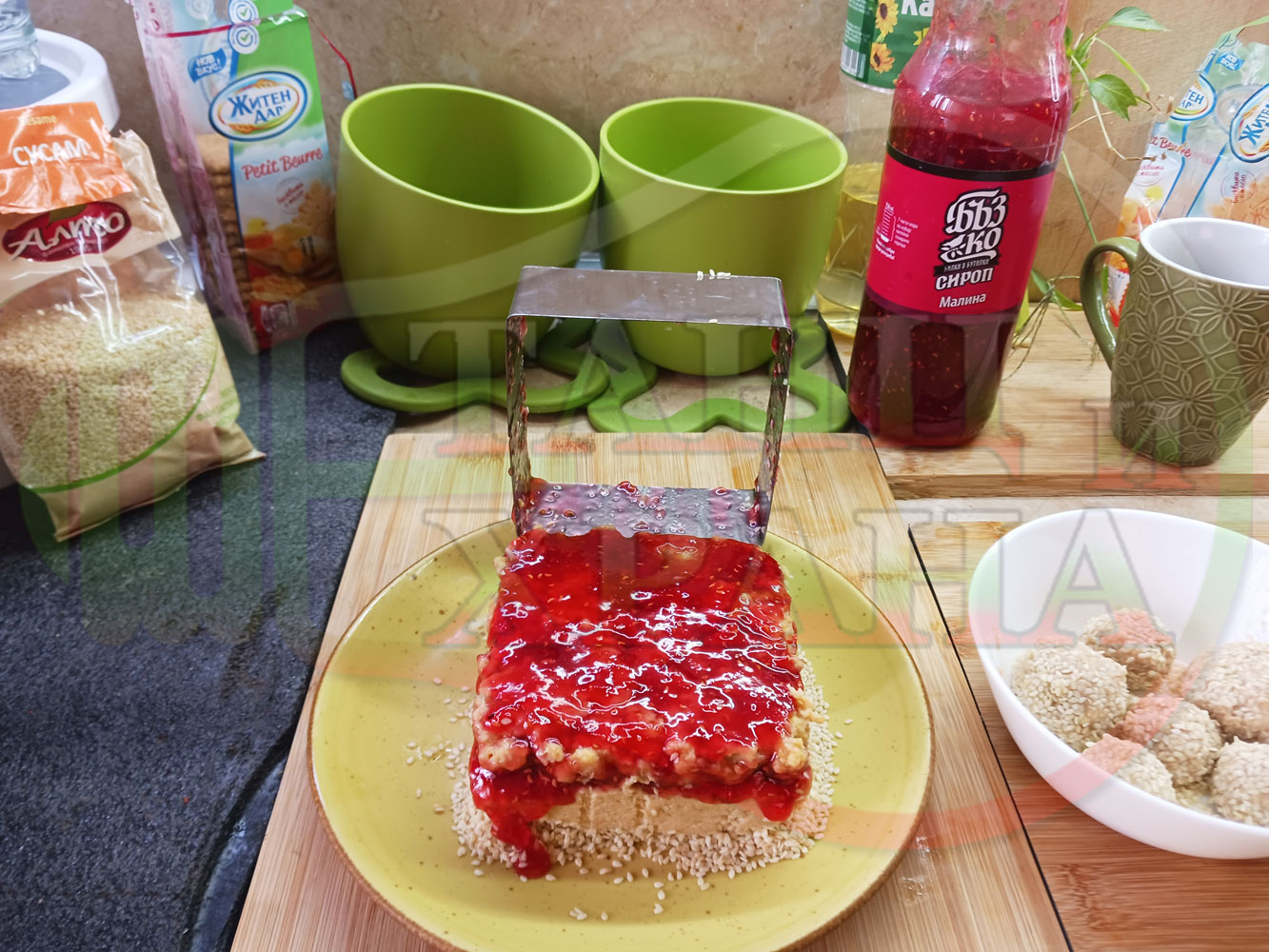 Намокрете металния ринг с вода, сипете сусама в средата на ринга и с ръце го "залепете" за вътрешната част на намокрения ринг. Напълнете ринга с бисквитеното тесто, загладете го, сипете малиновия сироп и го загладете с лъжица или шпатула (редувайте бисквитеното тесто с малиновия сироп според големината и формата на металния ринг (наредете колкото пласта пожелаете)).
