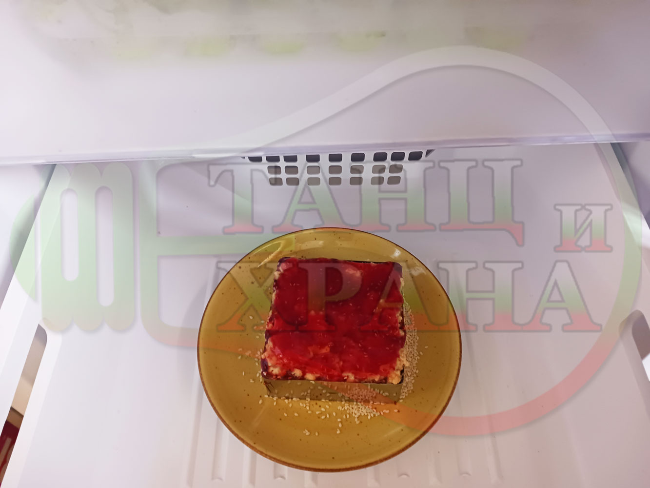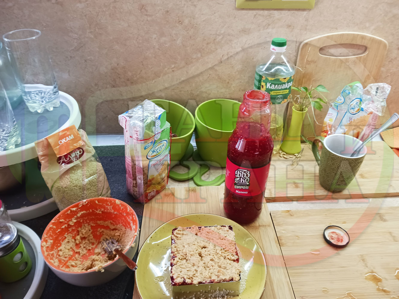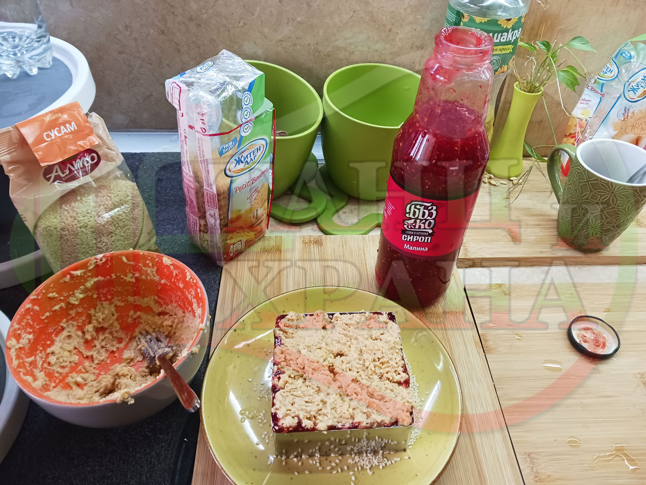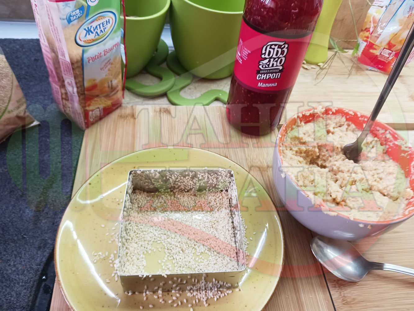 Намокрете металния ринг с вода, сипете сусама в средата на ринга и с ръце го "залепете" за вътрешната част на намокрения ринг. Напълнете ринга с бисквитеното тесто, загладете го, сипете малиновия сироп и го загладете с лъжица или шпатула (редувайте бисквитеното тесто с малиновия сироп според големината и формата на металния ринг (наредете колкото пласта пожелаете)).