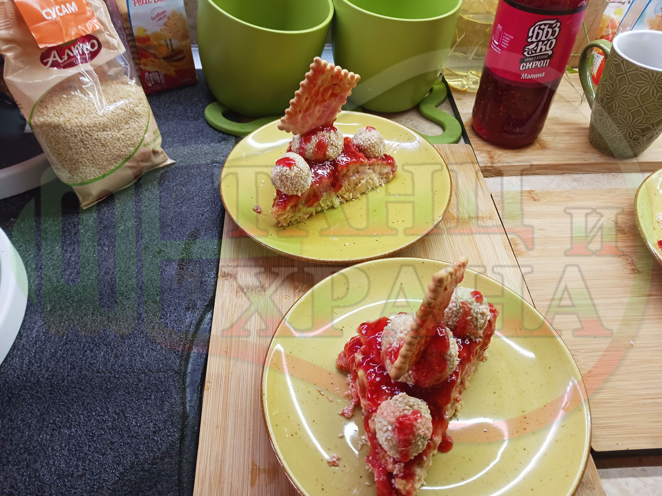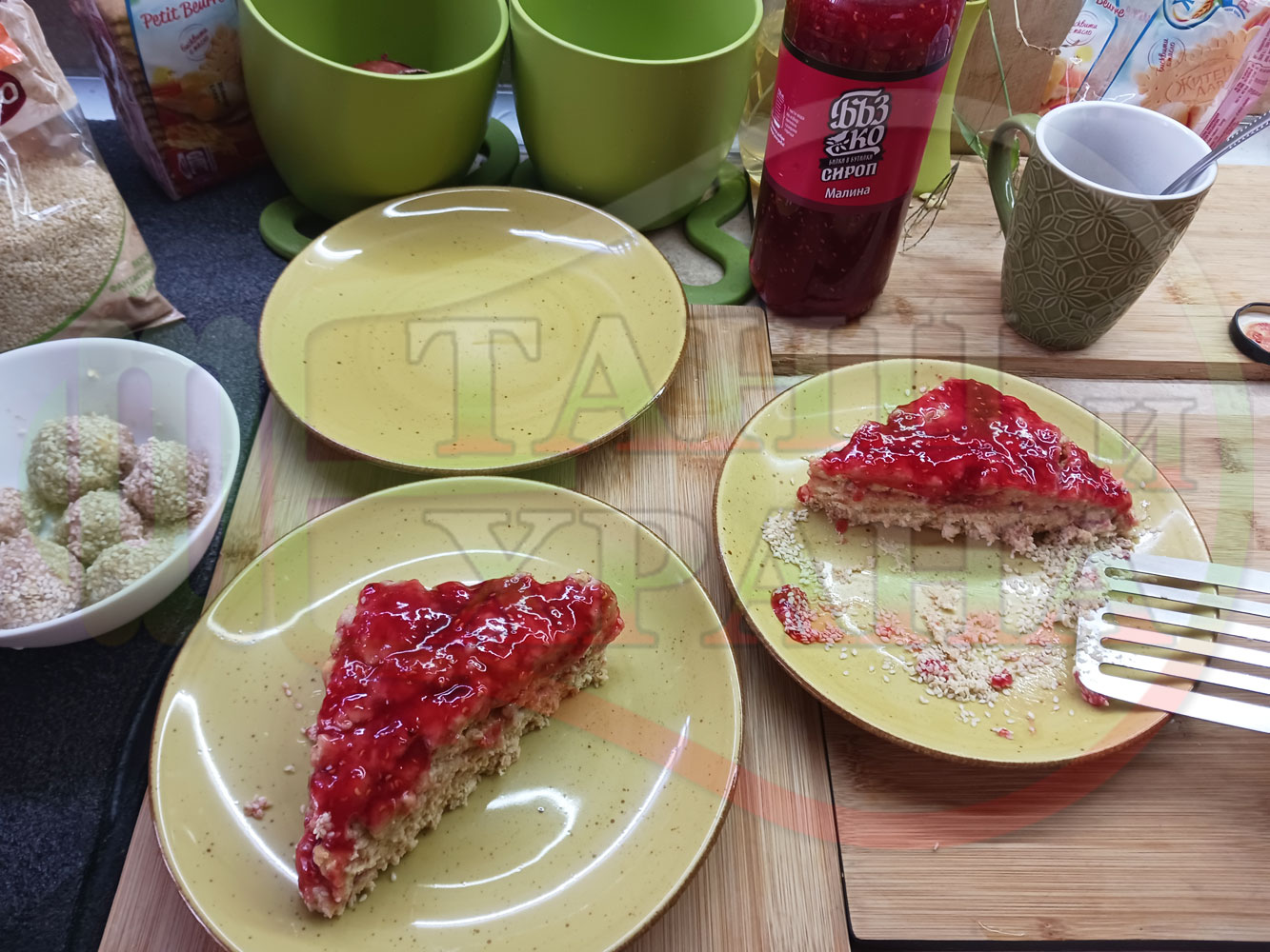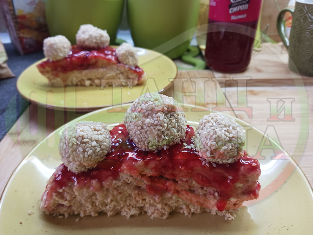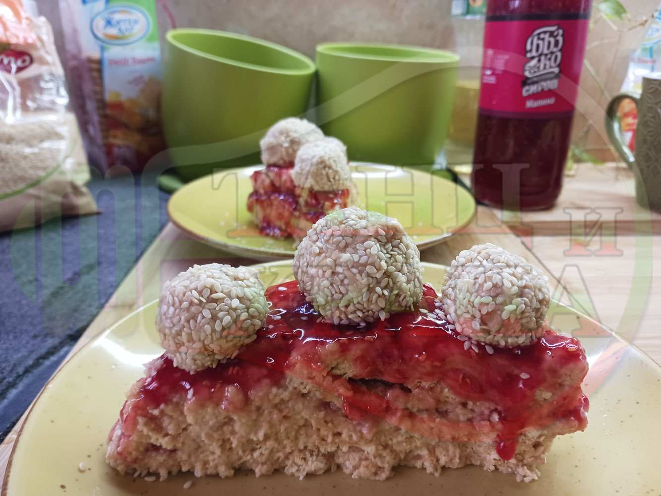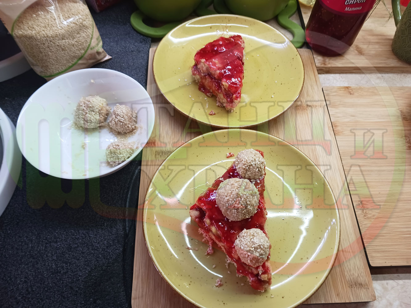 Спретнах изключително вкусна бисквитена торта с най-обичаните от мен плодове, макар и под формата на сироп. Оформих няколко малиново бисквитени трюфели със суров сусам и отново се получи невероятно вкусно, вкусна, вкусотия (вкуснотия)...
