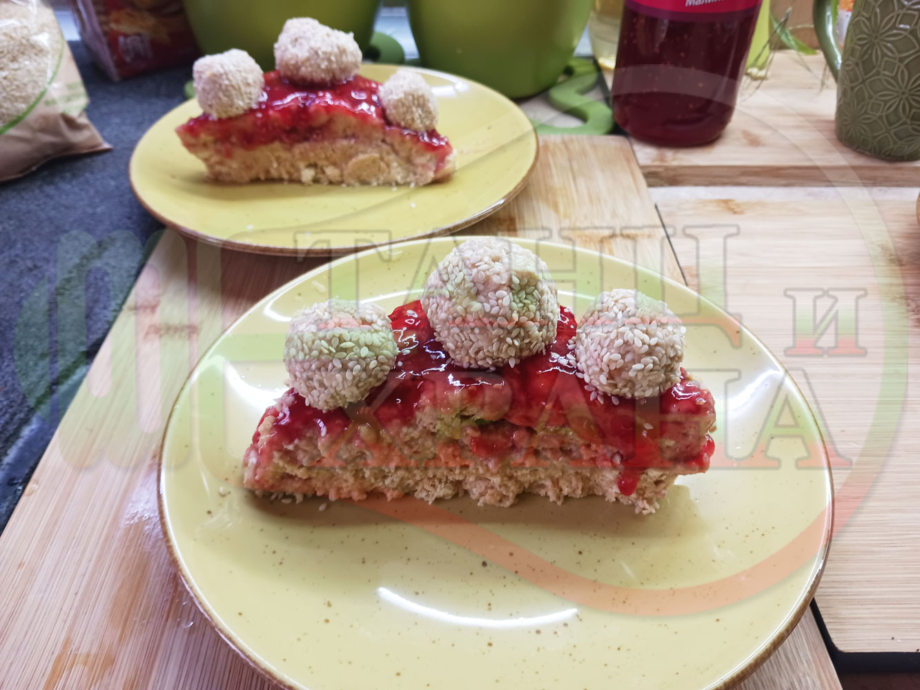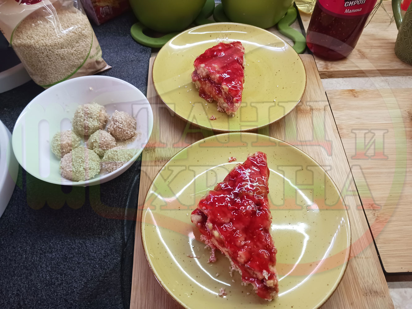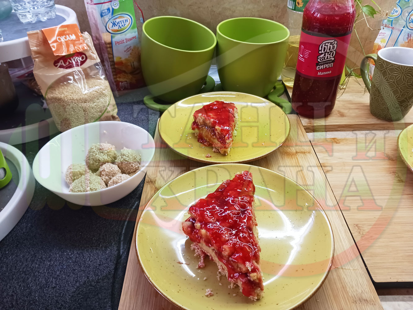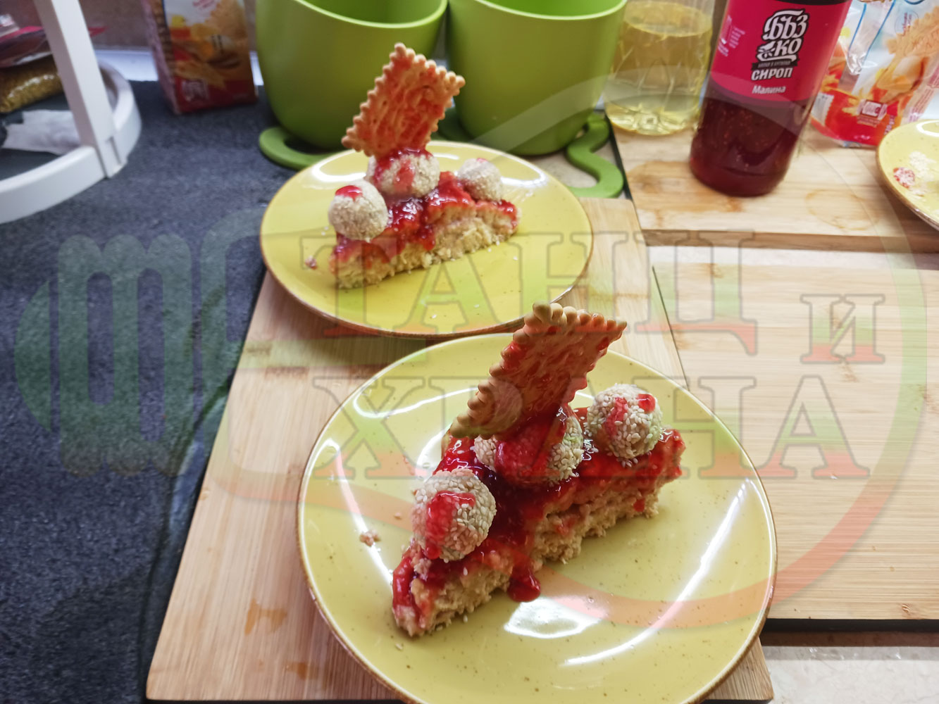 Спретнах изключително вкусна бисквитена торта с най-обичаните от мен плодове, макар и под формата на сироп. Оформих няколко малиново бисквитени трюфели със суров сусам и отново се получи невероятно вкусно, вкусна, вкусотия (вкуснотия)...
