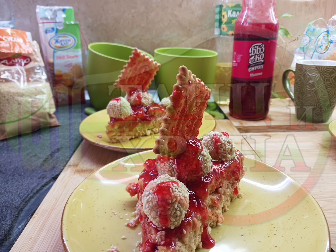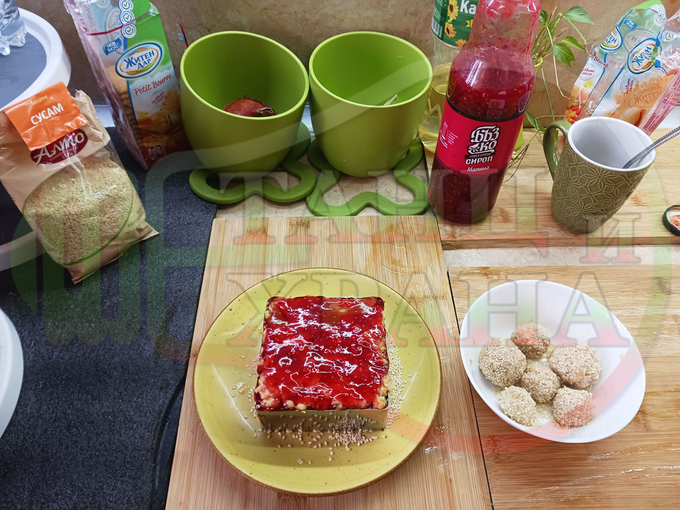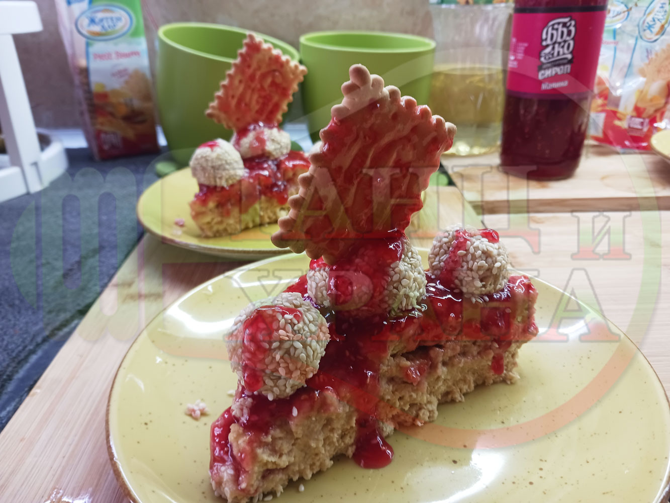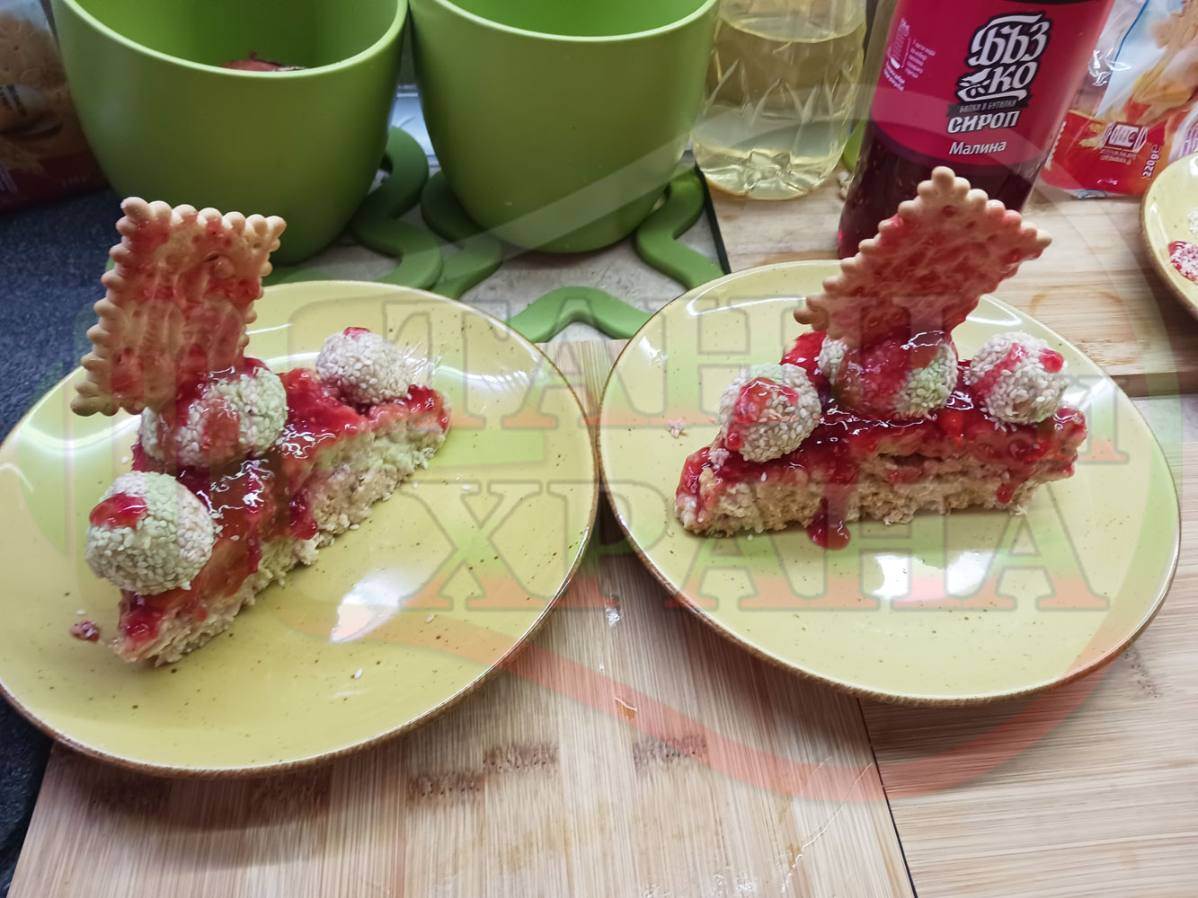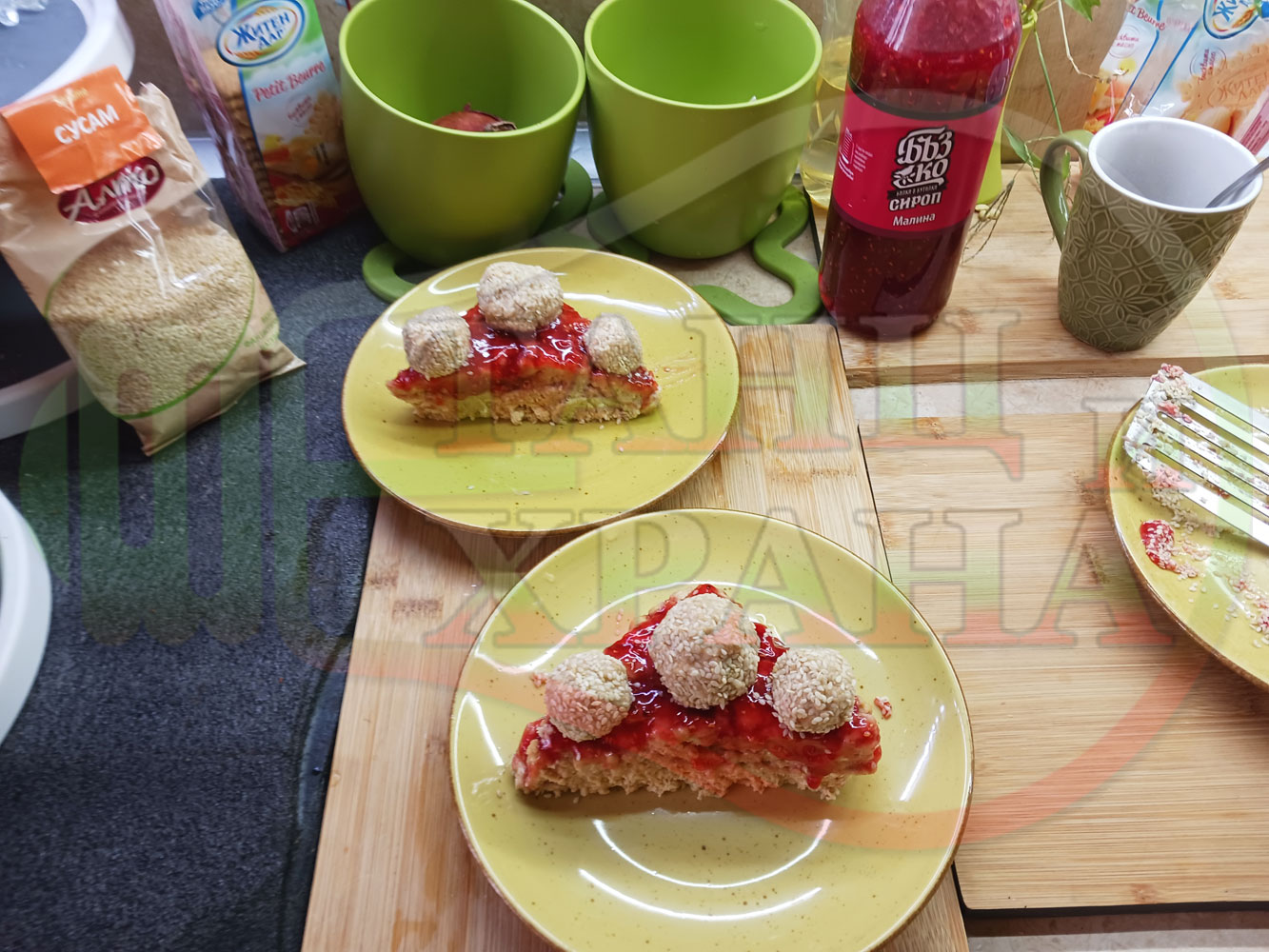 Спретнах изключително вкусна бисквитена торта с най-обичаните от мен плодове, макар и под формата на сироп. Оформих няколко малиново бисквитени трюфели със суров сусам и отново се получи невероятно вкусно, вкусна, вкусотия (вкуснотия)...