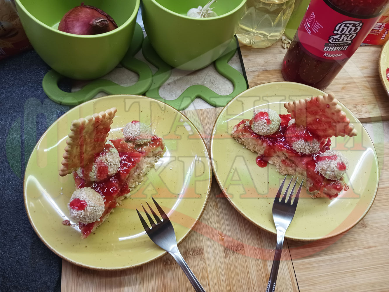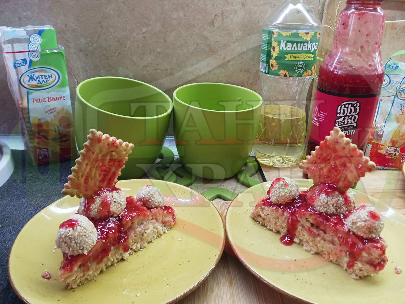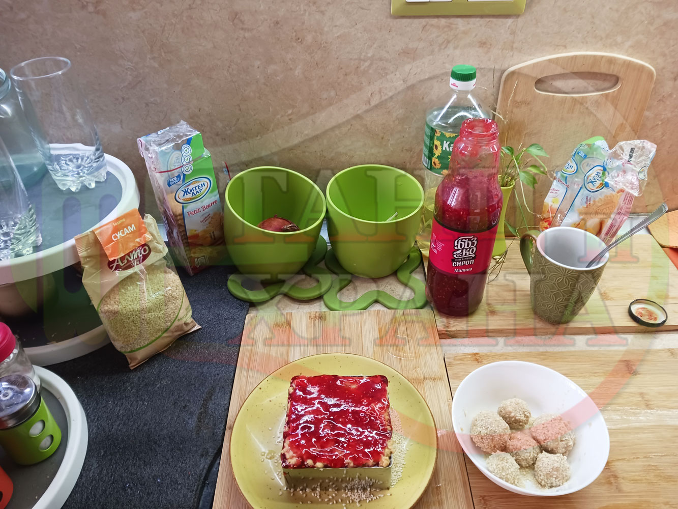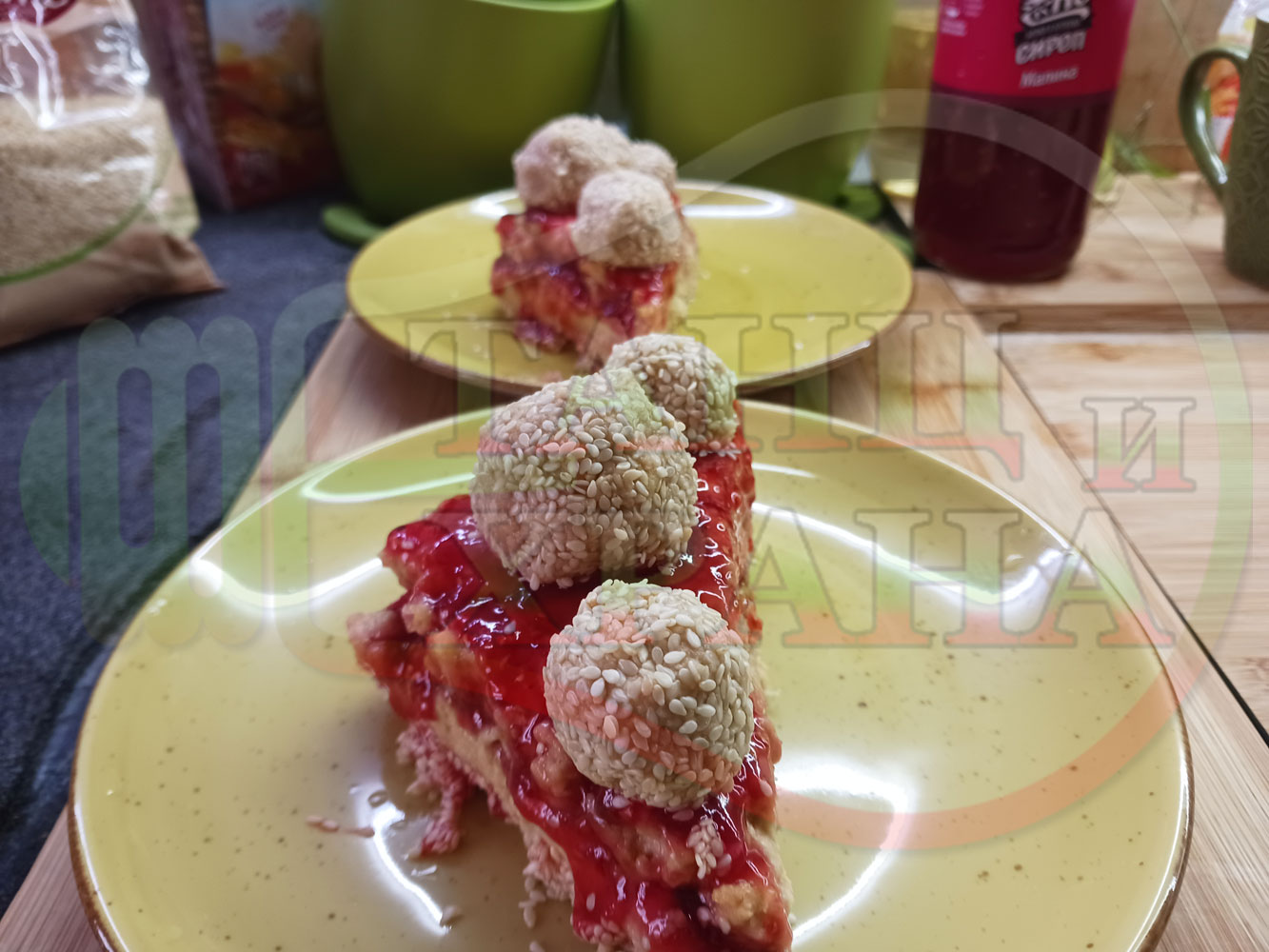 Спретнах изключително вкусна бисквитена торта с най-обичаните от мен плодове, макар и под формата на сироп. Оформих няколко малиново бисквитени трюфели със суров сусам и отново се получи невероятно вкусно, вкусна, вкусотия (вкуснотия)...