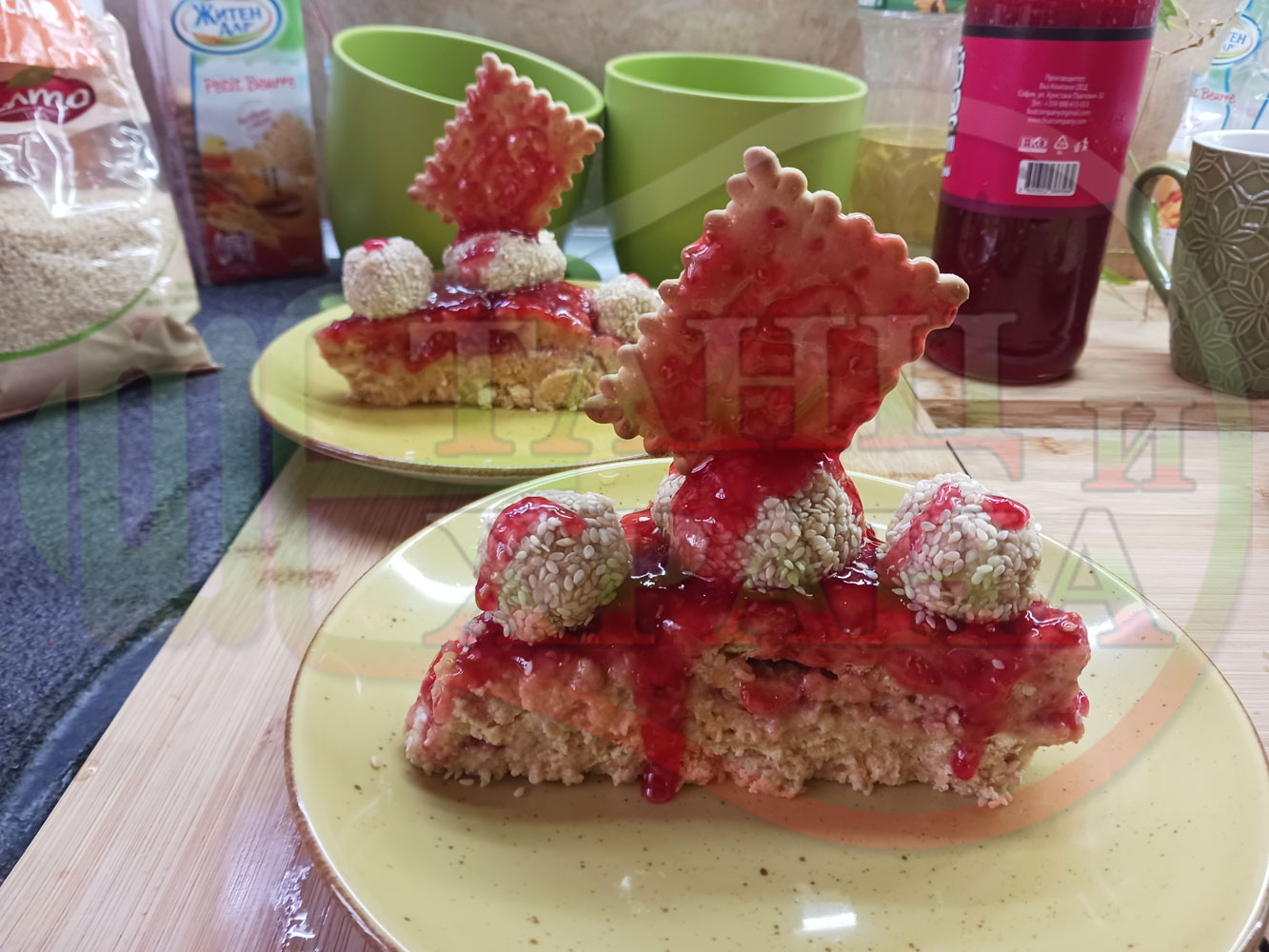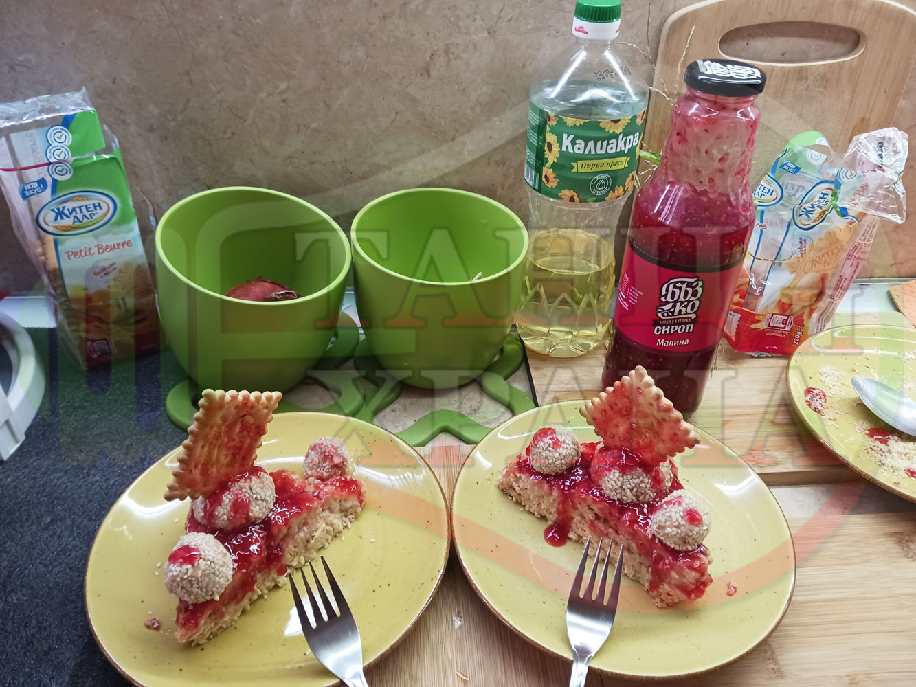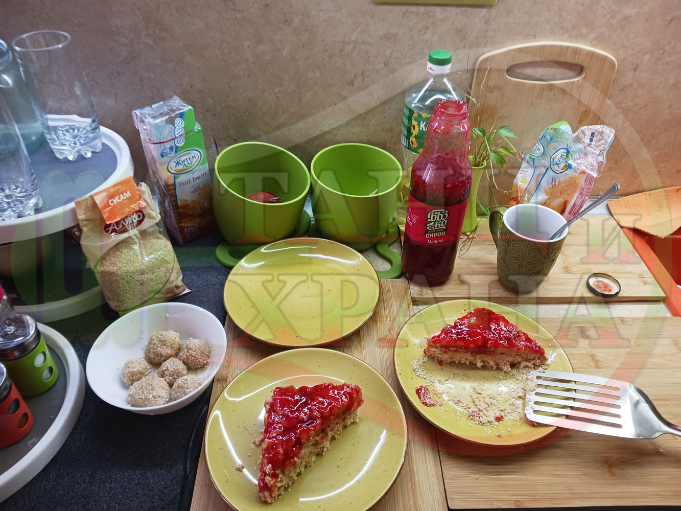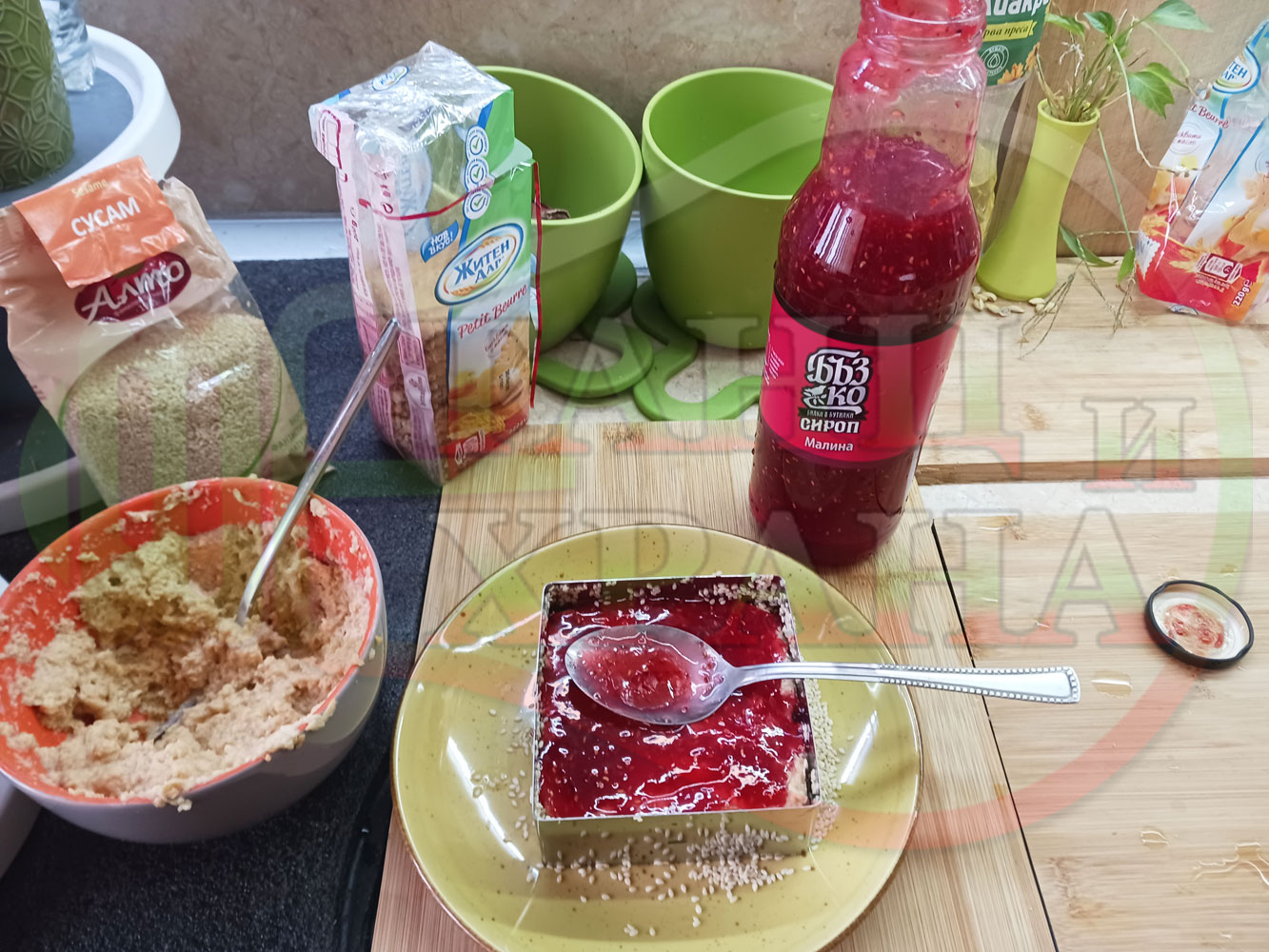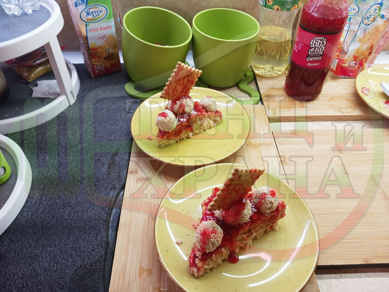 Спретнах изключително вкусна бисквитена торта с най-обичаните от мен плодове, макар и под формата на сироп. Оформих няколко малиново бисквитени трюфели със суров сусам и отново се получи невероятно вкусно, вкусна, вкусотия (вкуснотия)...