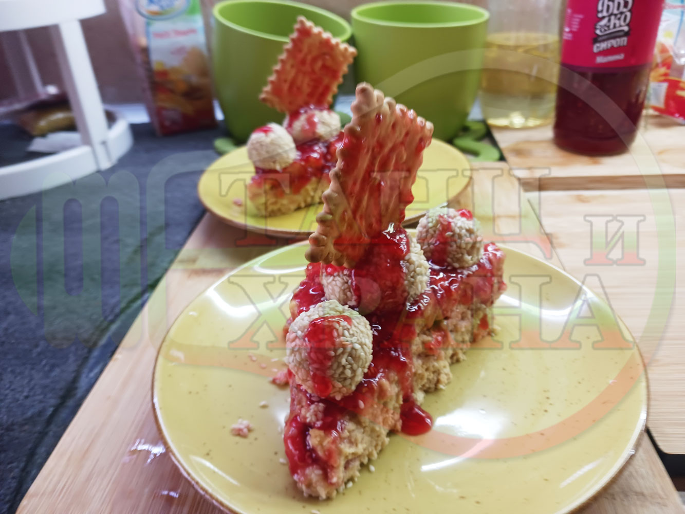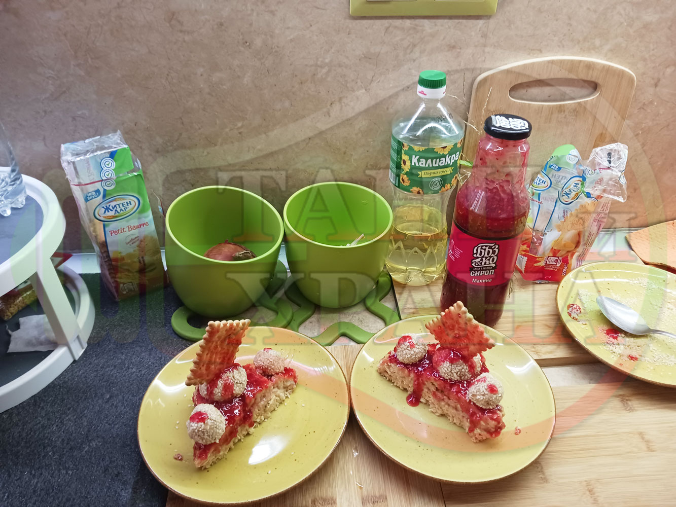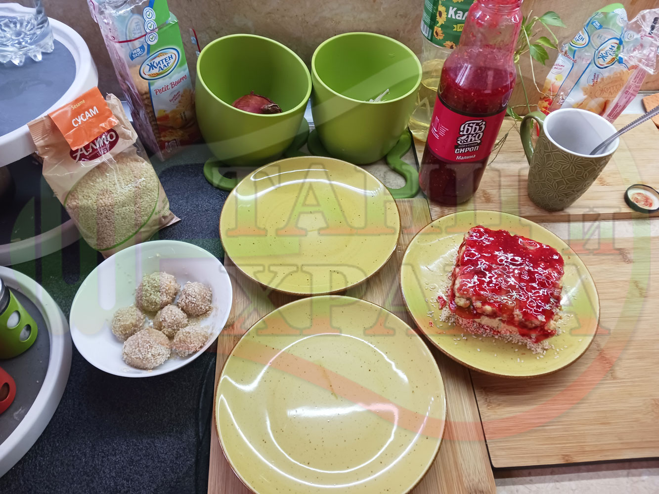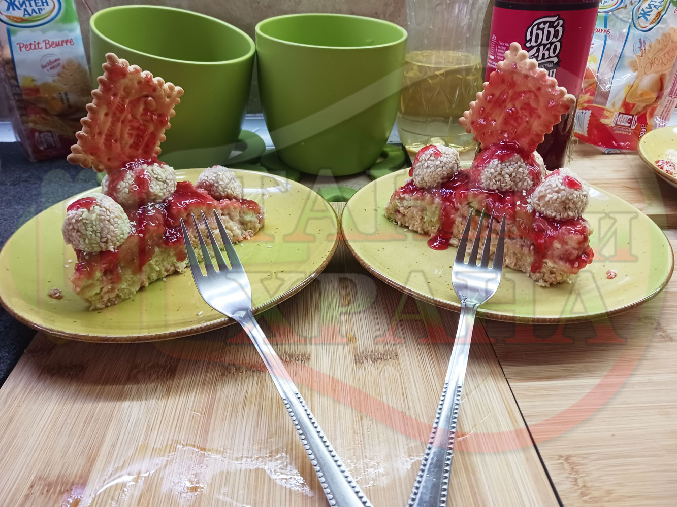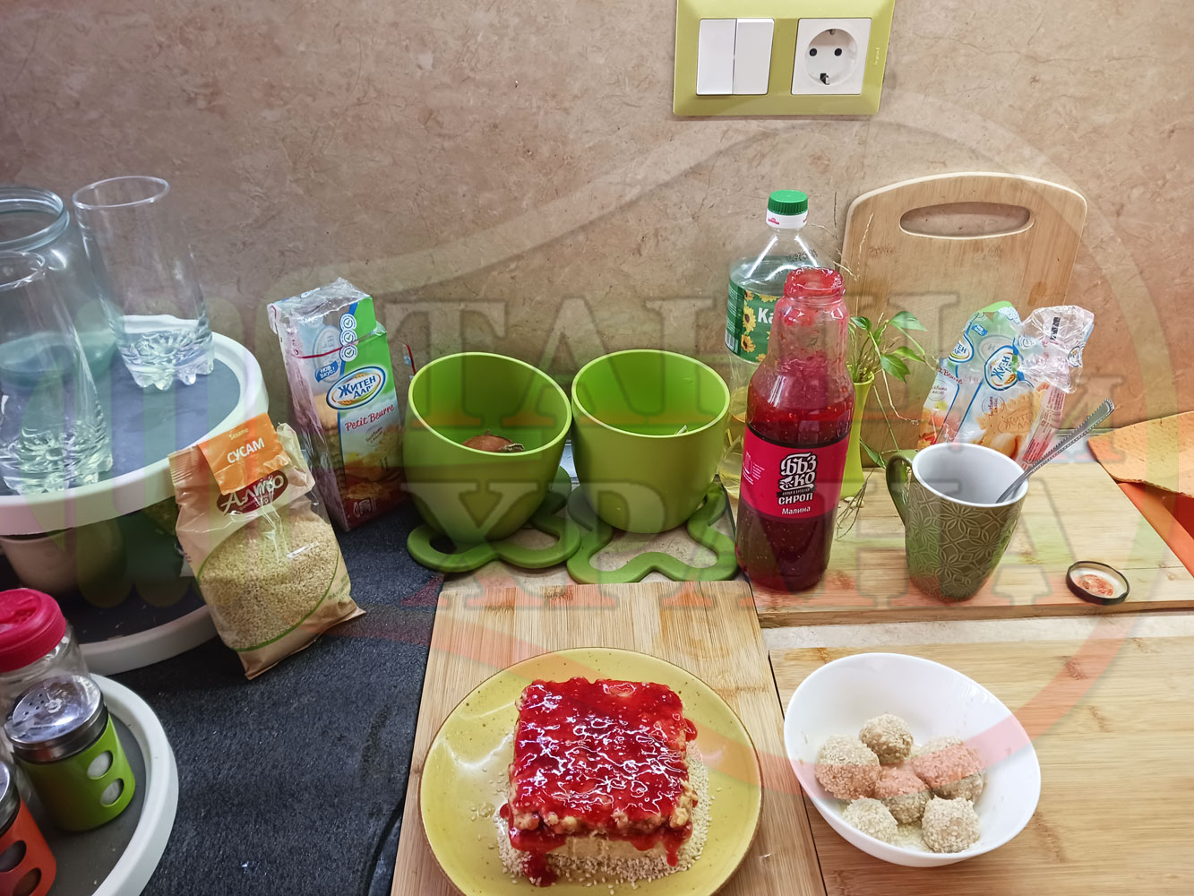 Спретнах изключително вкусна бисквитена торта с най-обичаните от мен плодове, макар и под формата на сироп. Оформих няколко малиново бисквитени трюфели със суров сусам и отново се получи невероятно вкусно, вкусна, вкусотия (вкуснотия)...