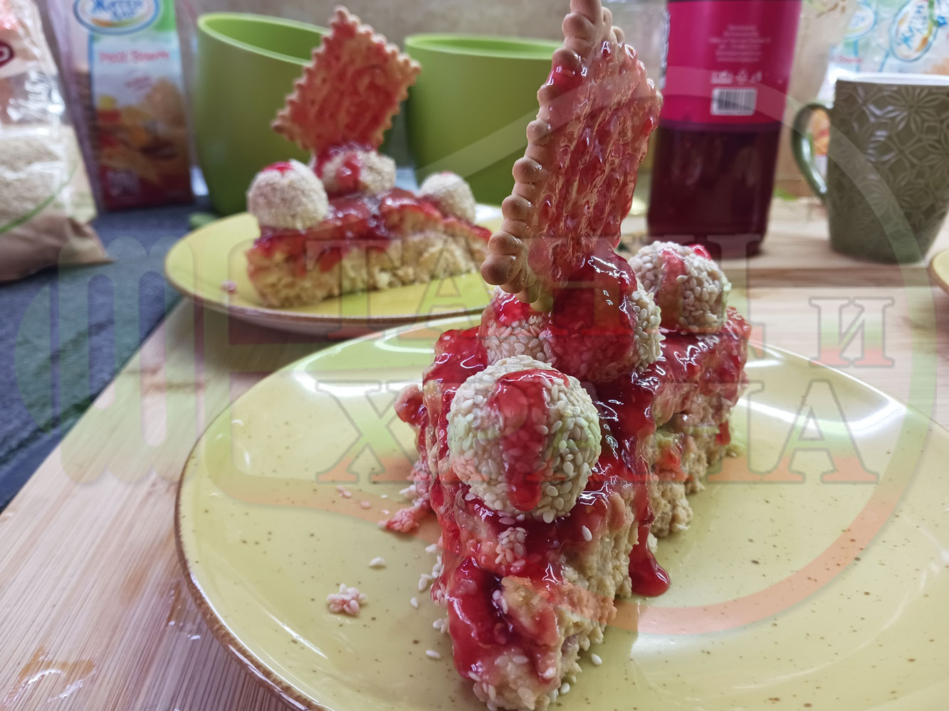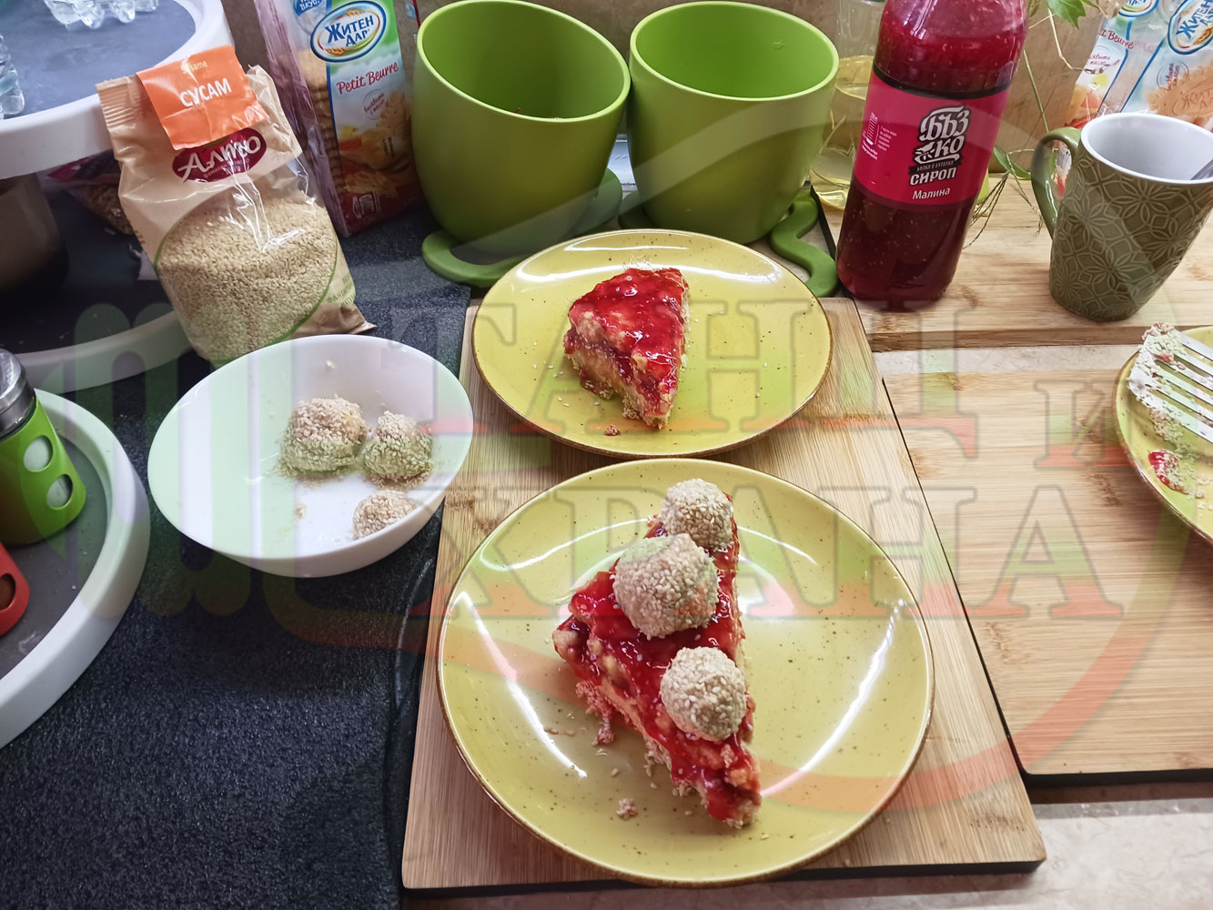 Бисквитена плодова млечна мини торта "Малиновосиропена прясномлечна топчестосусамова" приготвена с обикновени бисквити с масло, малинов сироп и прясно мляко гарнирана с бисквитени трюфели със суров сусам