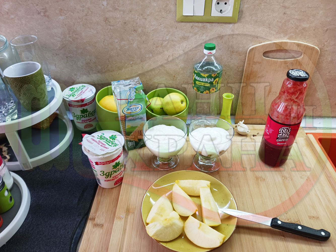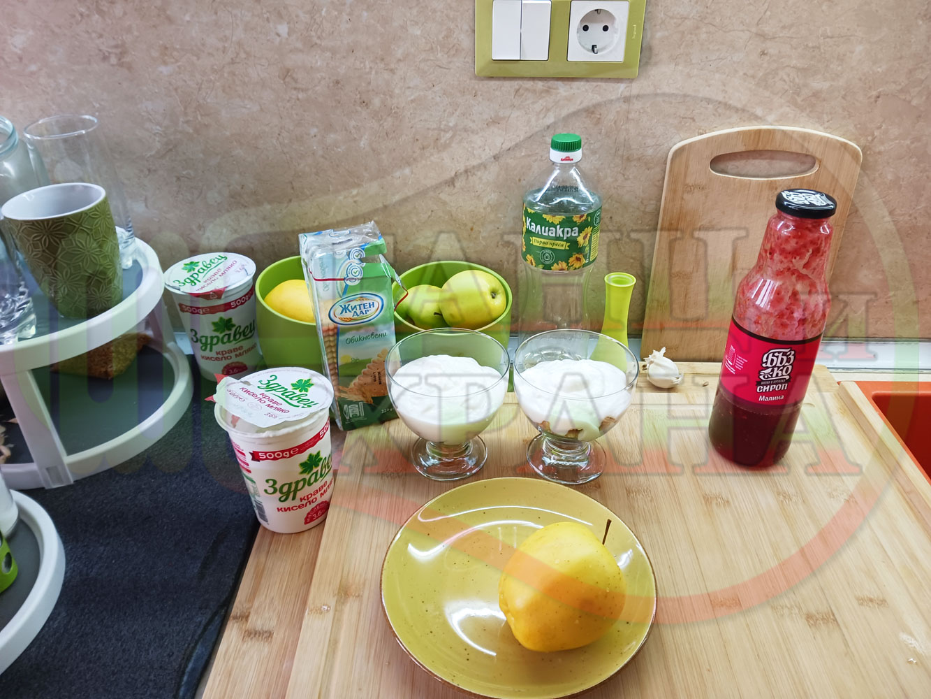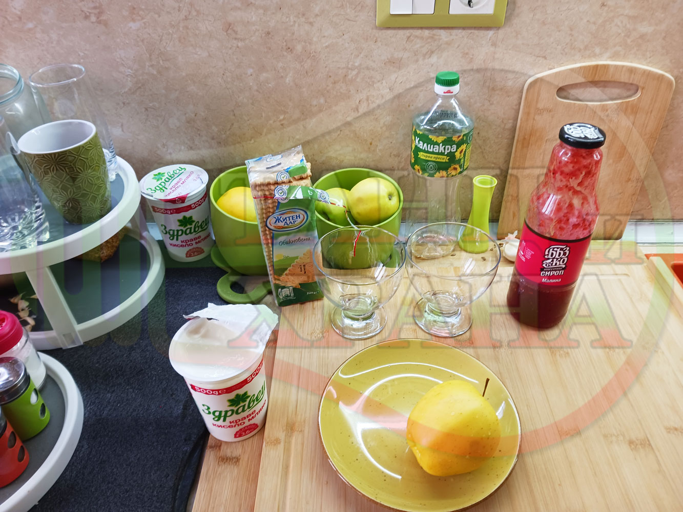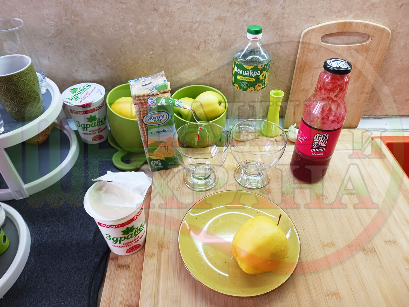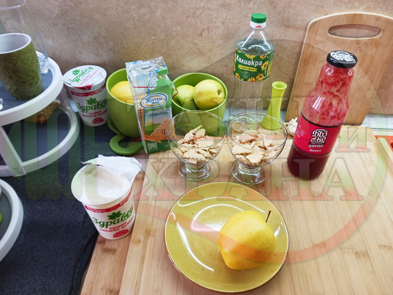 ПРОДУКТИ: Приблизителни количества за бисквитен плодов млечен десерт "Ябълков малиновосиропен киселомлечен" приготвен с обикновени бисквити, кисело мляко от България и пресни, жълти ябълки гарниран с малинов сироп
