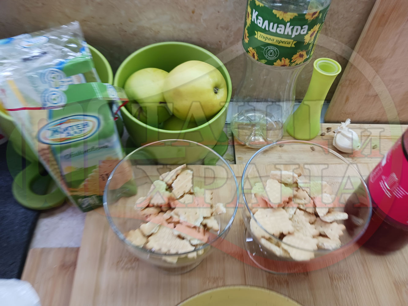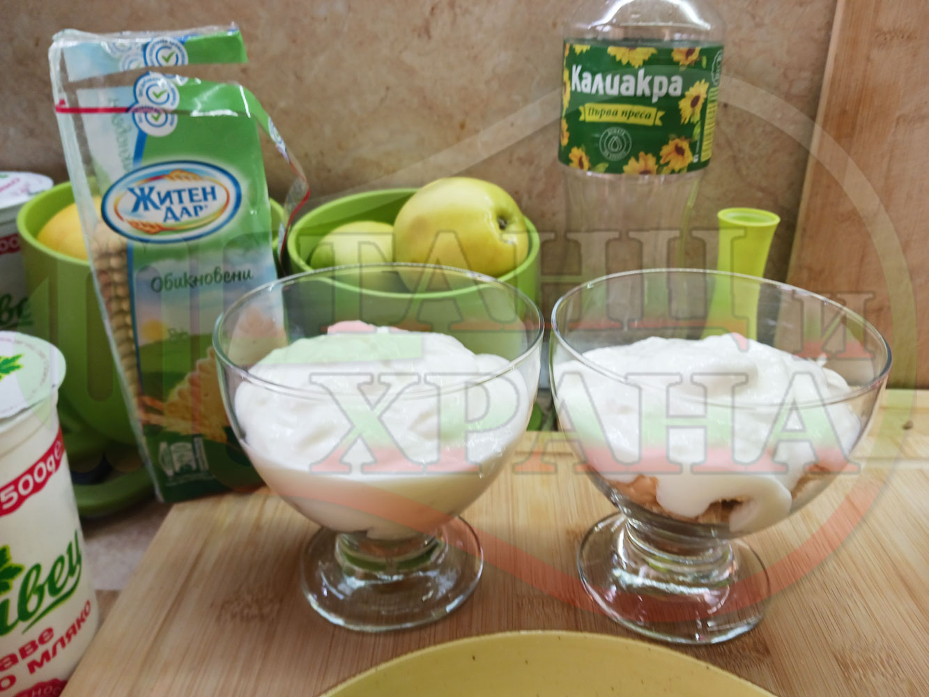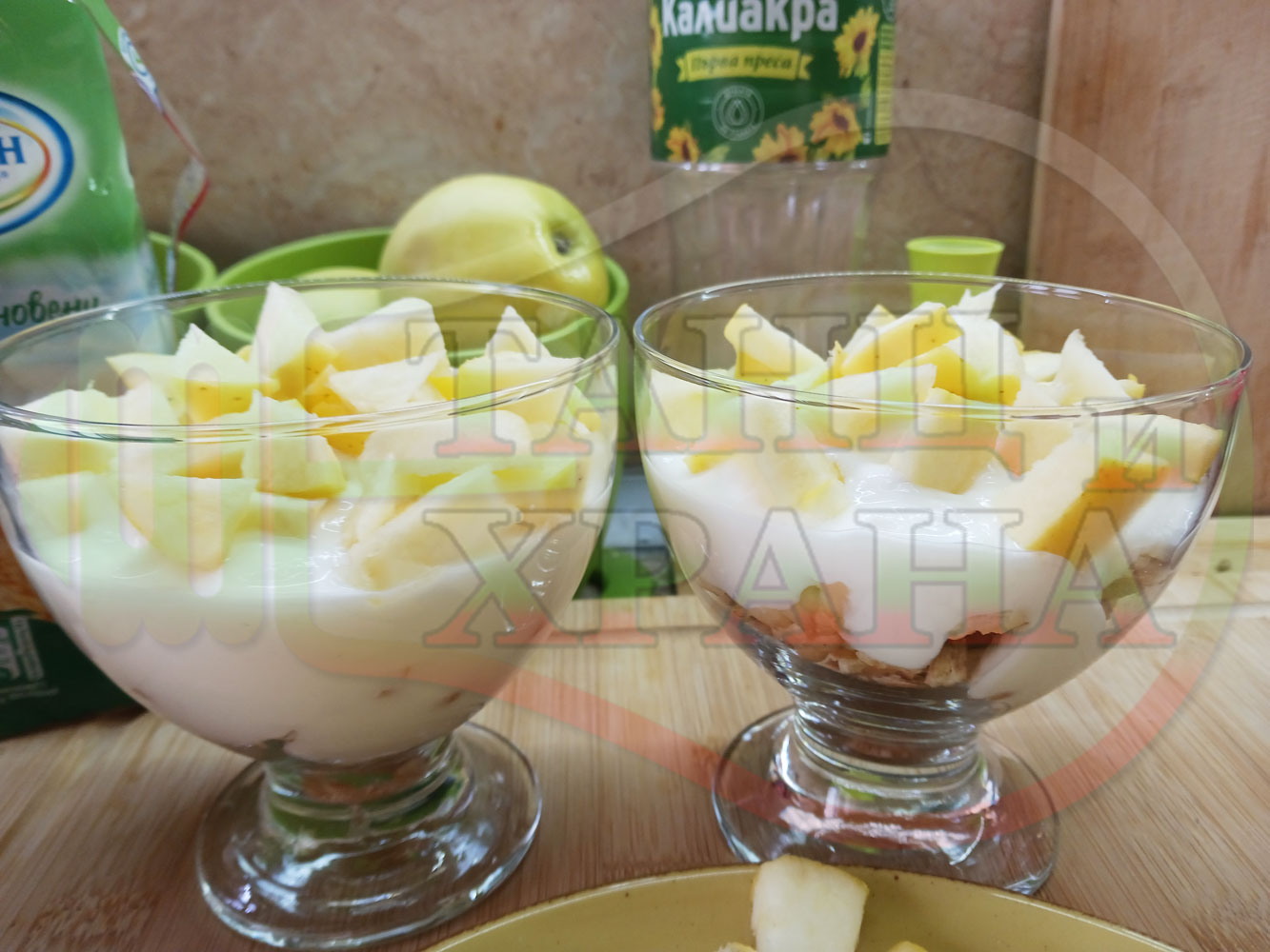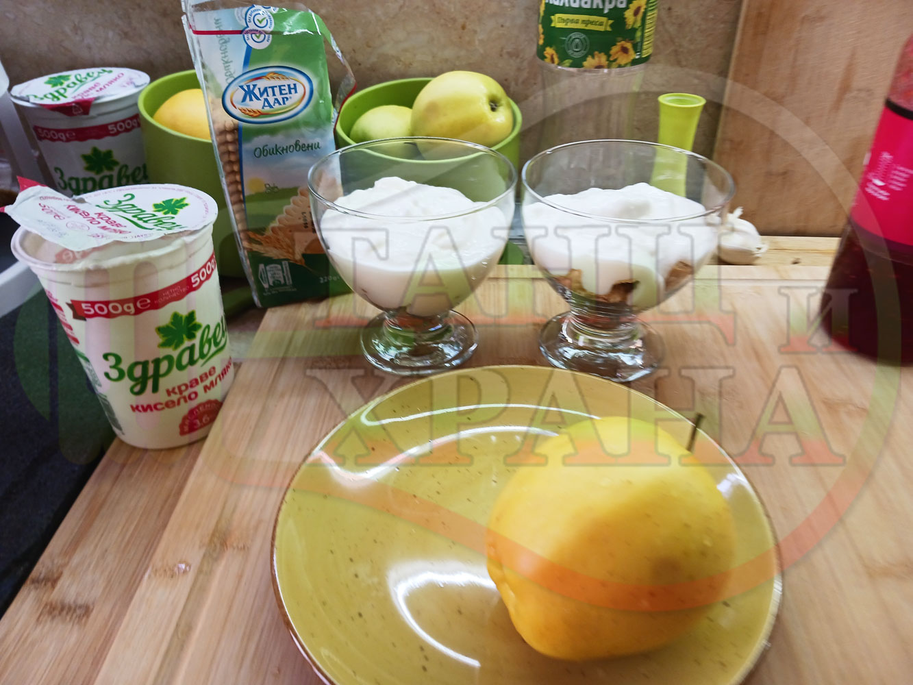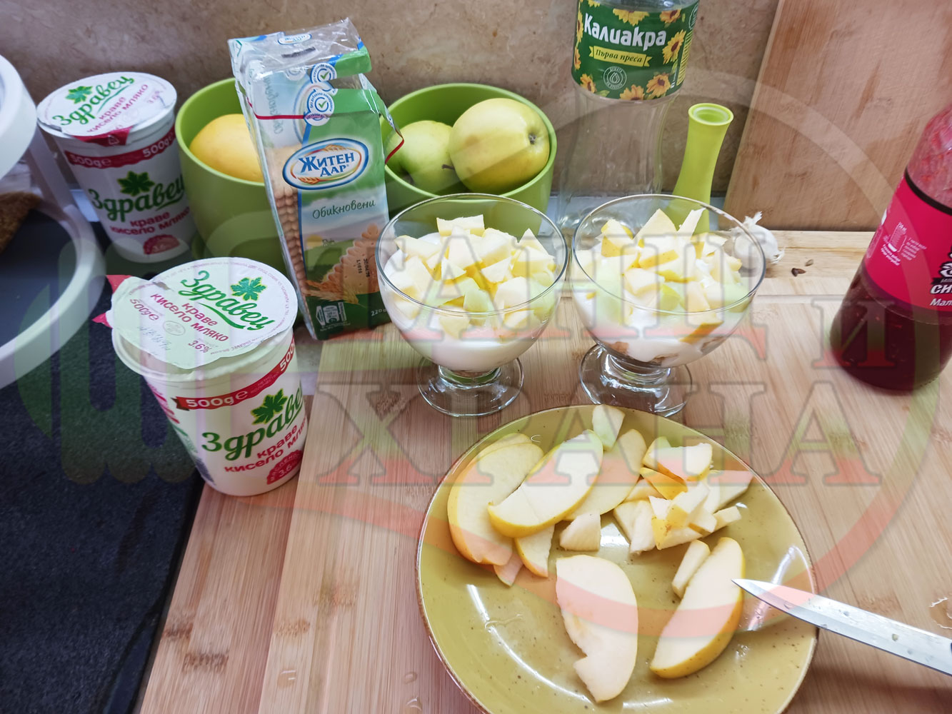 Начупете по 10 бисквити на малки парченца в стъклени чаши и сипете по 250 грама българско кисело мляко върху бисквитите. Измийте, почистете ябълката от семките и твърдата вътрешна част и я нарежете на малки парченца (нарежете част от ябълката на резени за украса). Разпределете нарязаните парченца ябълка върху киселото мляко във всяка чаша (или оформете произволни фигури с парченцата ябълка).