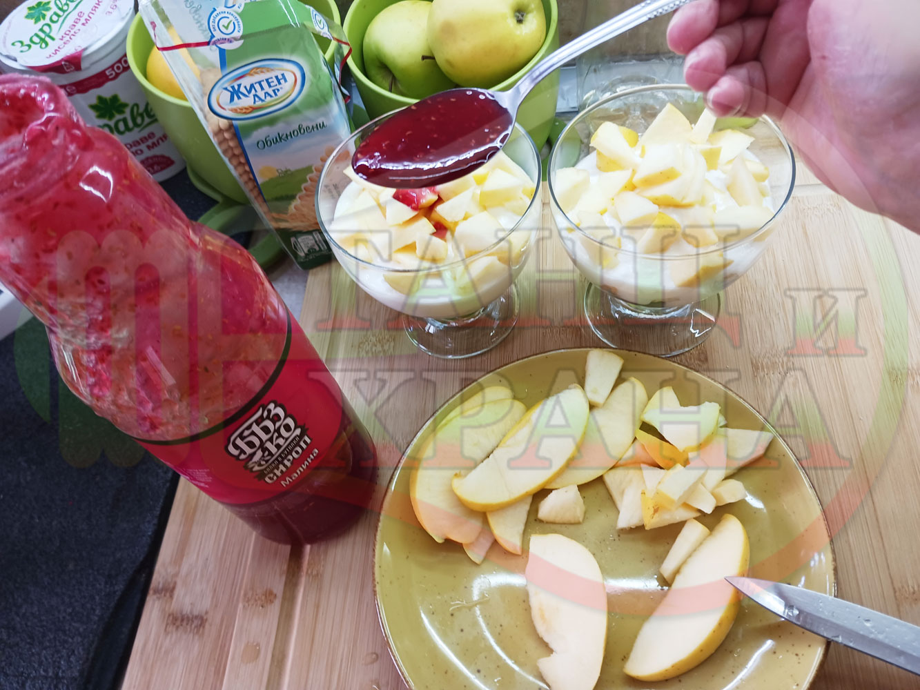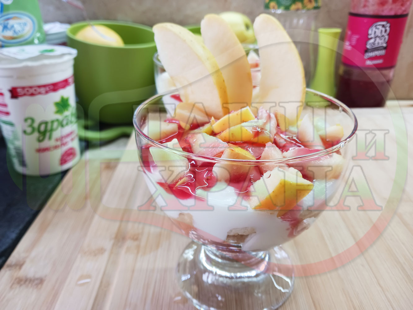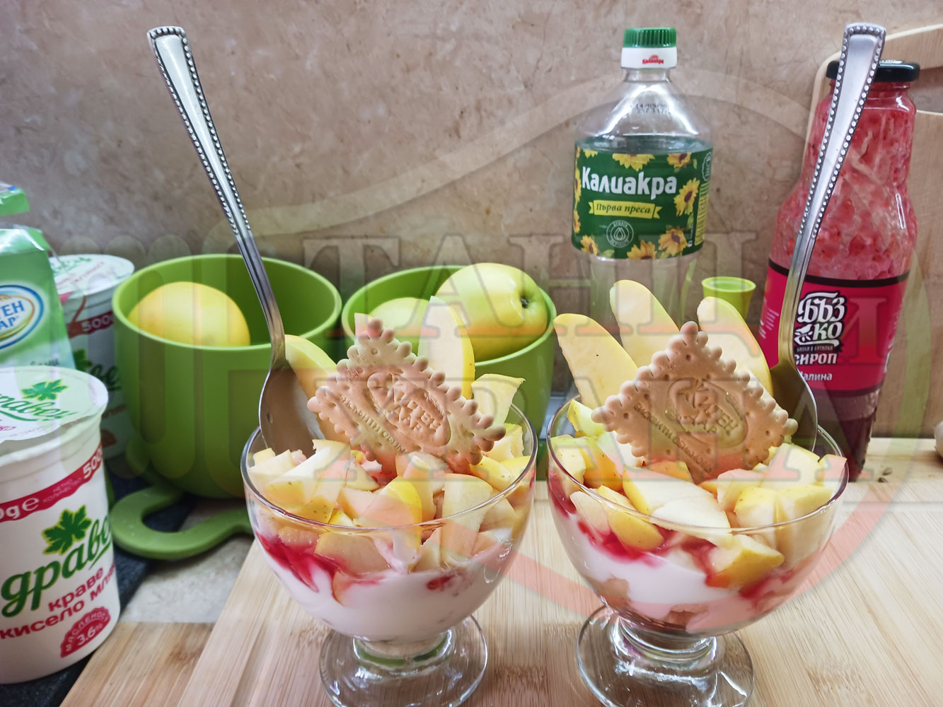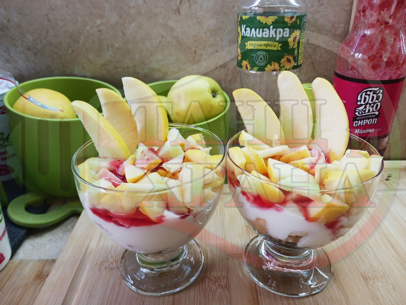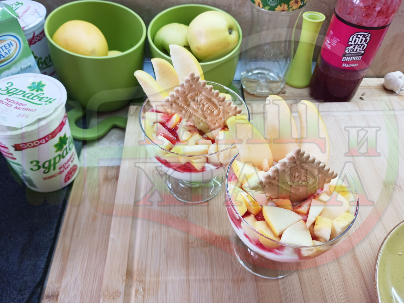 Бисквитен плодов млечен десерт "Ябълков малиновосиропен киселомлечен" приготвен с обикновени бисквити, кисело мляко от България и пресни, жълти ябълки гарниран с малинов сироп