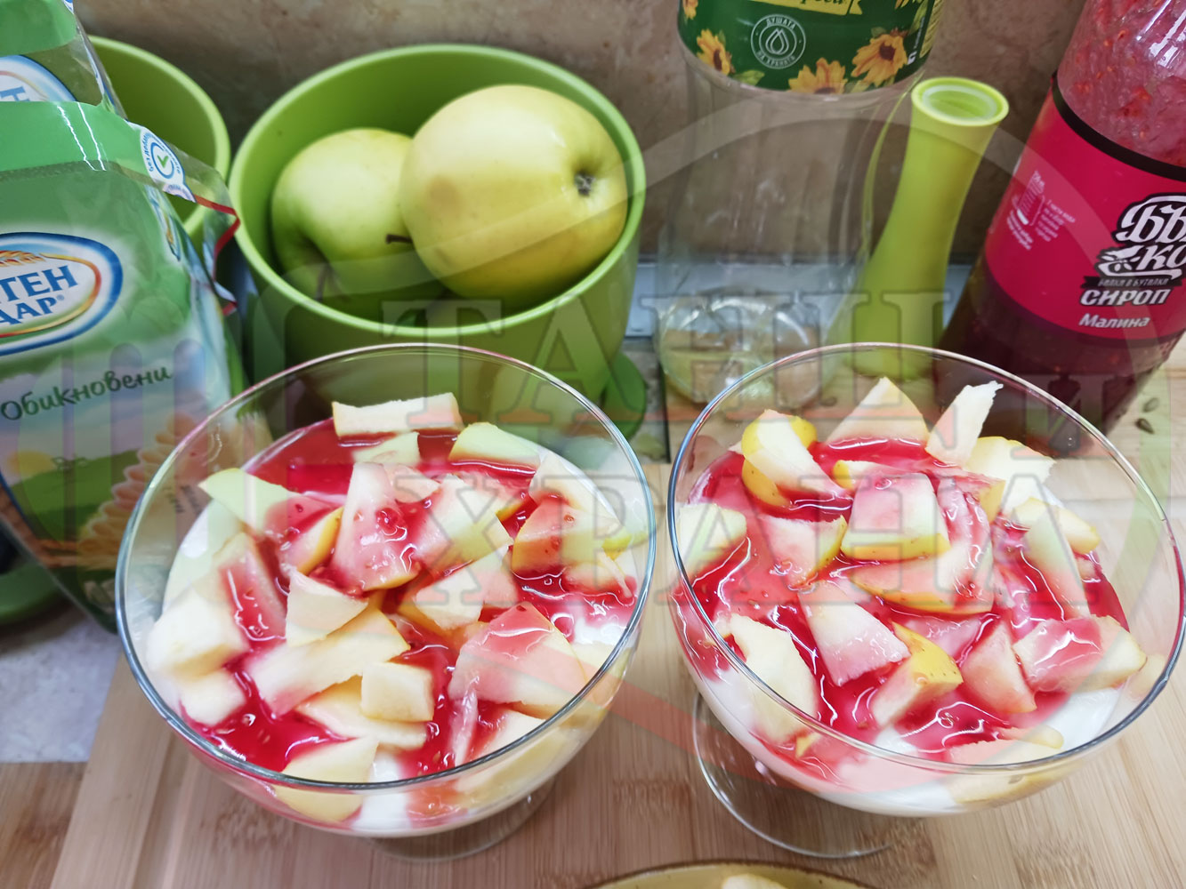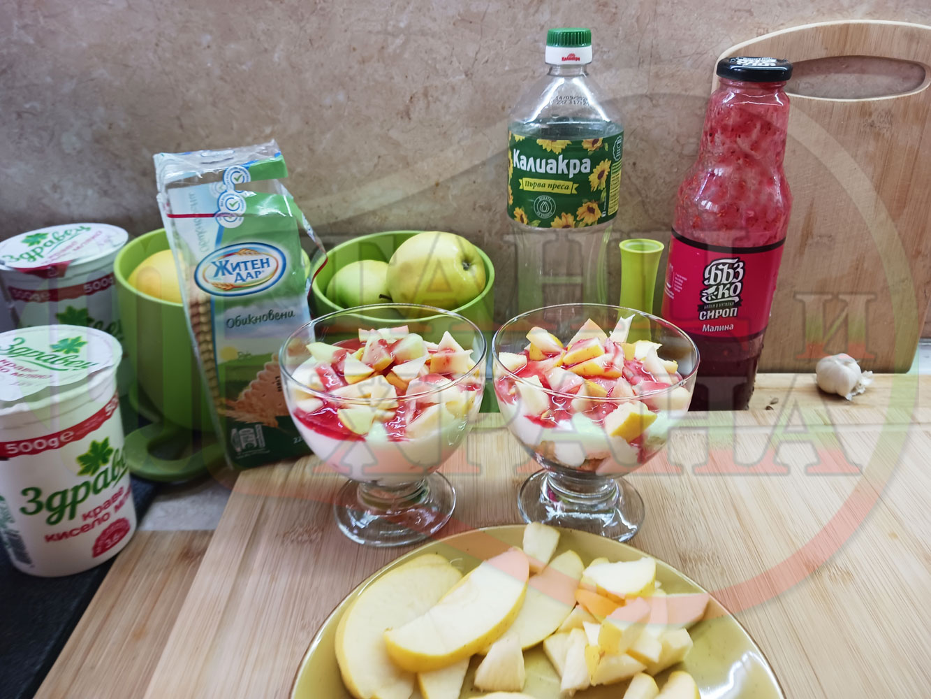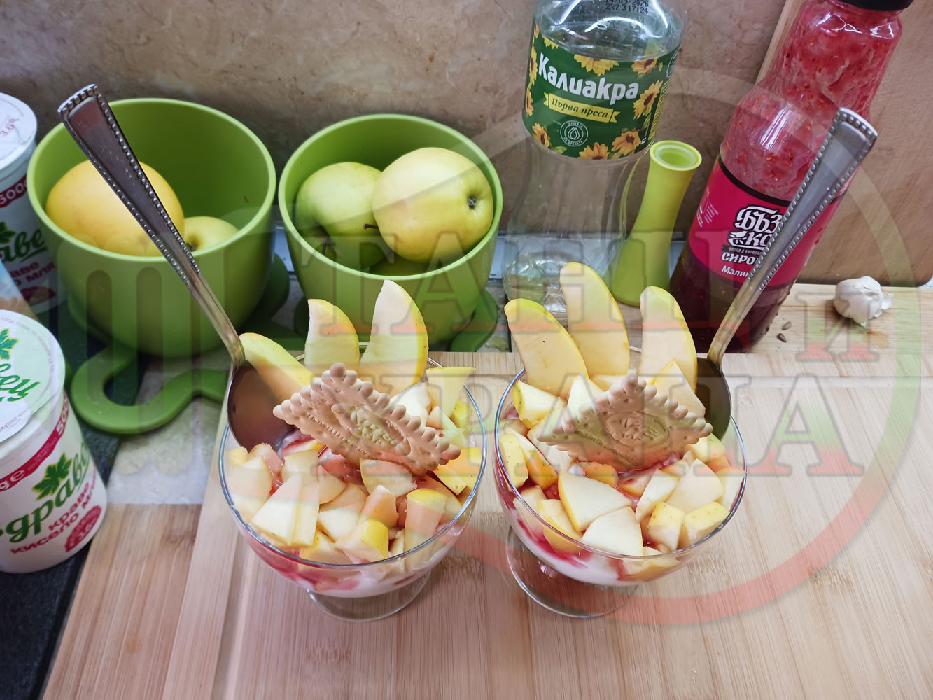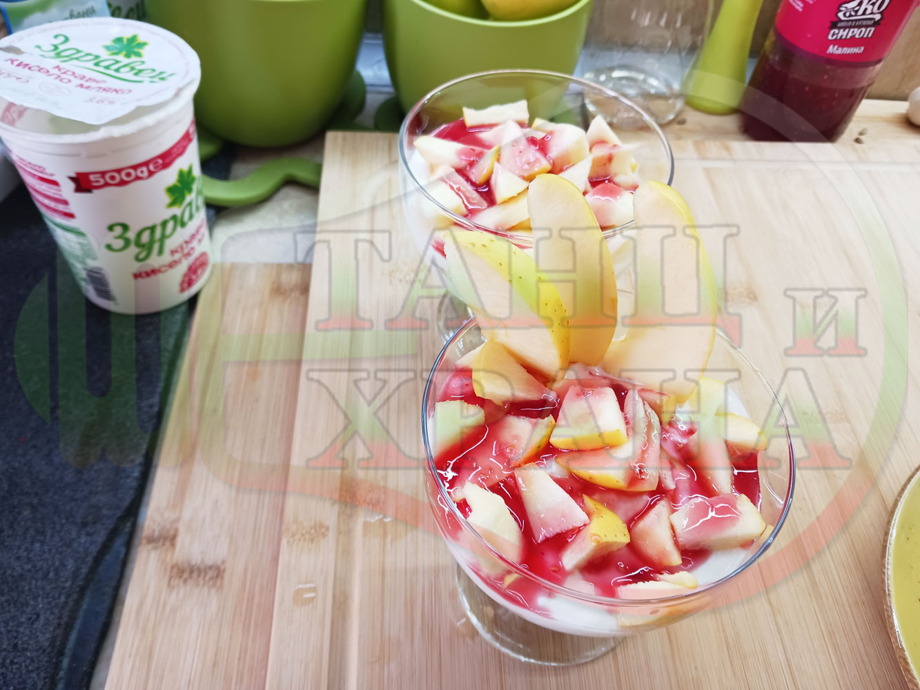 Бисквитен плодов млечен десерт "Ябълков малиновосиропен киселомлечен" приготвен с обикновени бисквити, кисело мляко от България и пресни, жълти ябълки гарниран с малинов сироп