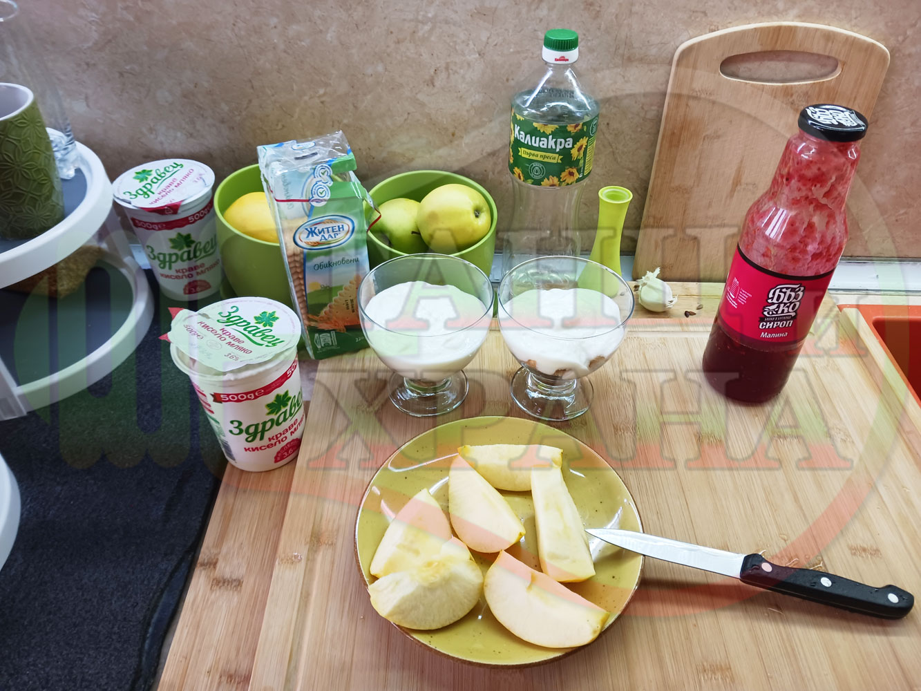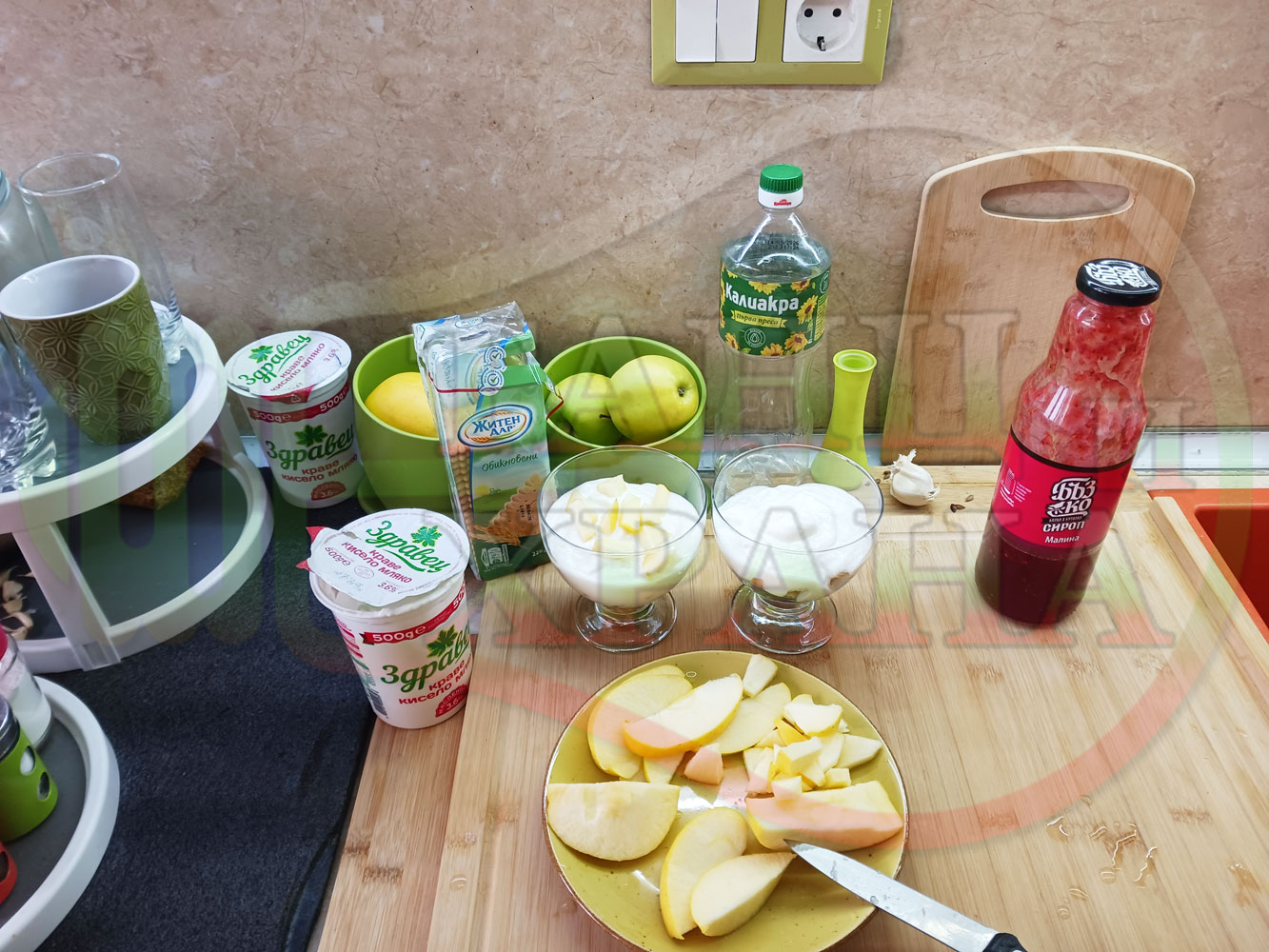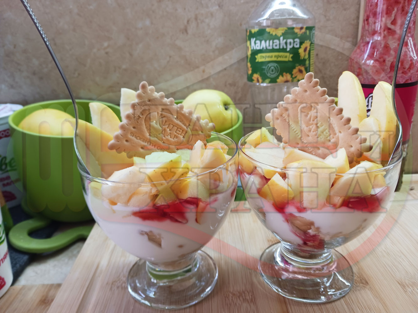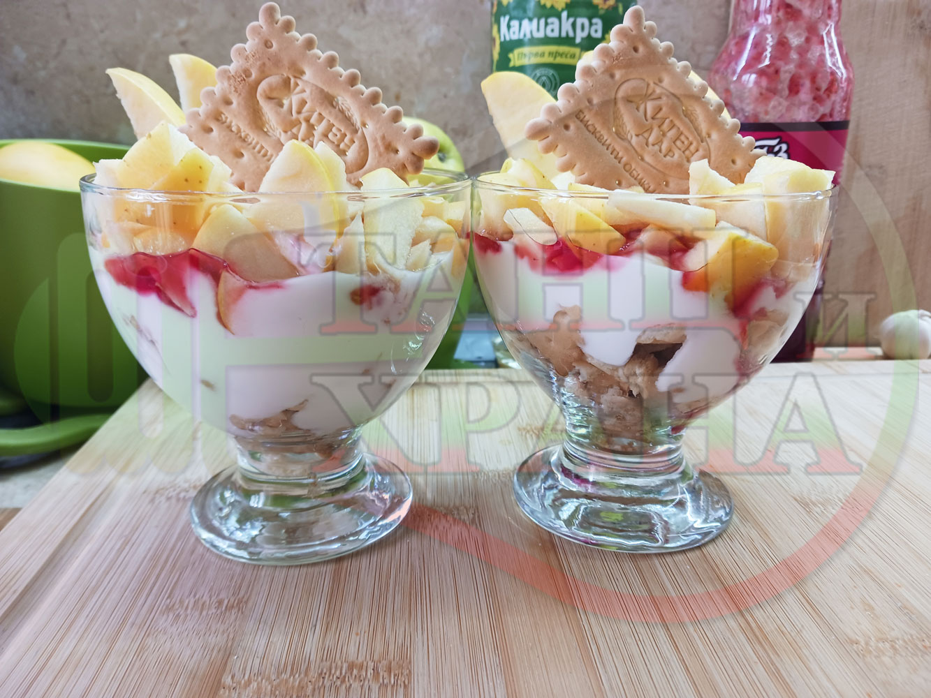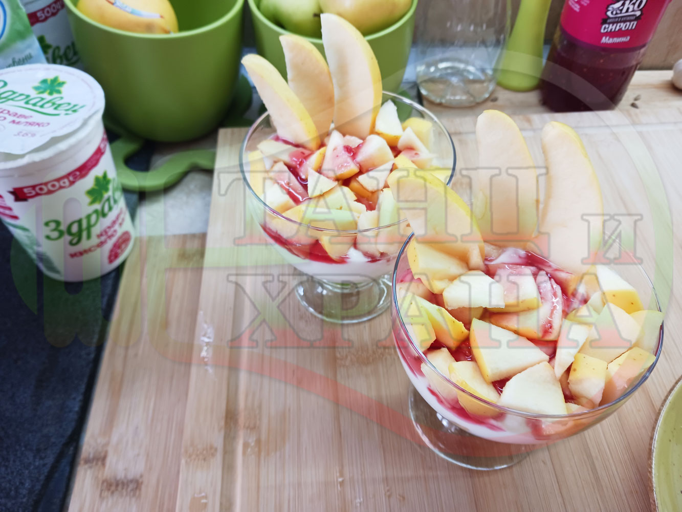 Бисквитен плодов млечен десерт "Ябълков малиновосиропен киселомлечен" приготвен с обикновени бисквити, кисело мляко от България и пресни, жълти ябълки гарниран с малинов сироп