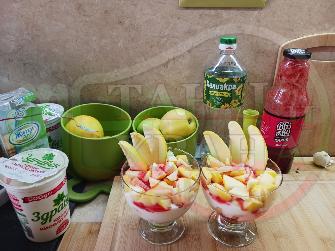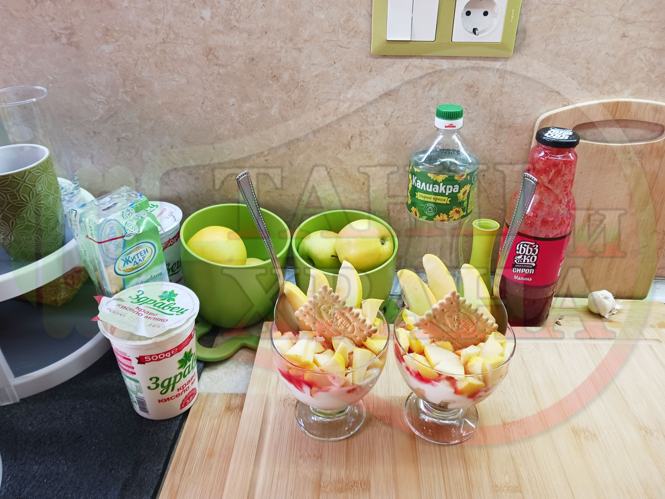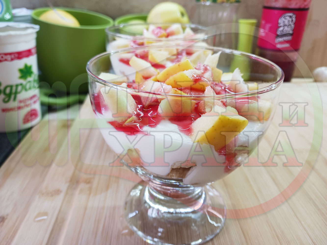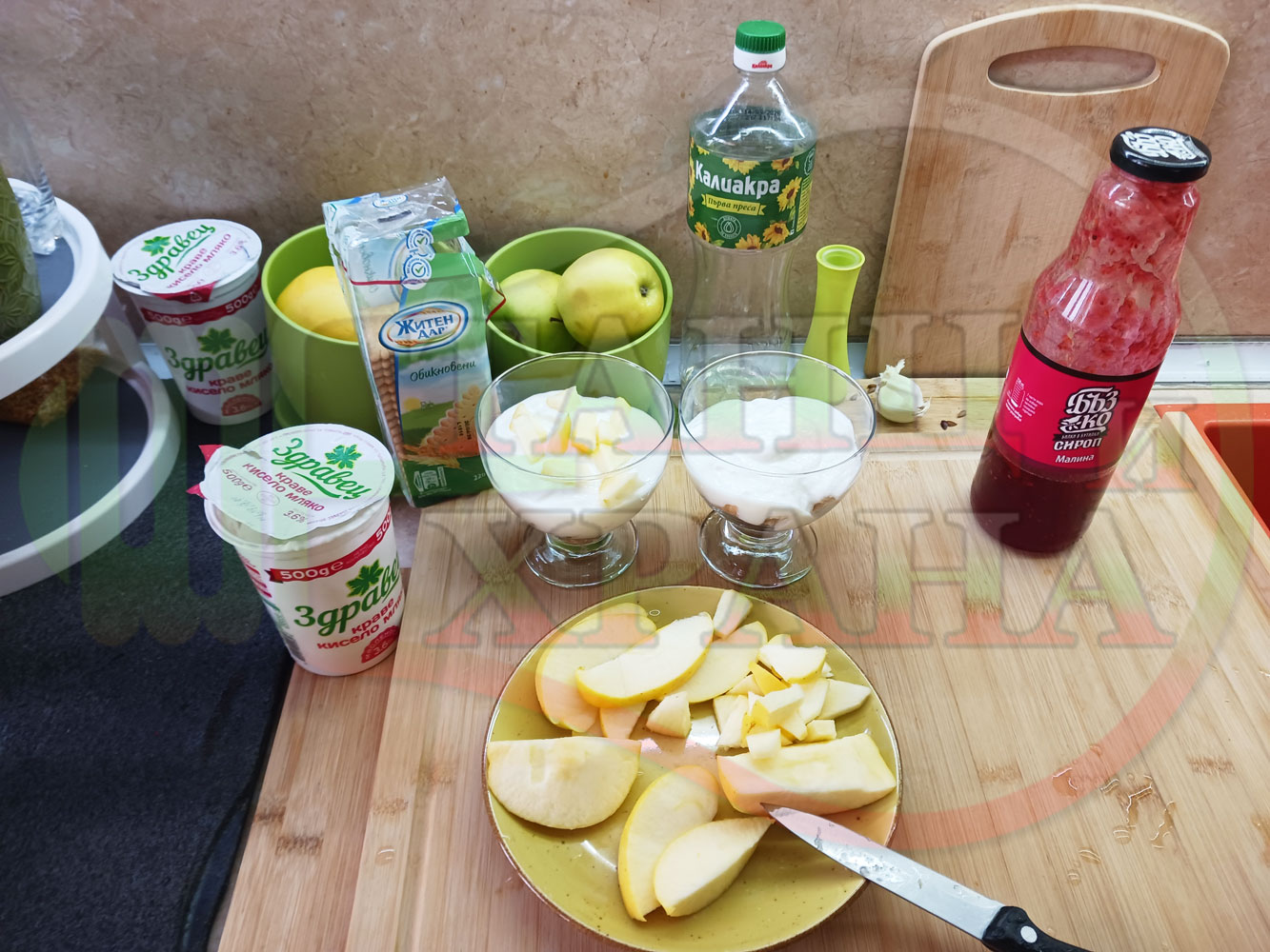 Бисквитен плодов млечен десерт "Ябълков малиновосиропен киселомлечен" приготвен с обикновени бисквити, кисело мляко от България и пресни, жълти ябълки гарниран с малинов сироп