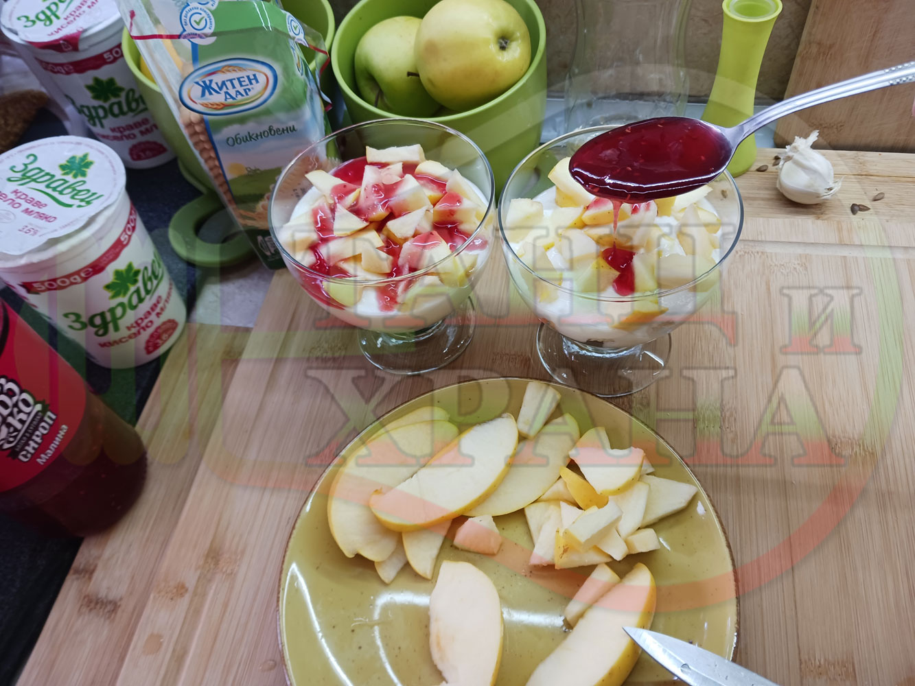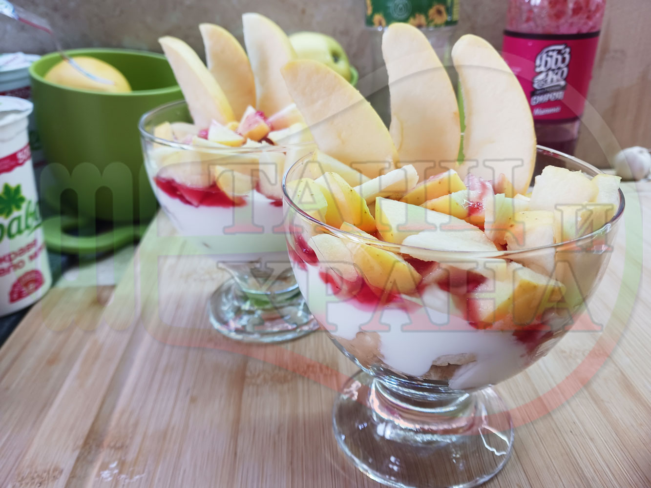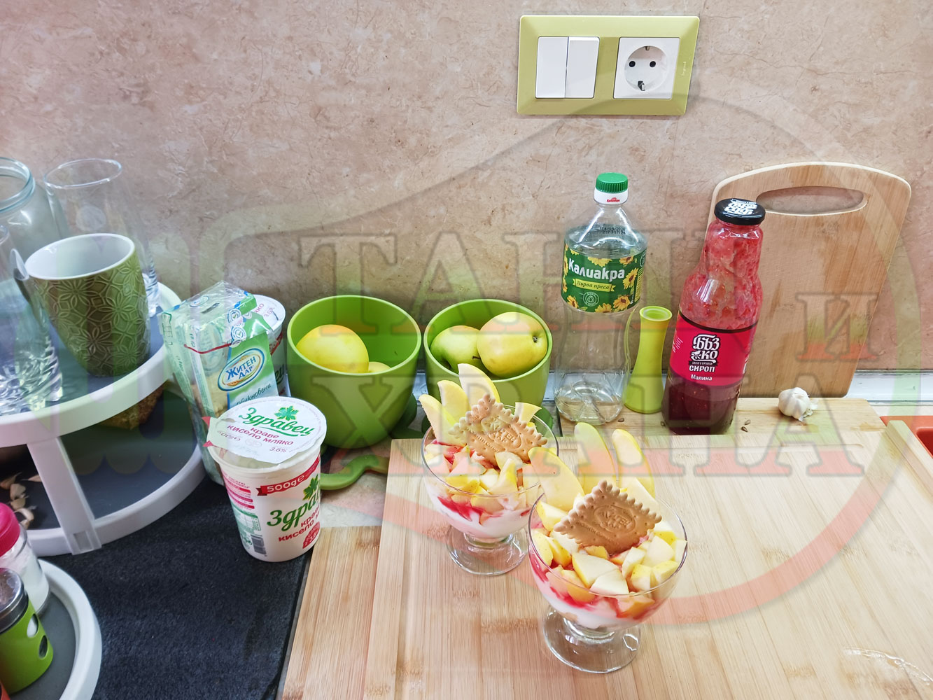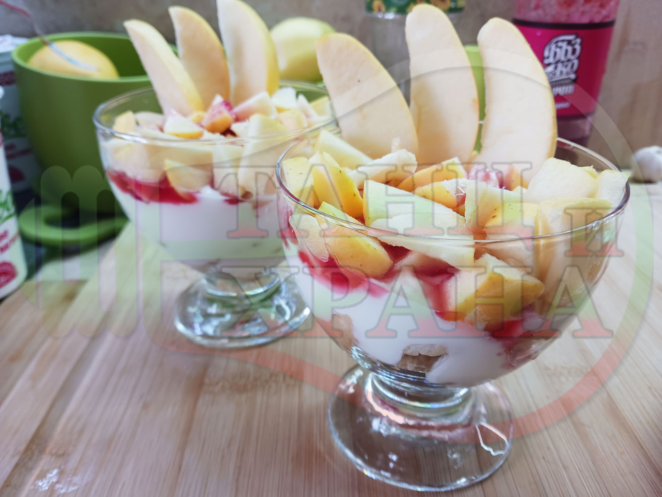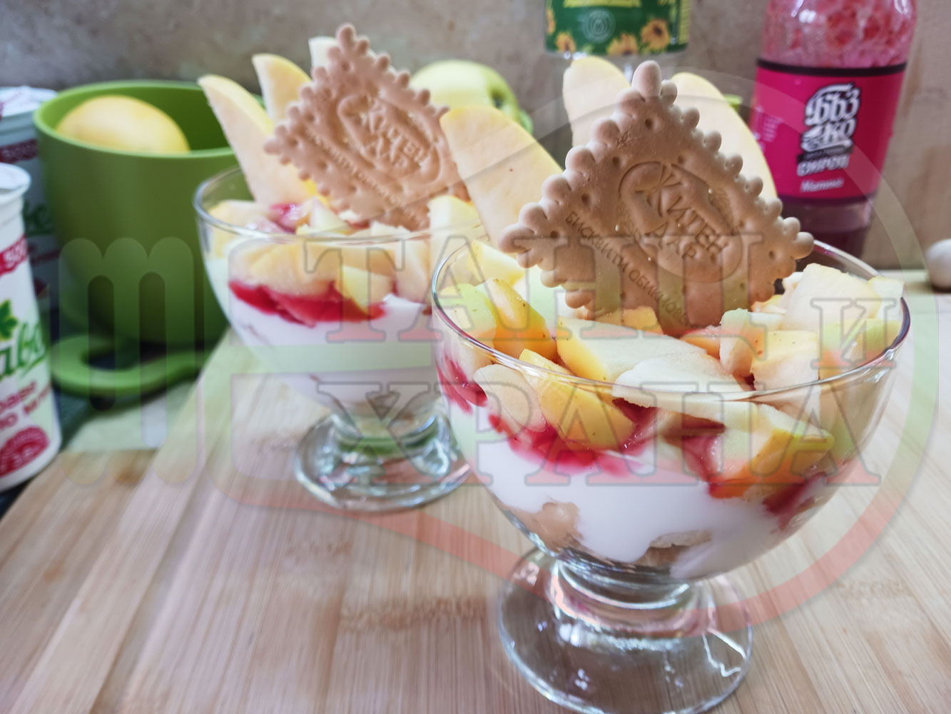 Бисквитен плодов млечен десерт "Ябълков малиновосиропен киселомлечен" приготвен с обикновени бисквити, кисело мляко от България и пресни, жълти ябълки гарниран с малинов сироп