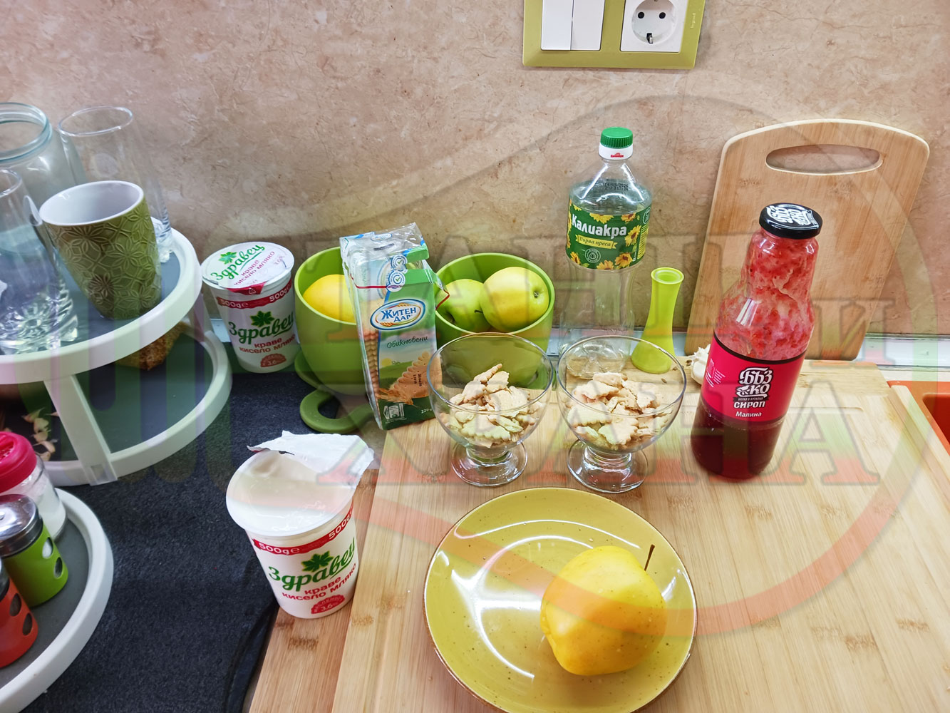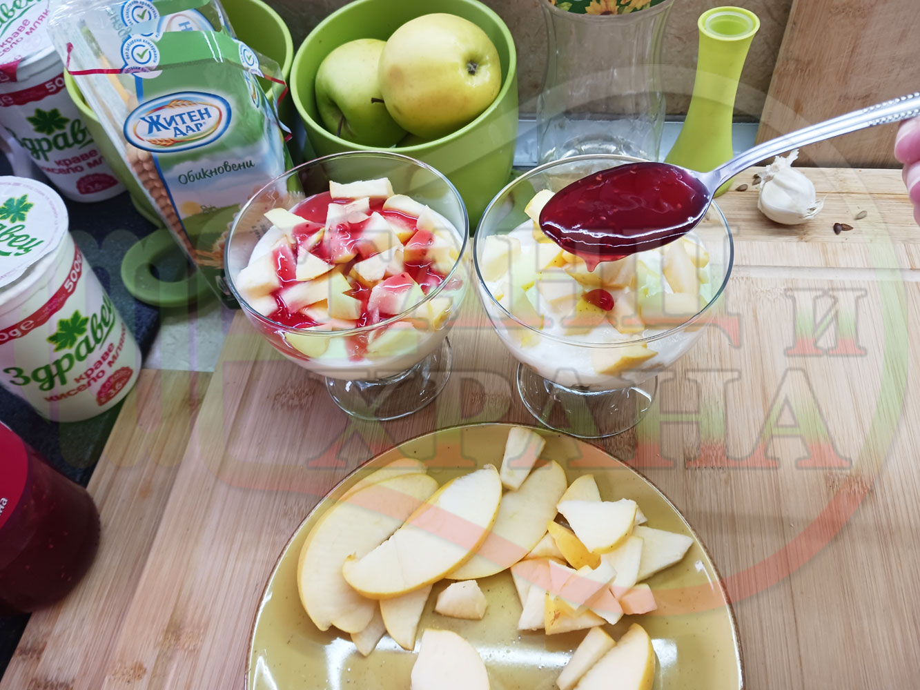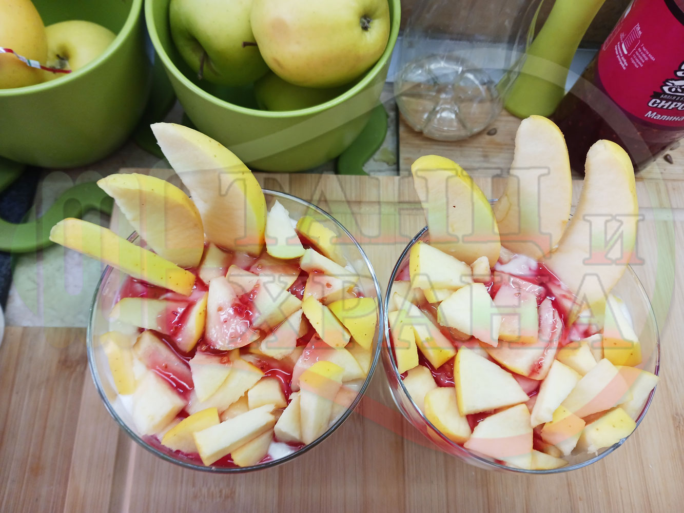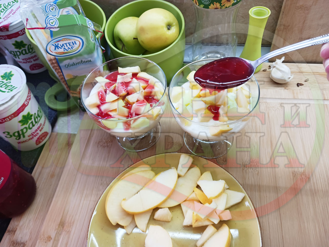 Бисквитен плодов млечен десерт "Ябълков малиновосиропен киселомлечен" приготвен с обикновени бисквити, кисело мляко от България и пресни, жълти ябълки гарниран с малинов сироп