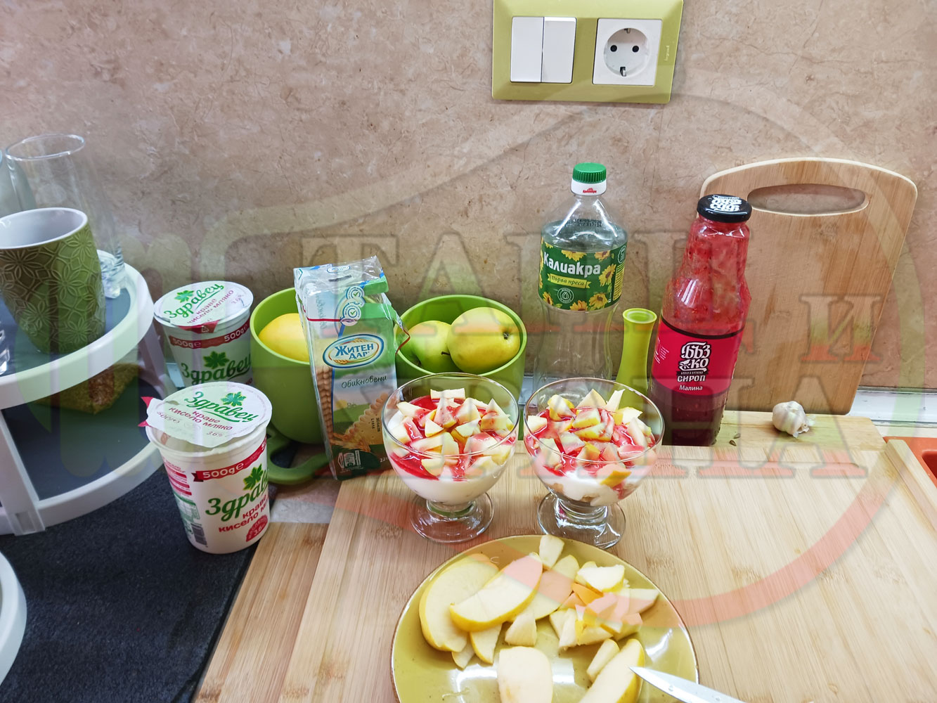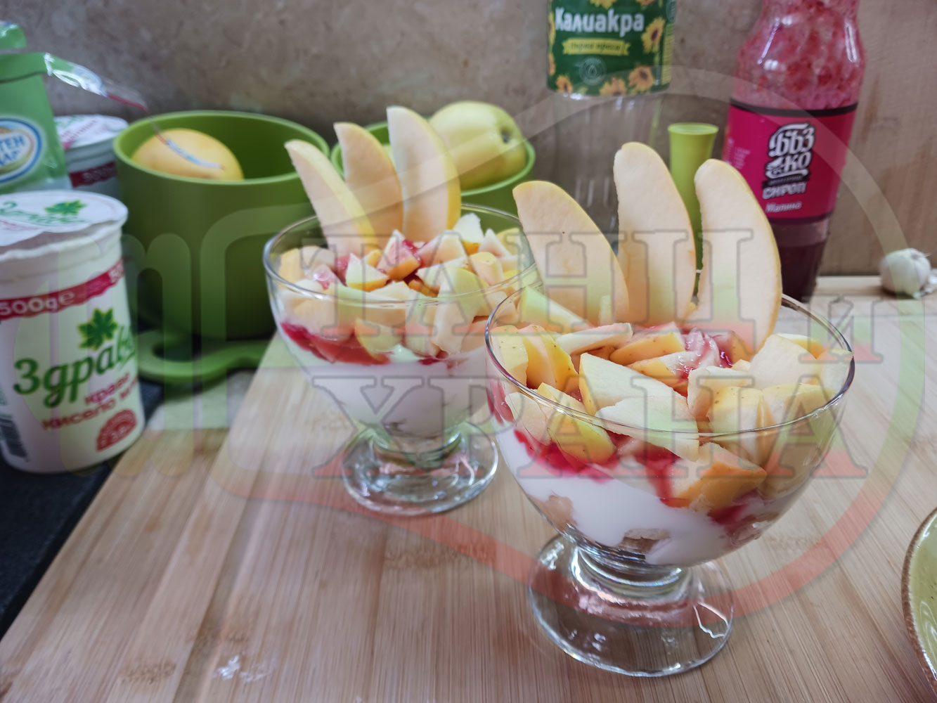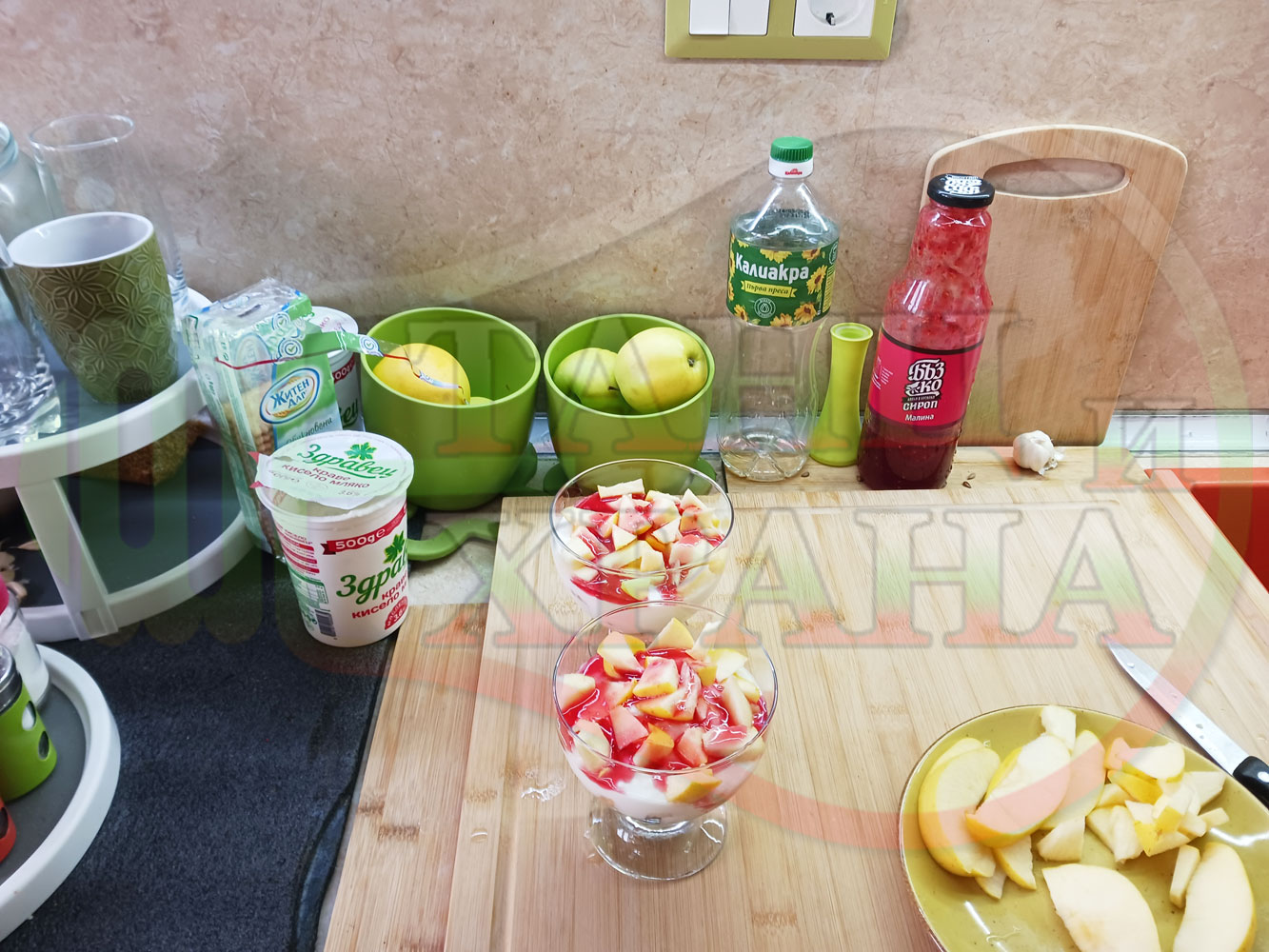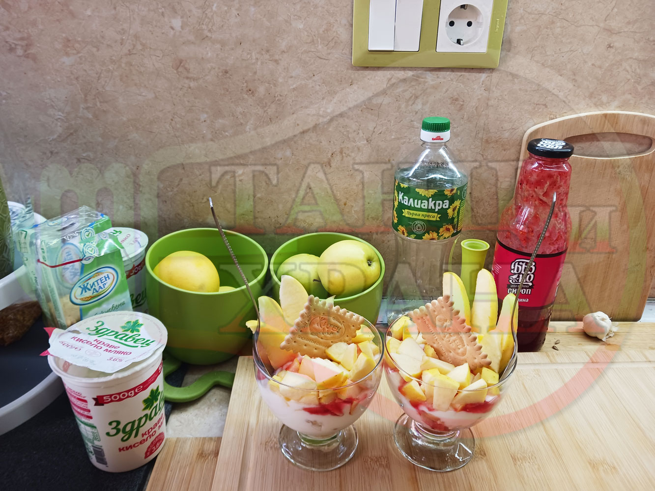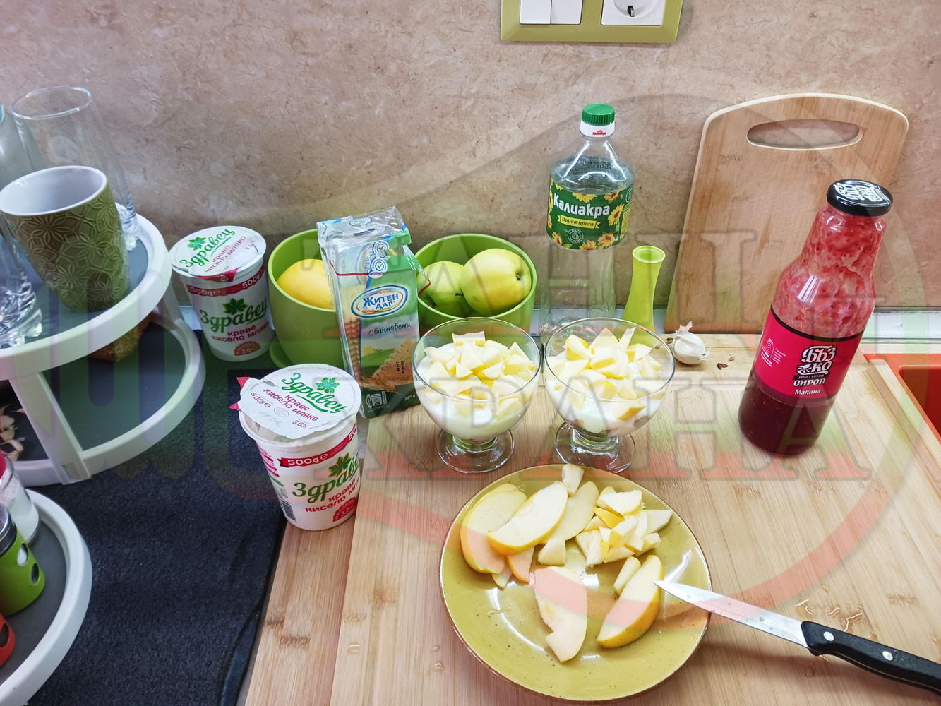 Бисквитен плодов млечен десерт "Ябълков малиновосиропен киселомлечен" приготвен с обикновени бисквити, кисело мляко от България и пресни, жълти ябълки гарниран с малинов сироп