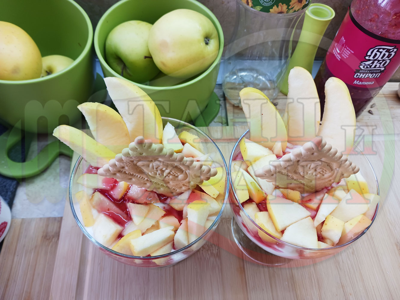 Сипете по 2,5 супени лъжици от малиновия сироп върху ябълките и украсете всяка порция с ябълковите резени и с по 1 цяла, обикновена бисквита (украсете по ваше желание и усмотрение).