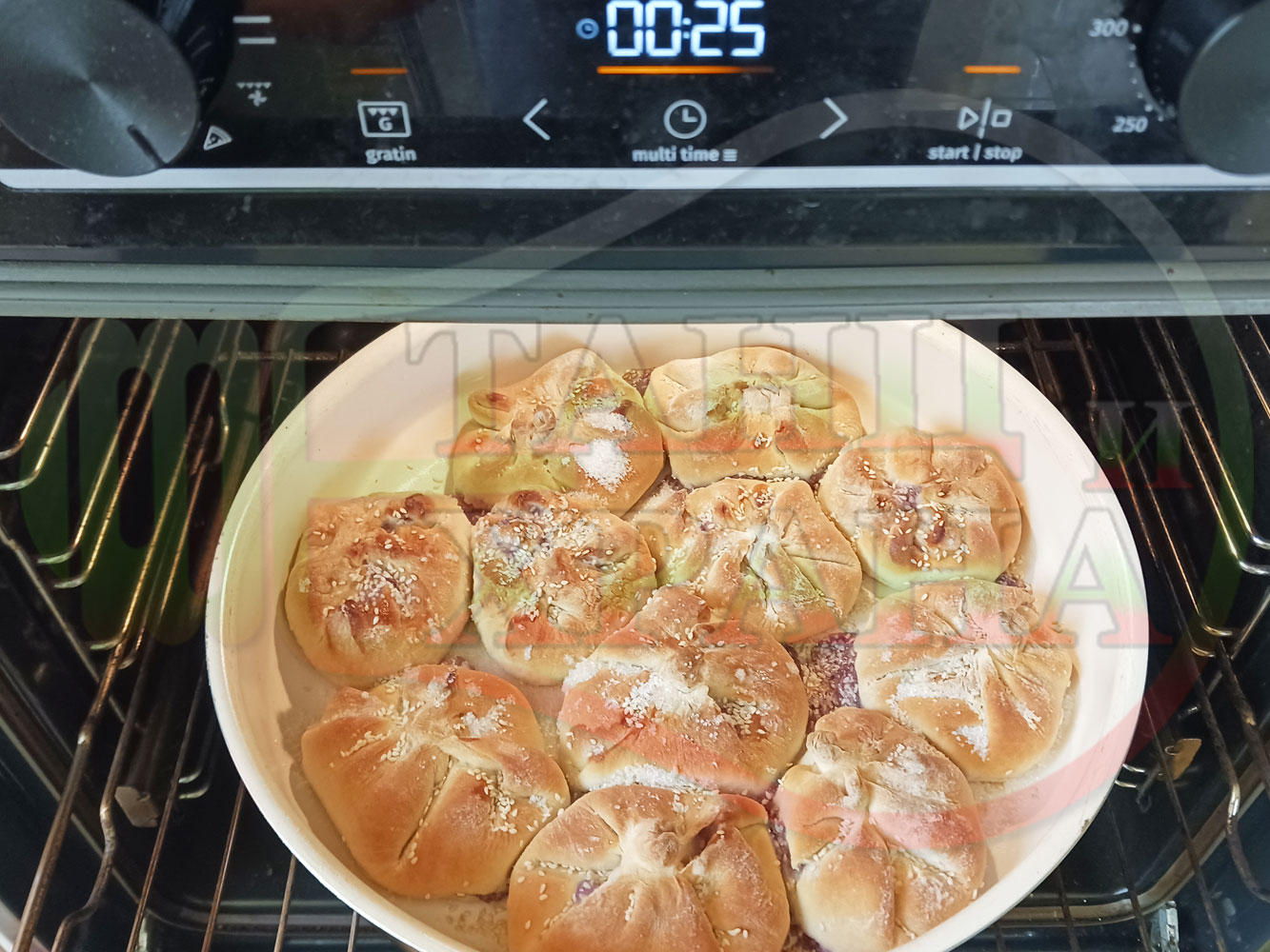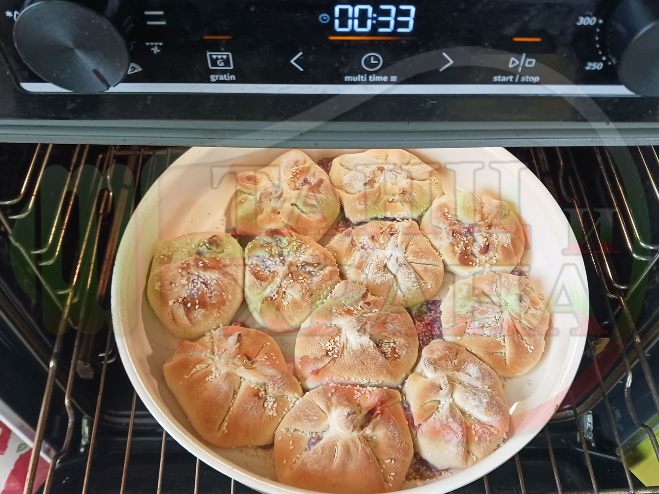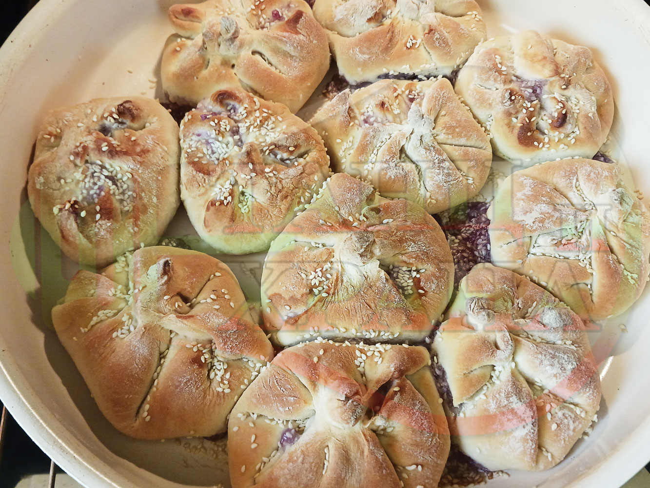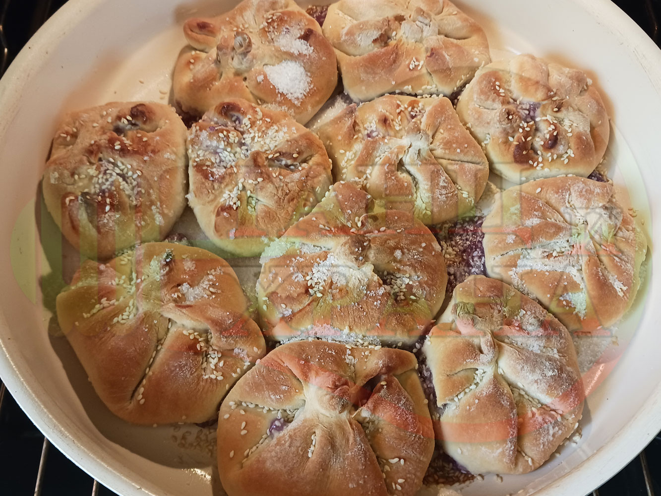 Поръсете със сусам повторно втасалите и удвоили си обема питки и поставете тавата в предварително загрятата фурна (загрейте я за поне 5 минути). Запечете на фурна без вентилатор на 180 градуса за около 50 минути.