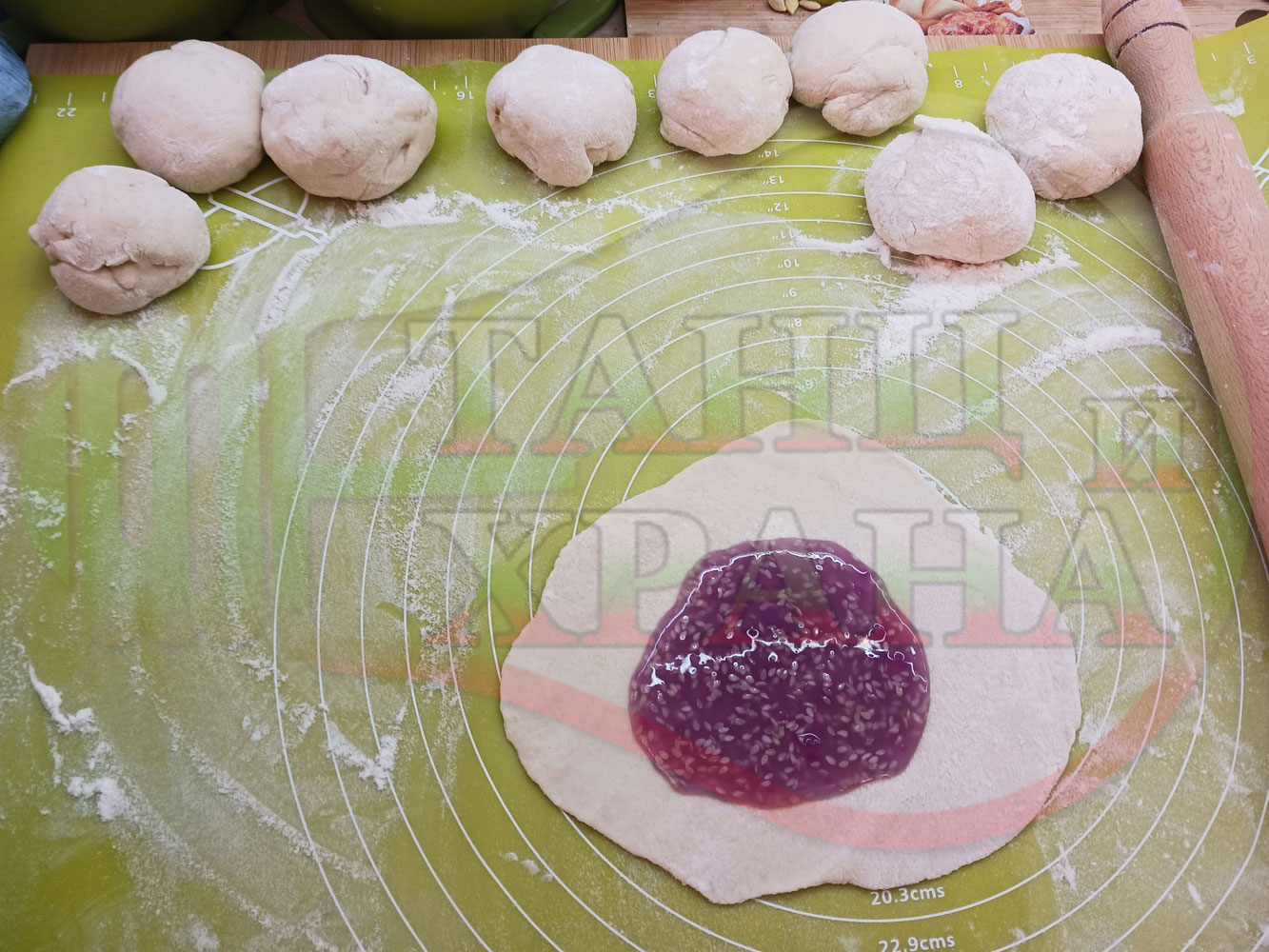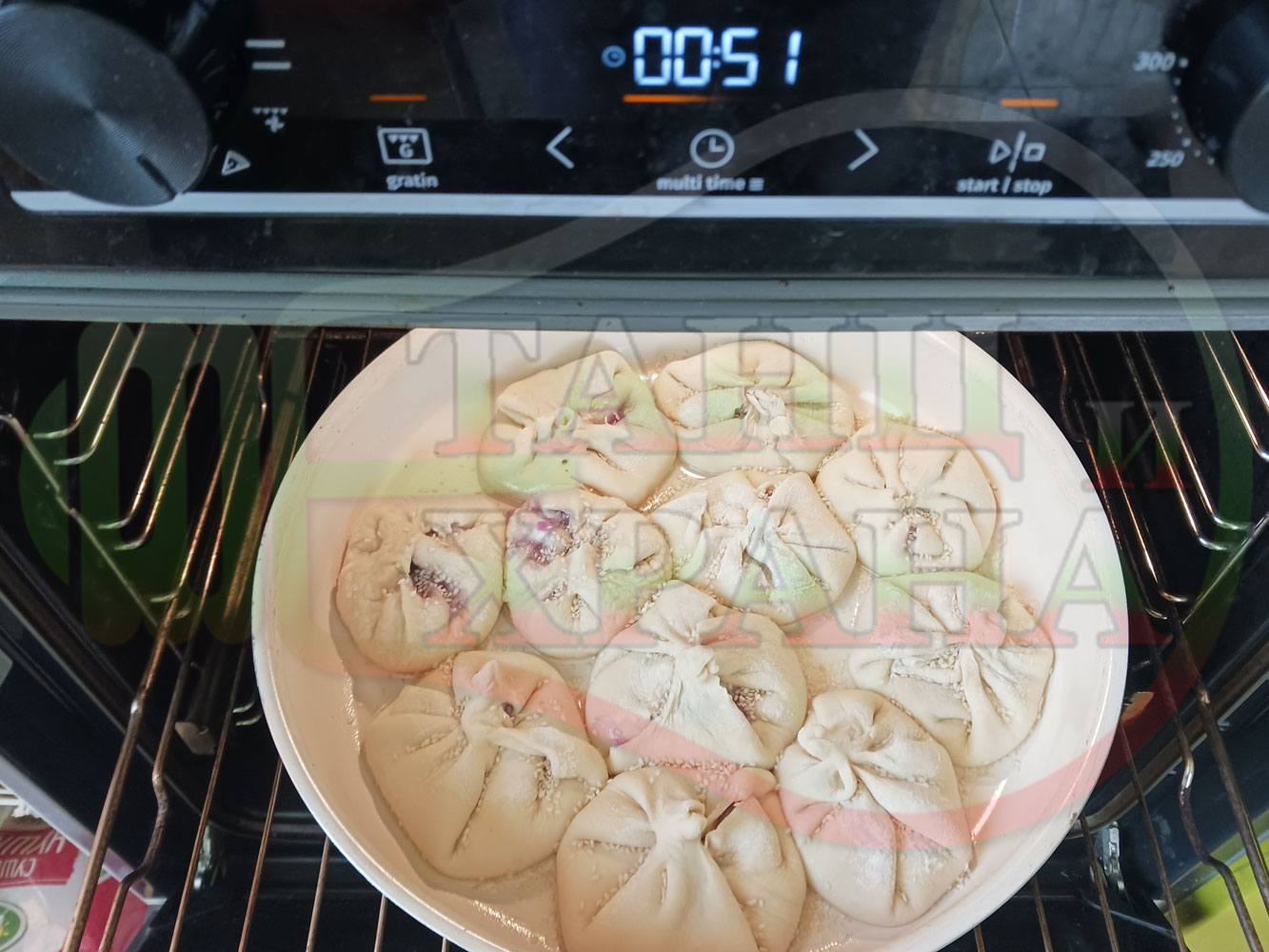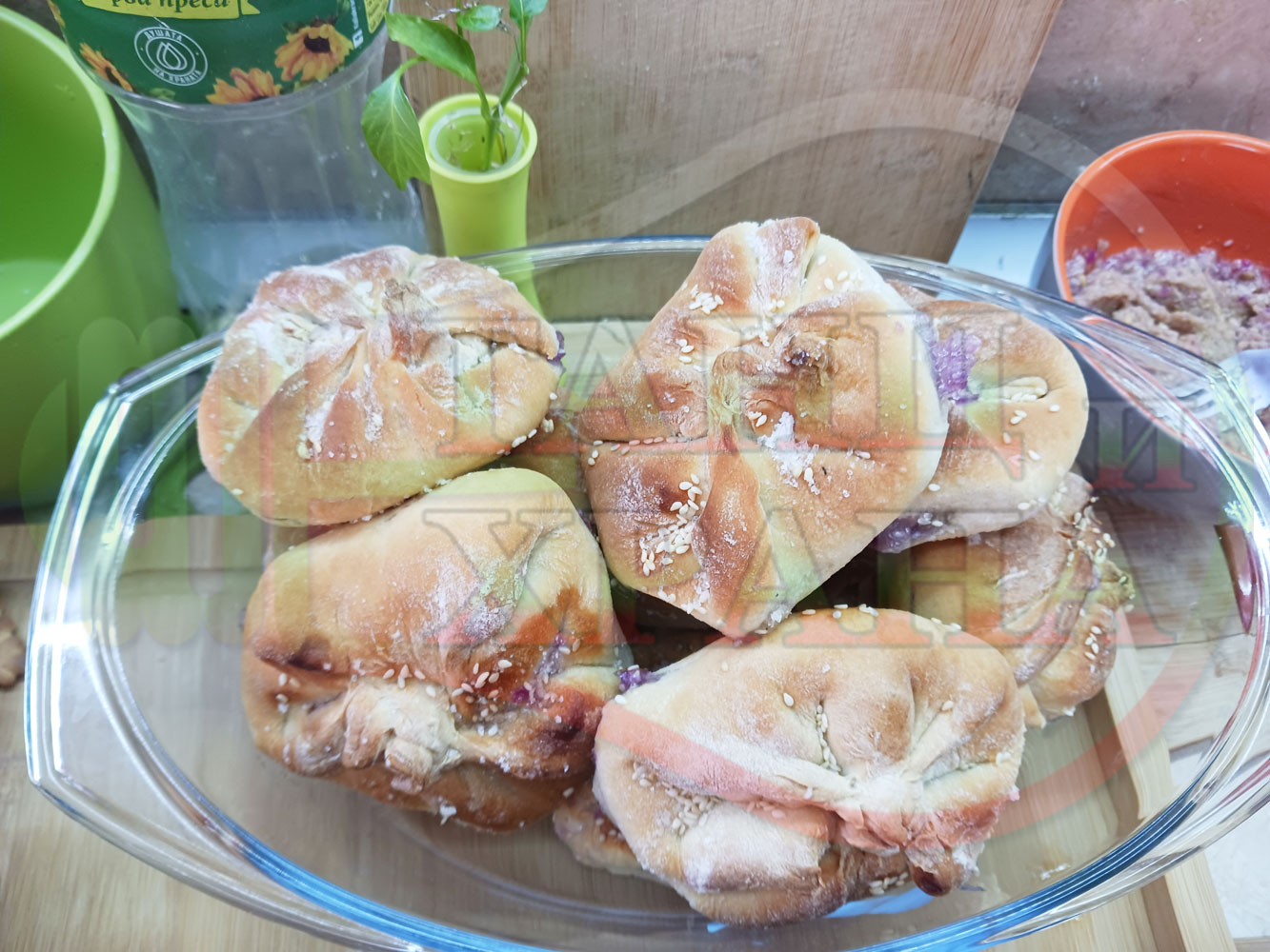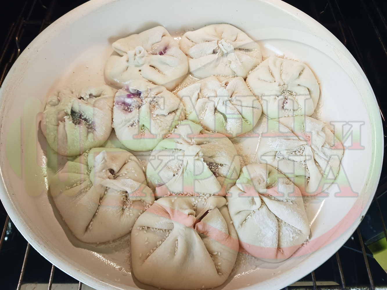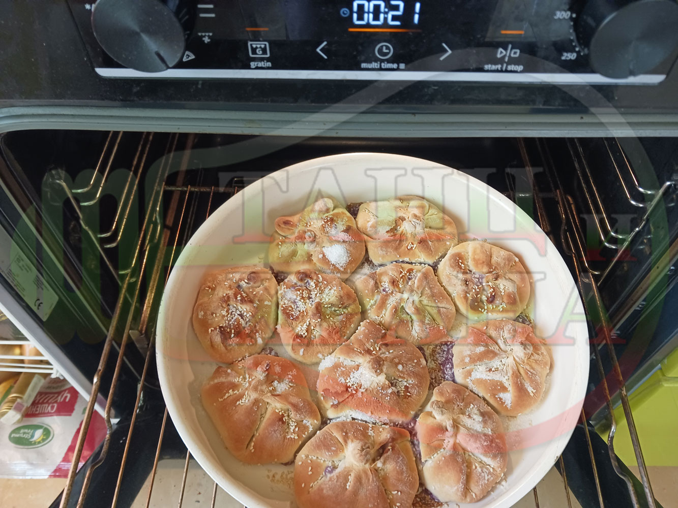 Поръсете със сусам повторно втасалите и удвоили си обема питки и поставете тавата в предварително загрятата фурна (загрейте я за поне 5 минути). Запечете на фурна без вентилатор на 180 градуса за около 50 минути.