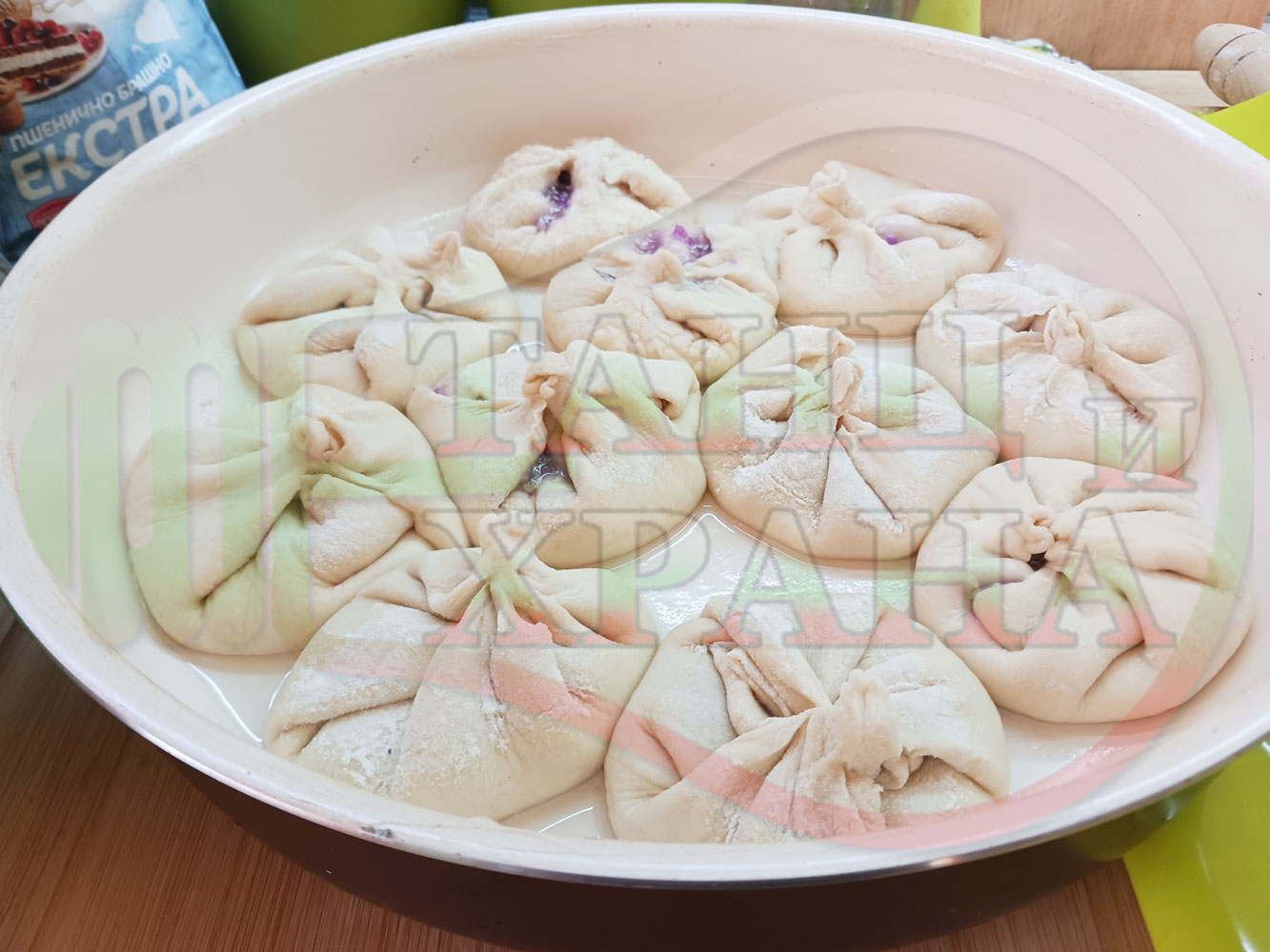 Поръсете работния плот с брашно, откъснете малка част от втасалото тесто и го разпределете на 11 части, от които оформете 11 малки "топки" (топките може да не са с идеално кръгла форма). Разточете всяка топка на средно дебела кора, сипете по 2 супени лъжици от нишестения рядък крем и затворете кората подобно на затварянето на бохча (торбичка). Затворете бохчите внимателно, така че да не изпадне плънката като приберете всички "краища" на кръга, изтеглете ги леко, завъртете и ги притиснете за да се "захванат" здраво. Подредете сладките питки (бохчи) в намазана със слънчогледово олио тава за печене и поставете тавата на топло място за около 30 минути за да удвоят питките обема си (повторно да втасат (по-бързото втасване зависи от топлината в кухнята)).