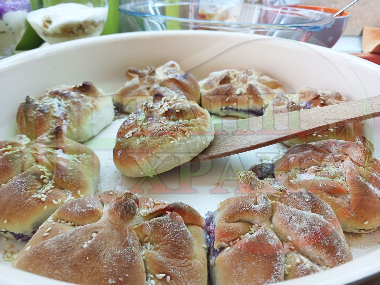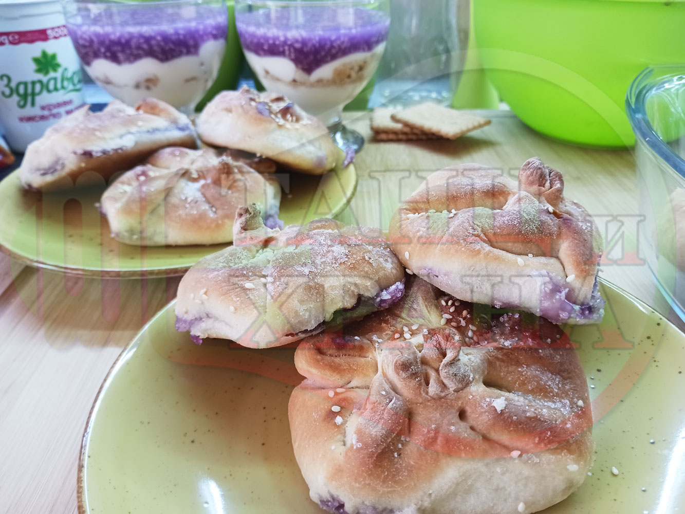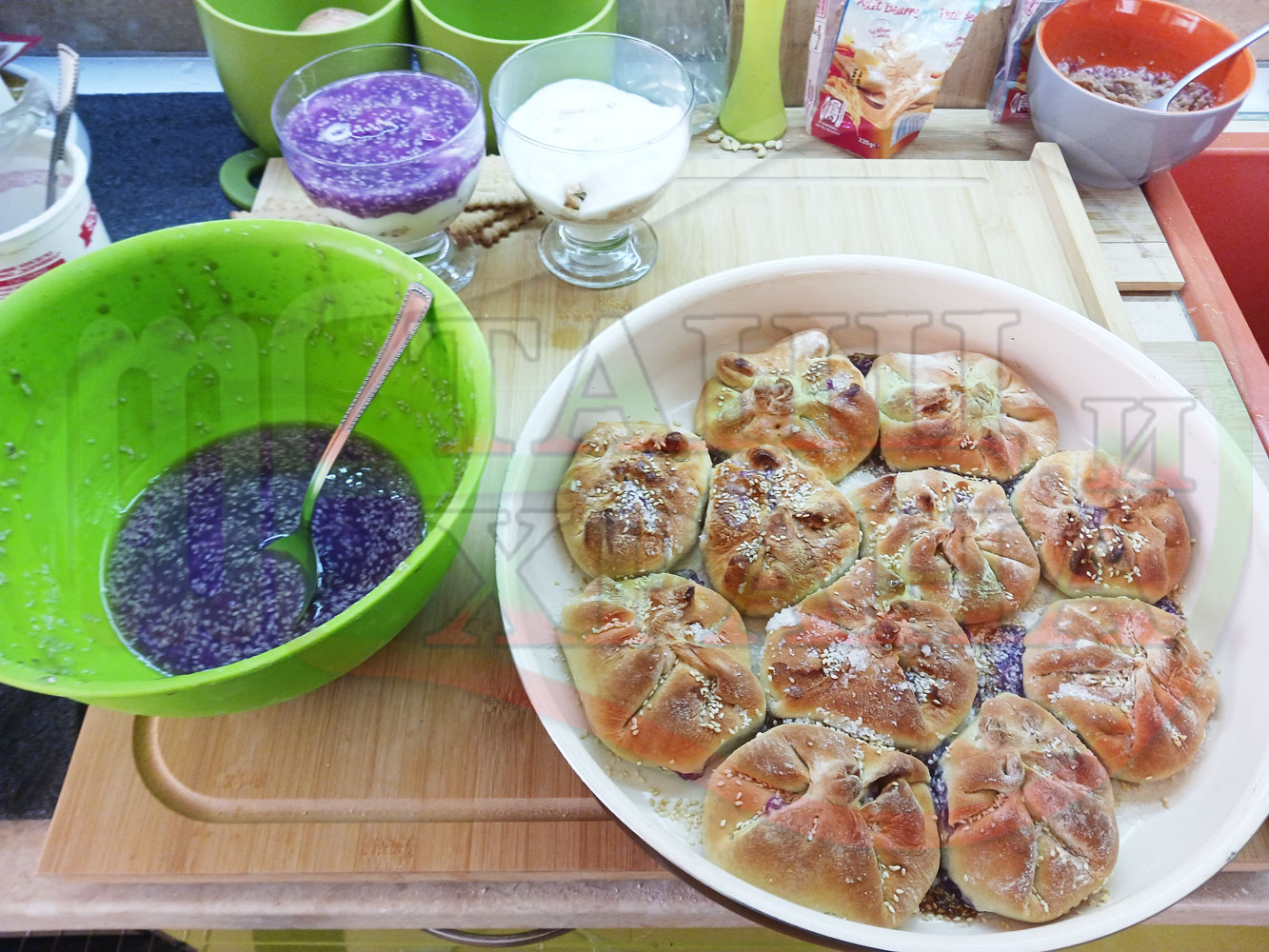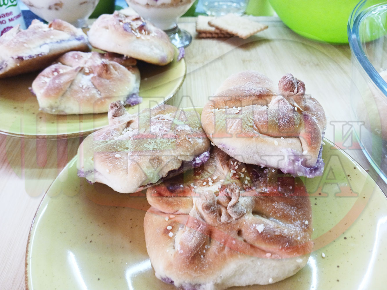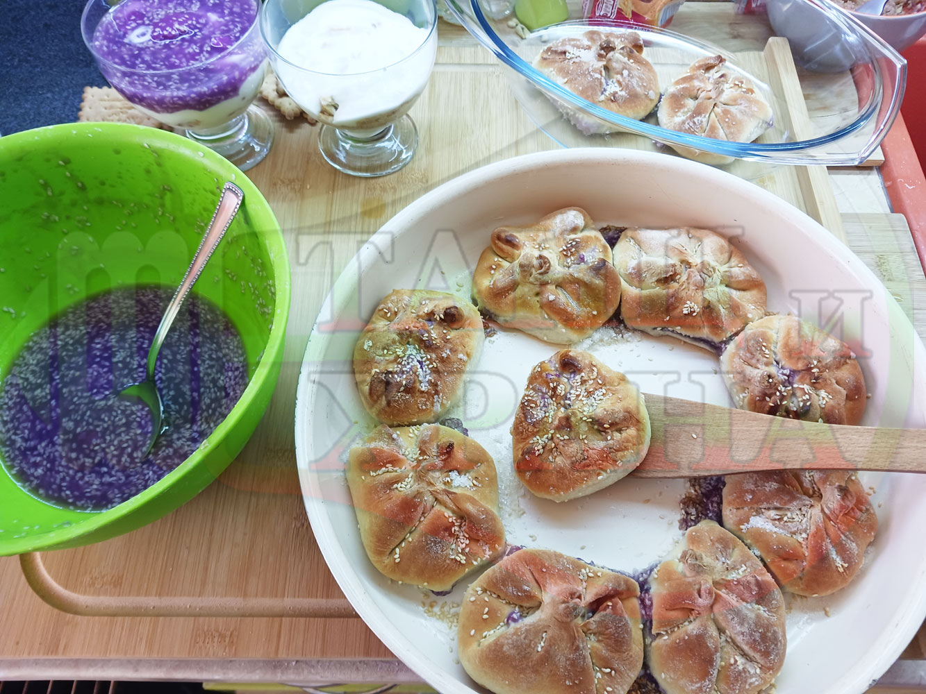 За подслаждане спретнах "бохчи (торбички)" с постен нишестен крем от горски плодове и сусам от същото тесто, от което приготвих солените лютеницни хлебчета (микс от хлебчета). Напълних сладките постни питки (бохчи) с рядък нишестен крем със суров сусам и не предполагах, че ще се получат толкова вкусни, пухкави и балансирани от към сладост, въпреки че тестото не е замесвано със захар и е постно замесено без яйца, мляко, масло и т.н. Ммм... в кухнята ухае на солени и сладки хлебчета и питки и отново се получи голяма вкусно, вкусна, вкусотия (вкуснотия)...