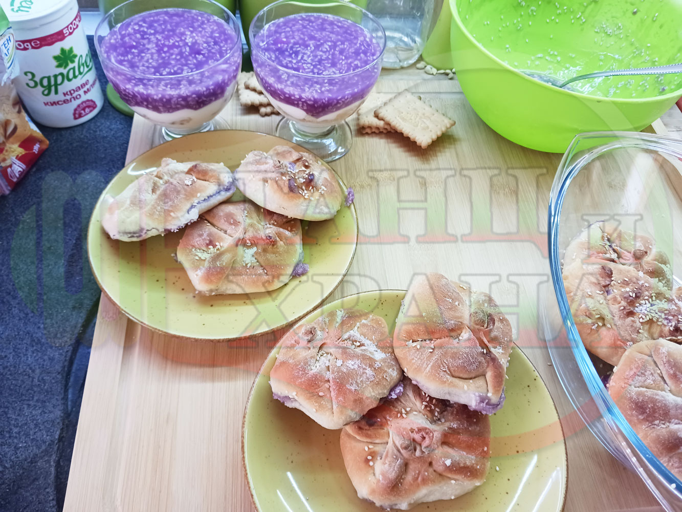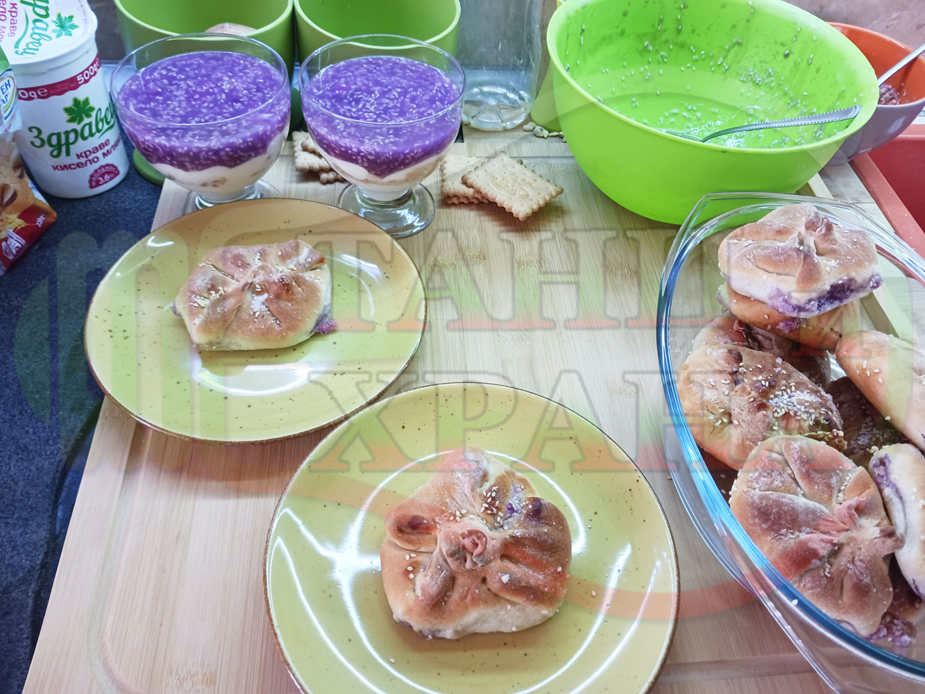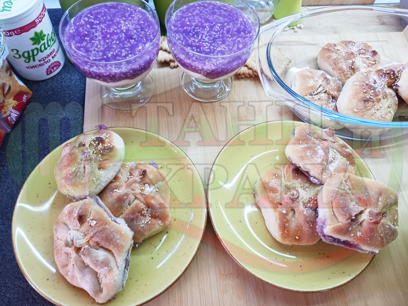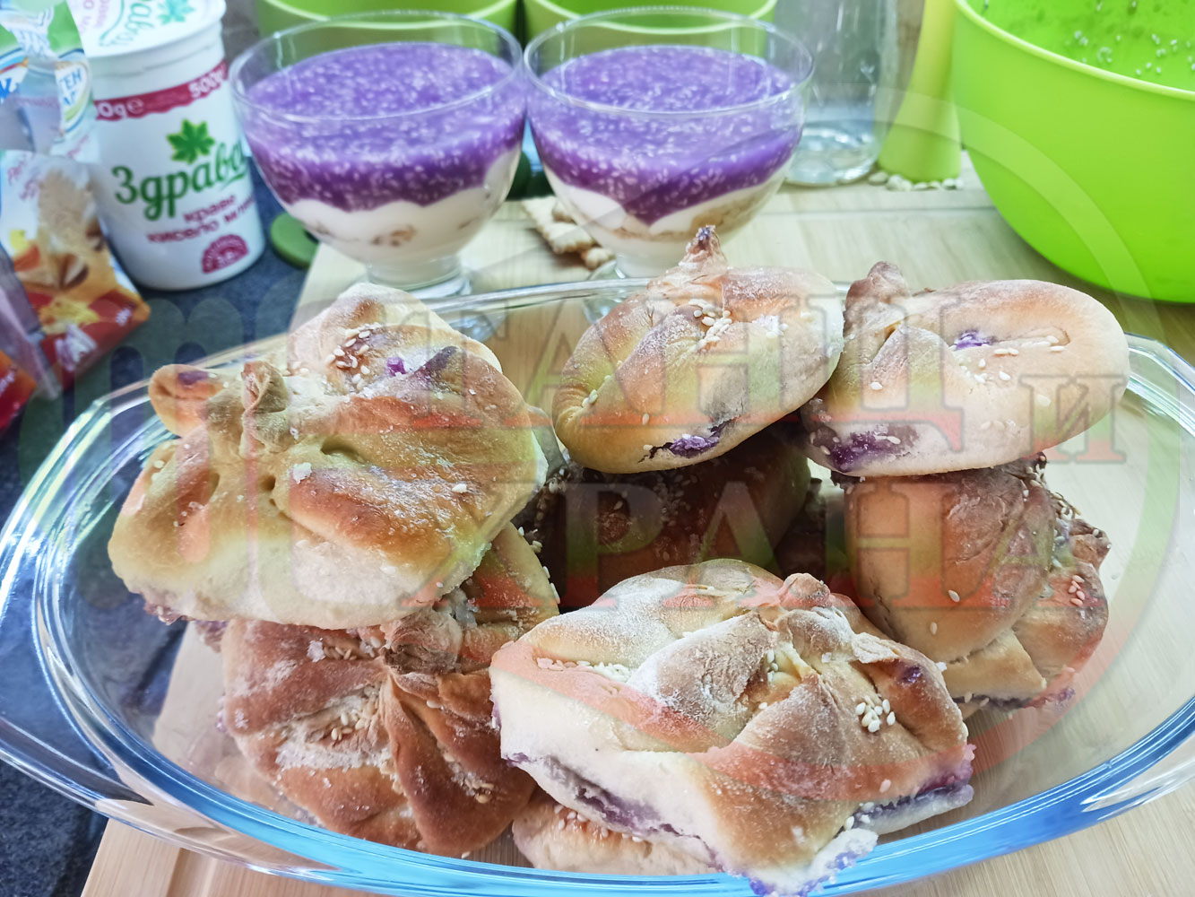 За подслаждане спретнах "бохчи (торбички)" с постен нишестен крем от горски плодове и сусам от същото тесто, от което приготвих солените лютеницни хлебчета (микс от хлебчета). Напълних сладките постни питки (бохчи) с рядък нишестен крем със суров сусам и не предполагах, че ще се получат толкова вкусни, пухкави и балансирани от към сладост, въпреки че тестото не е замесвано със захар и е постно замесено без яйца, мляко, масло и т.н. Ммм... в кухнята ухае на солени и сладки хлебчета и питки и отново се получи голяма вкусно, вкусна, вкусотия (вкуснотия)...
