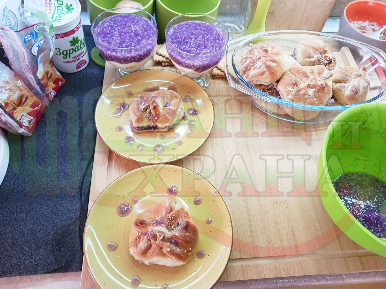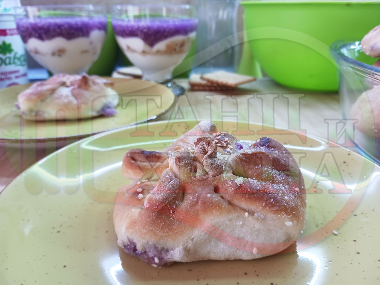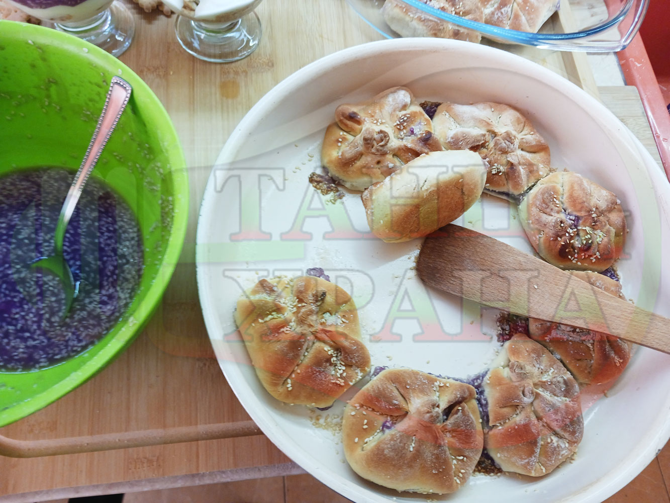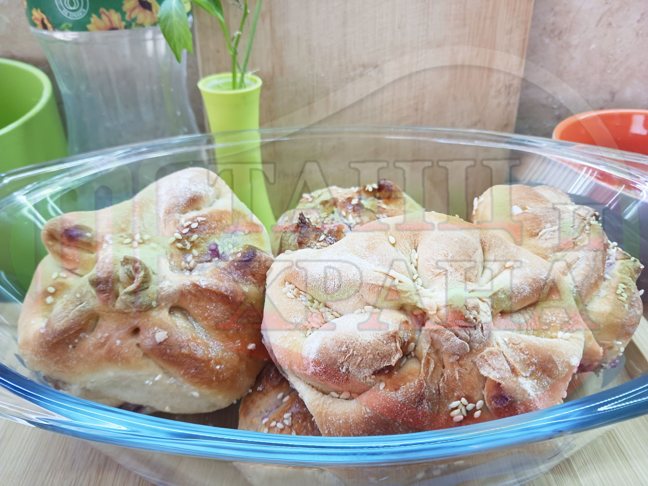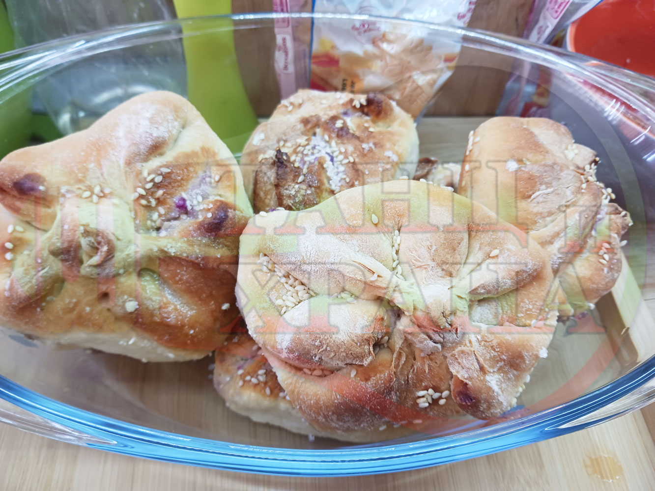 За подслаждане спретнах "бохчи (торбички)" с постен нишестен крем от горски плодове и сусам от същото тесто, от което приготвих солените лютеницни хлебчета (микс от хлебчета). Напълних сладките постни питки (бохчи) с рядък нишестен крем със суров сусам и не предполагах, че ще се получат толкова вкусни, пухкави и балансирани от към сладост, въпреки че тестото не е замесвано със захар и е постно замесено без яйца, мляко, масло и т.н. Ммм... в кухнята ухае на солени и сладки хлебчета и питки и отново се получи голяма вкусно, вкусна, вкусотия (вкуснотия)...