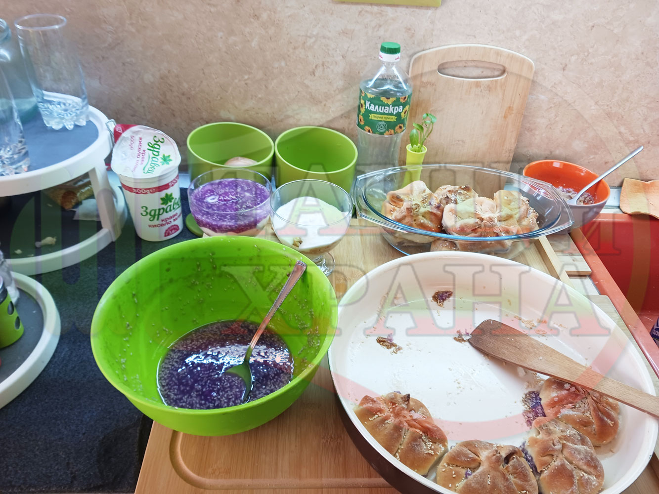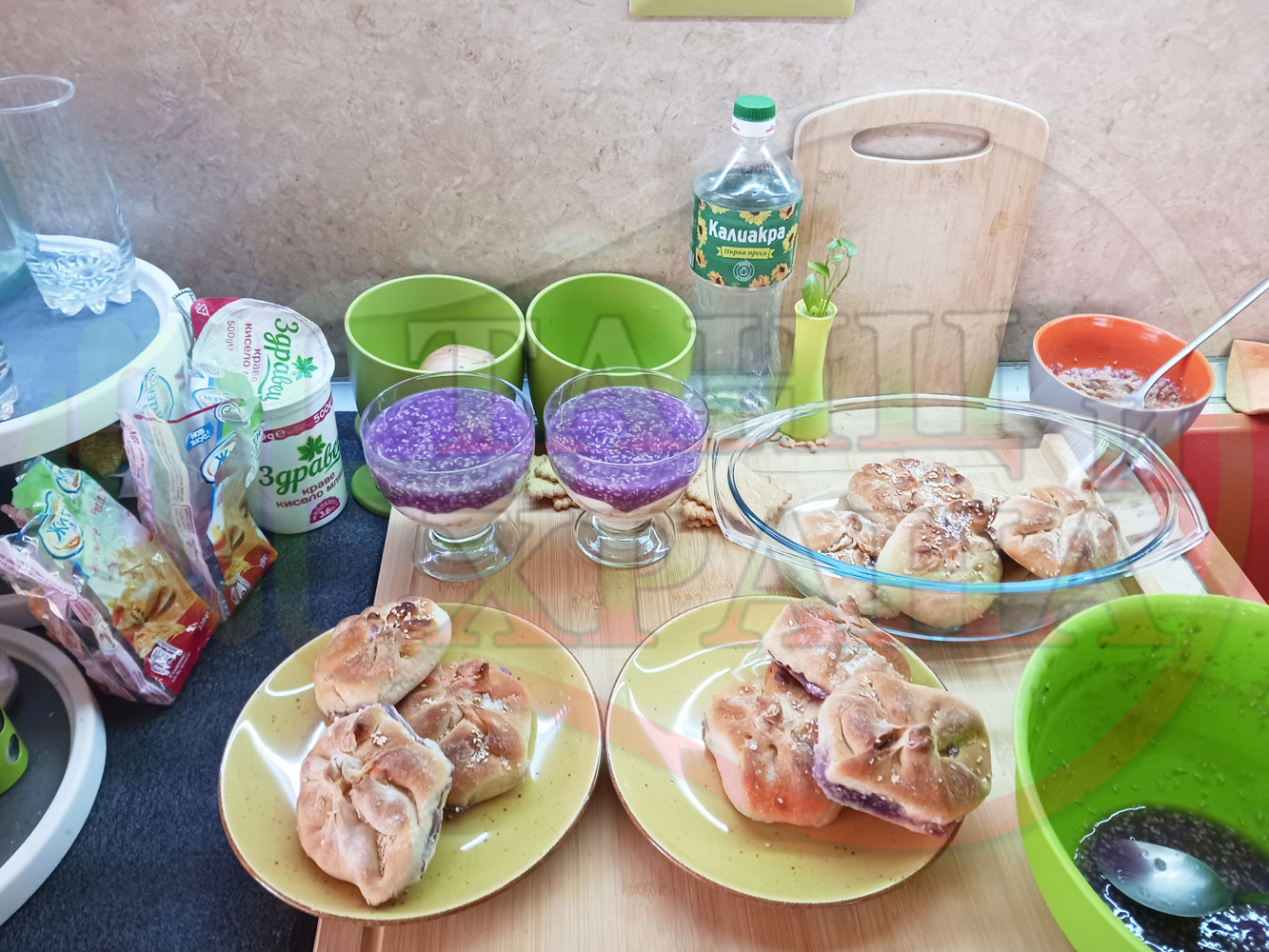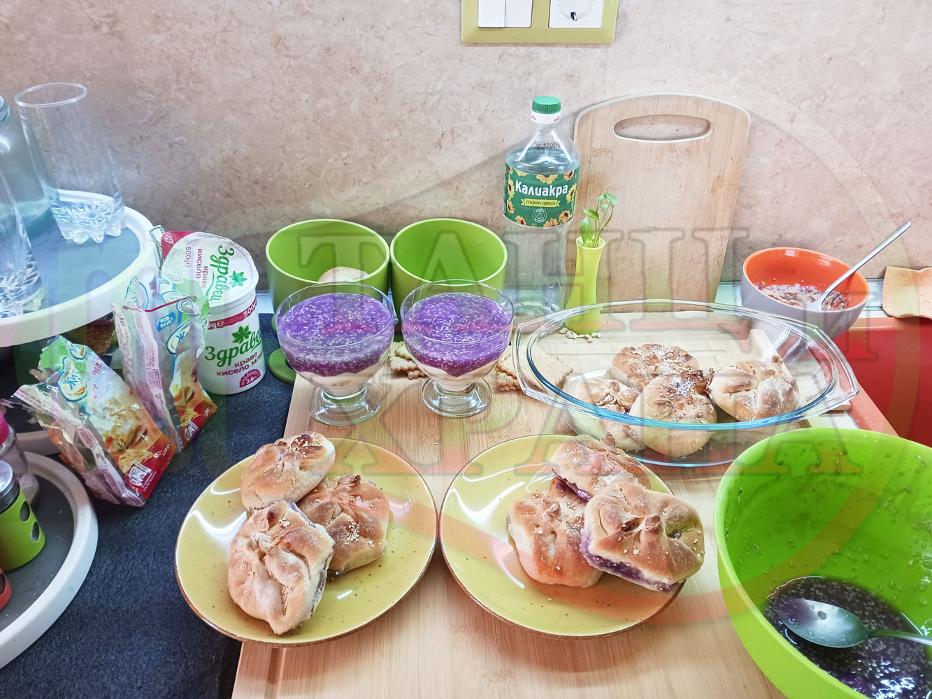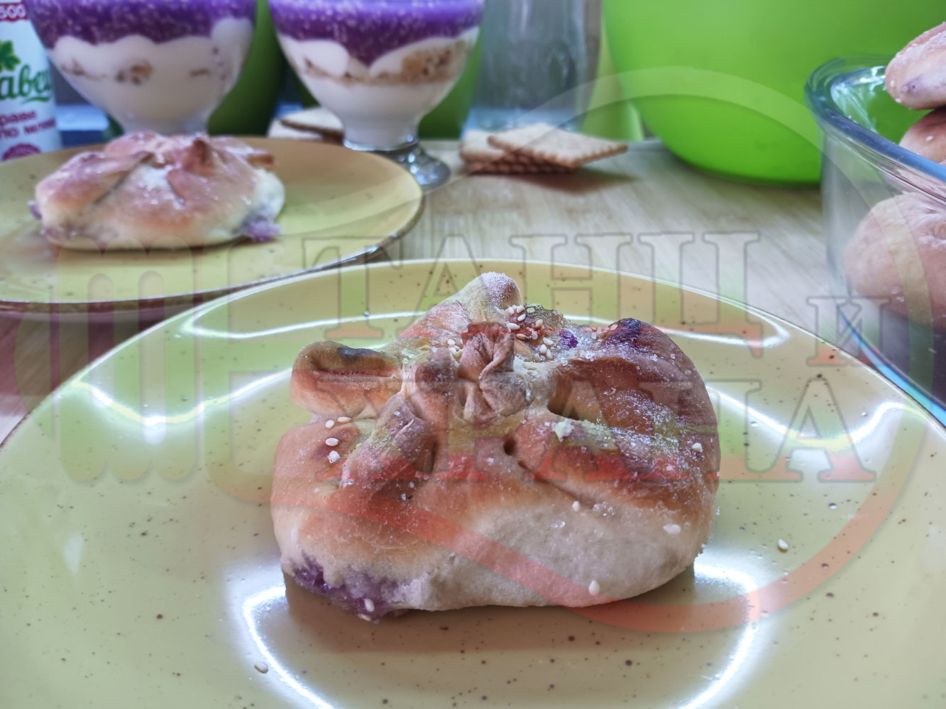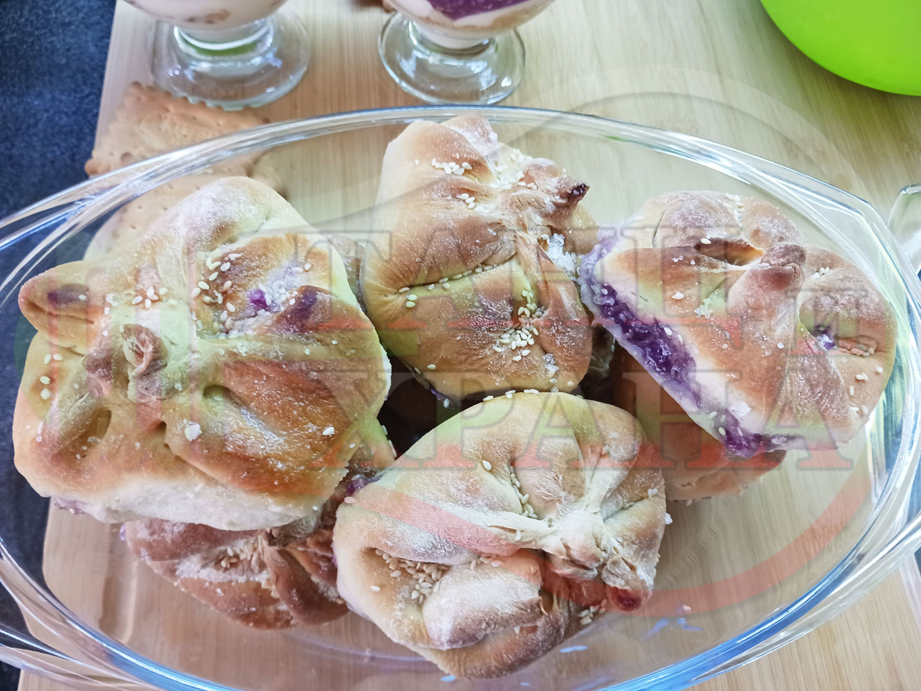 За подслаждане спретнах "бохчи (торбички)" с постен нишестен крем от горски плодове и сусам от същото тесто, от което приготвих солените лютеницни хлебчета (микс от хлебчета). Напълних сладките постни питки (бохчи) с рядък нишестен крем със суров сусам и не предполагах, че ще се получат толкова вкусни, пухкави и балансирани от към сладост, въпреки че тестото не е замесвано със захар и е постно замесено без яйца, мляко, масло и т.н. Ммм... в кухнята ухае на солени и сладки хлебчета и питки и отново се получи голяма вкусно, вкусна, вкусотия (вкуснотия)...