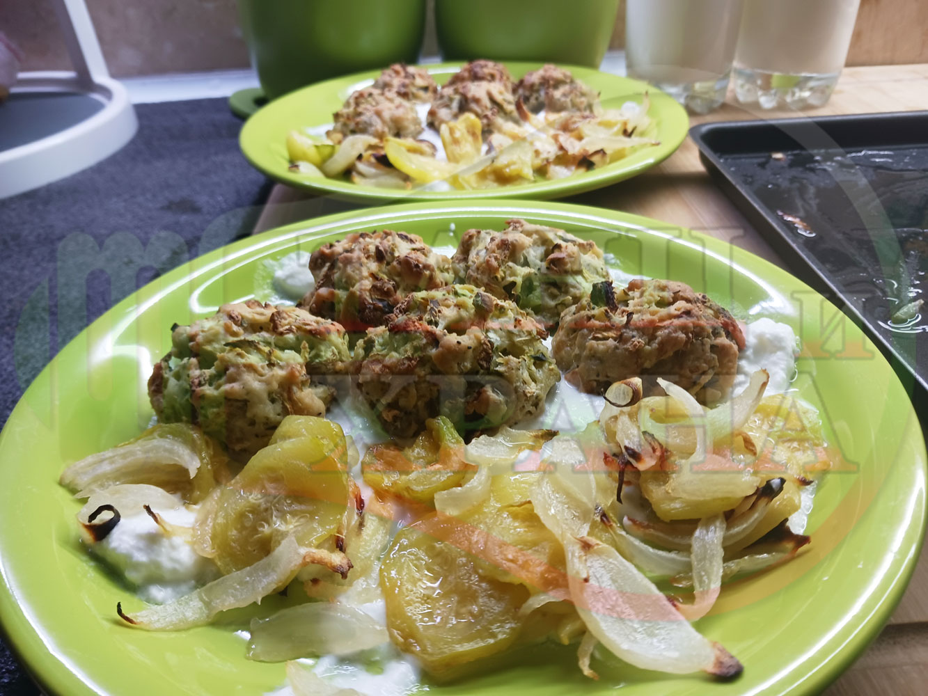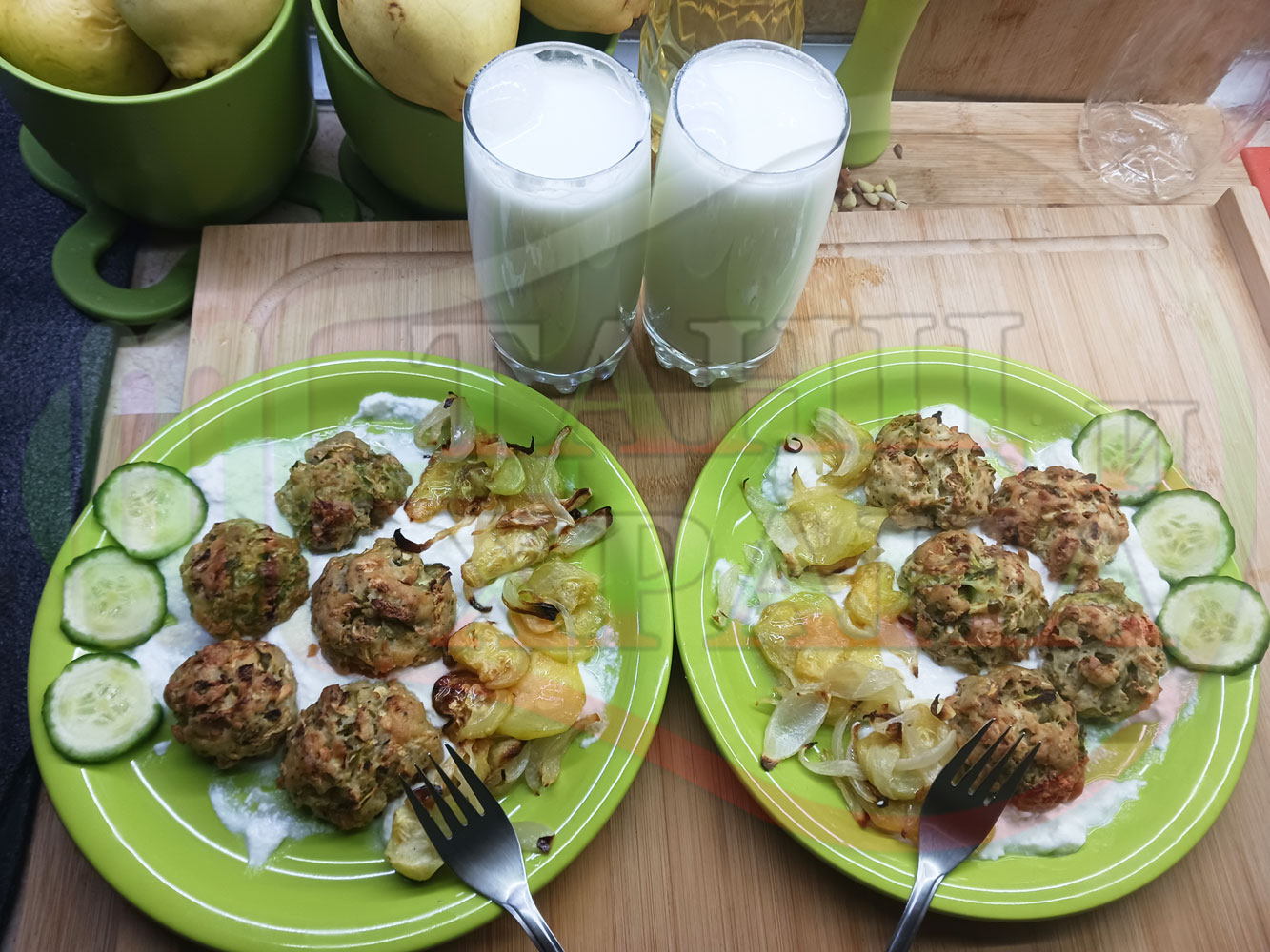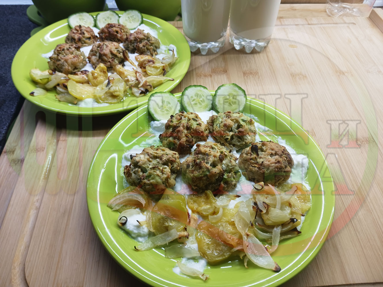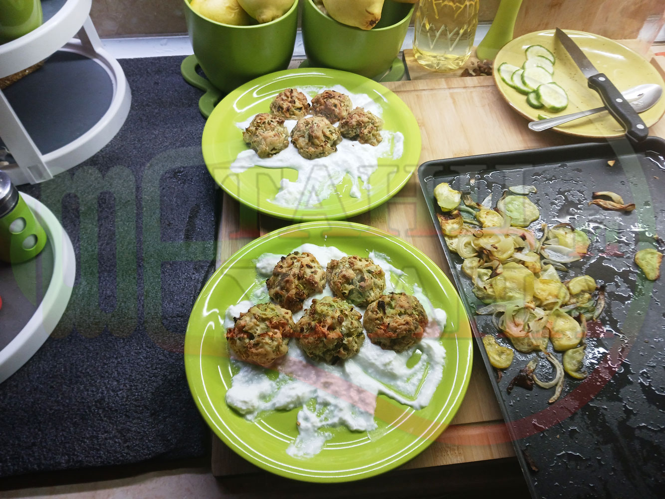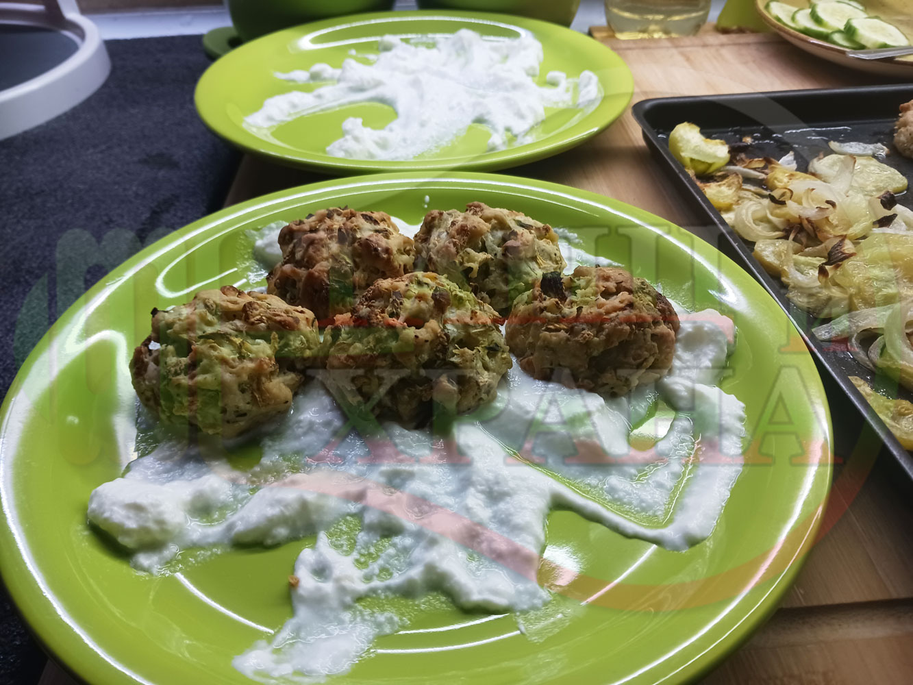 Зеленчукови кюфтенца "Краставичночеснови БГмерудийни" приготвени с пресни краставици, ронена чубрица, слънчогледово олио и стар чесън подходящи за постещи хора гарнирани с млечна основа с кисело мляко от България за непостещи