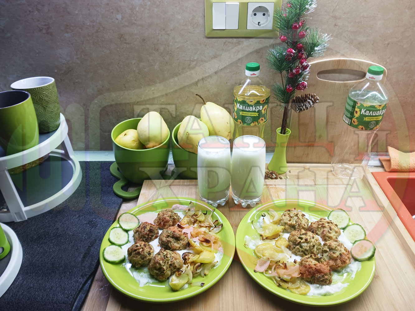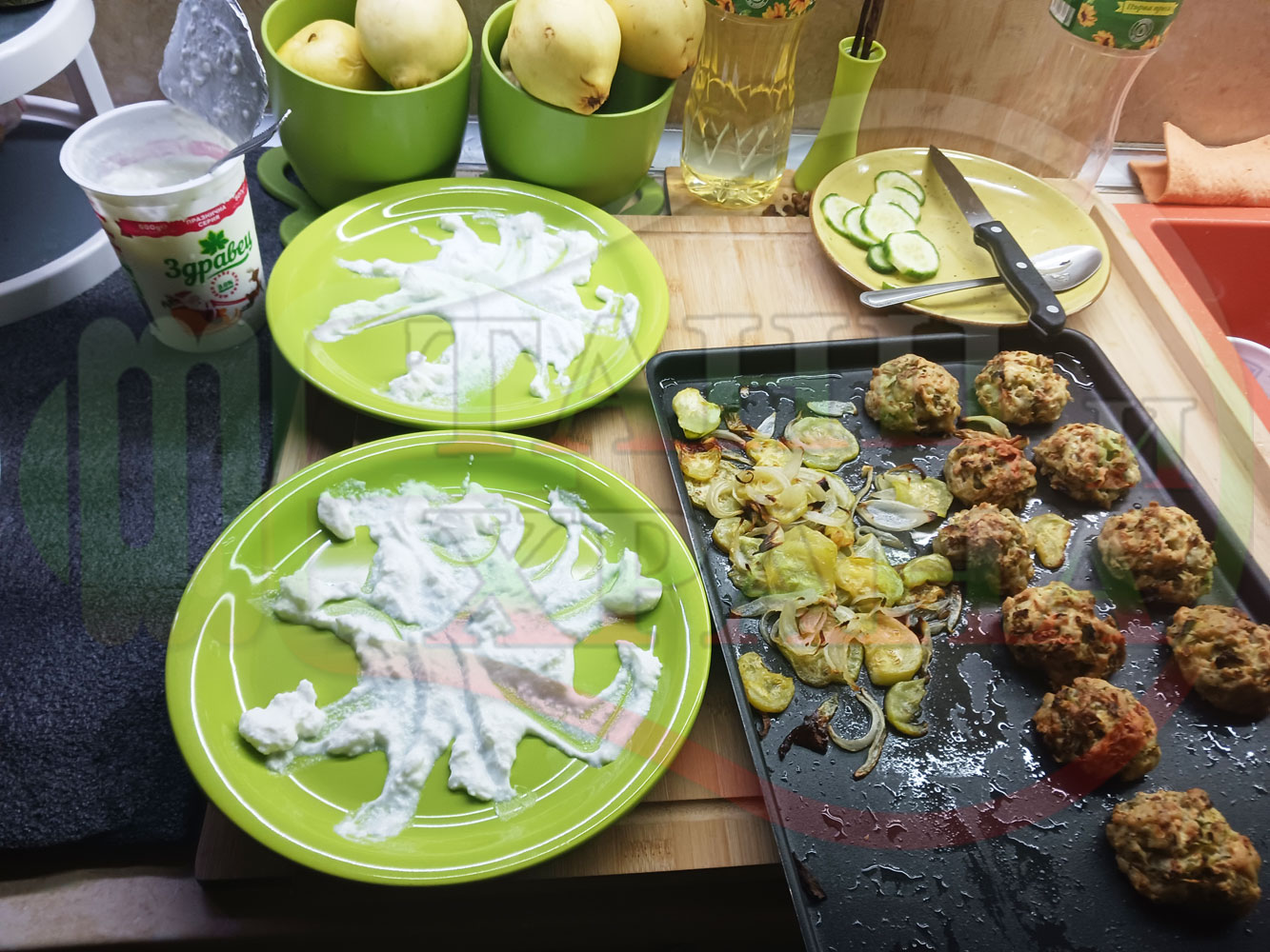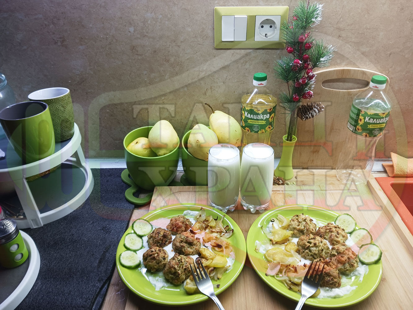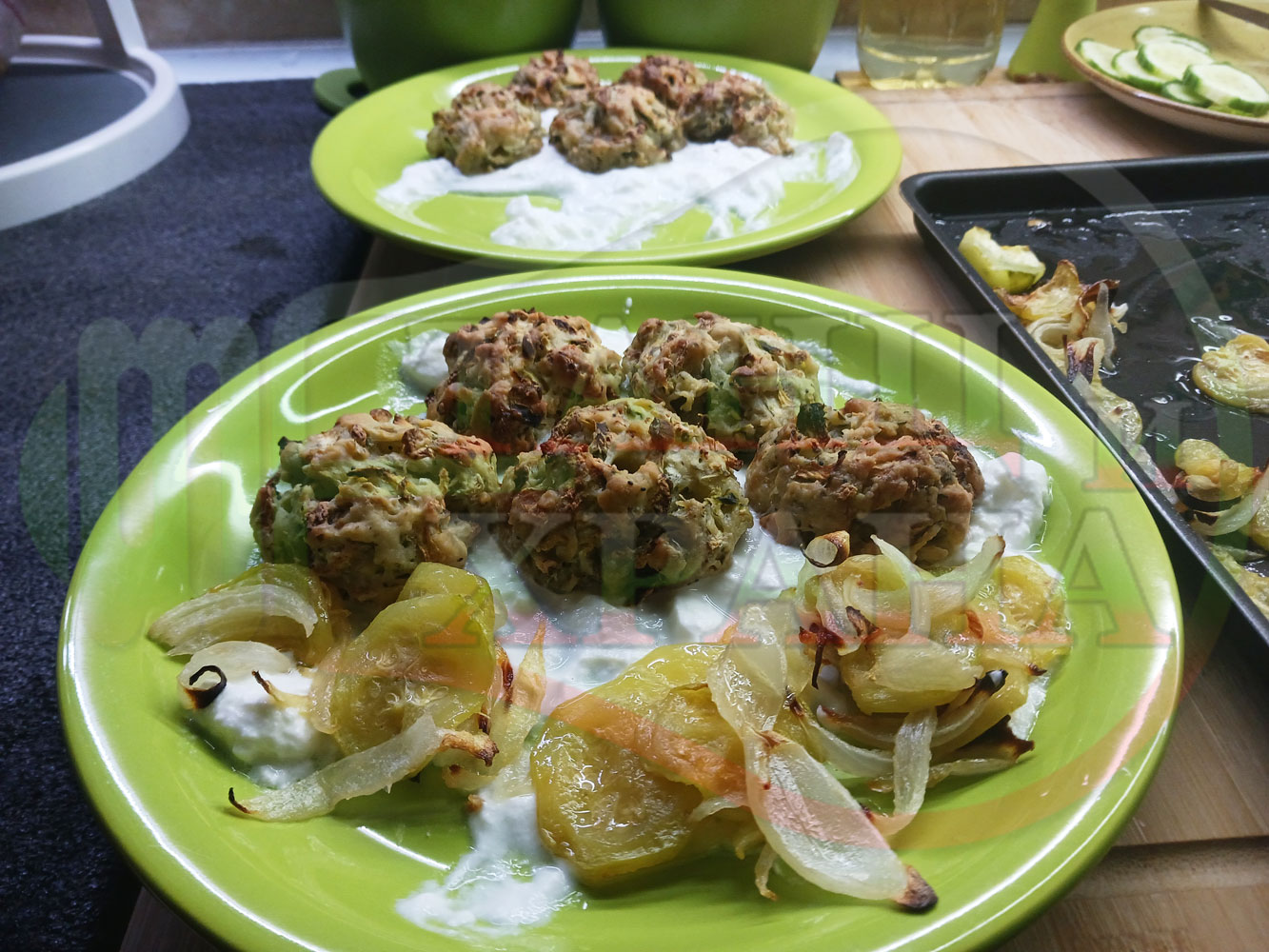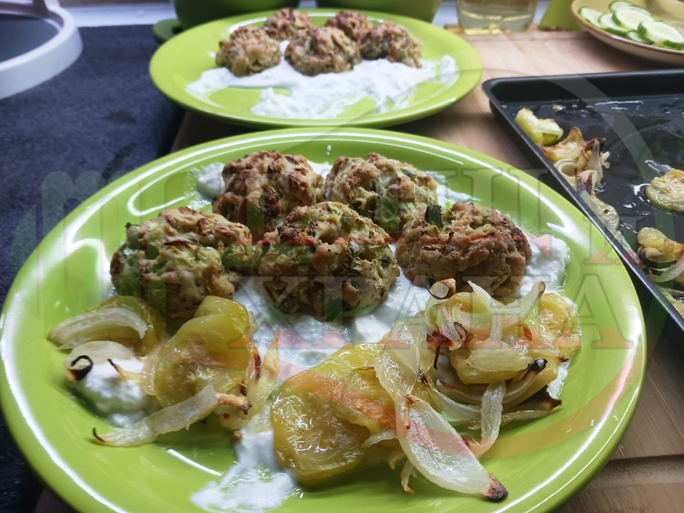 Зеленчукови кюфтенца "Краставичночеснови БГмерудийни" приготвени с пресни краставици, ронена чубрица, слънчогледово олио и стар чесън подходящи за постещи хора гарнирани с млечна основа с кисело мляко от България за непостещи