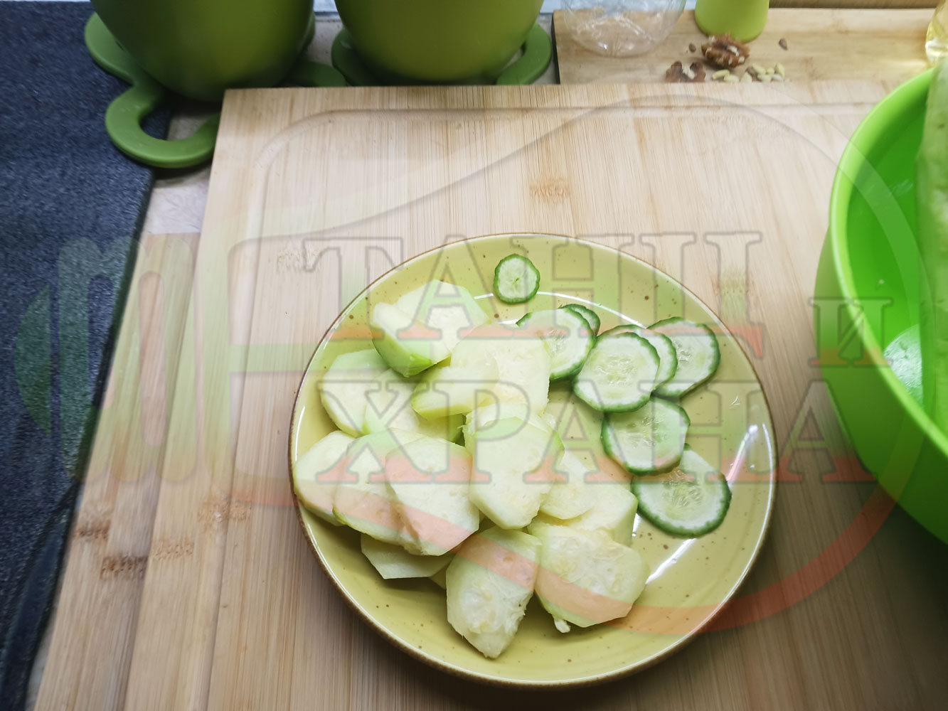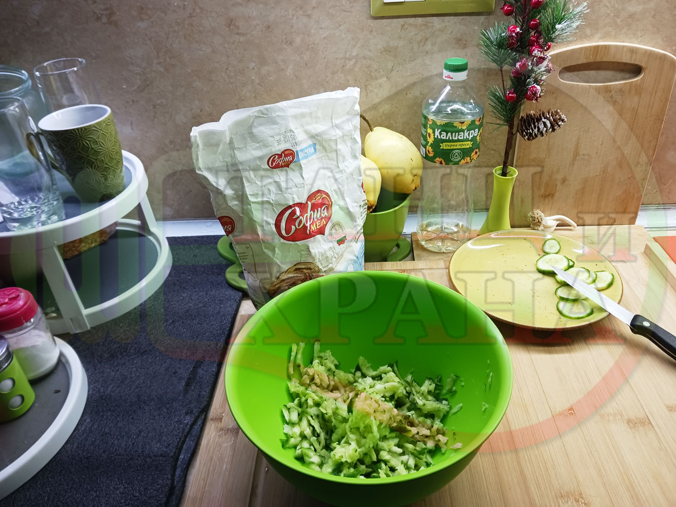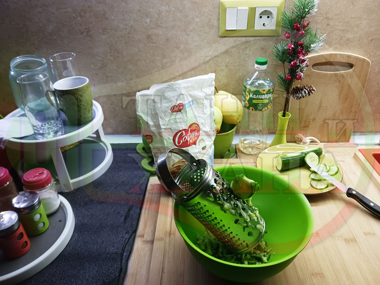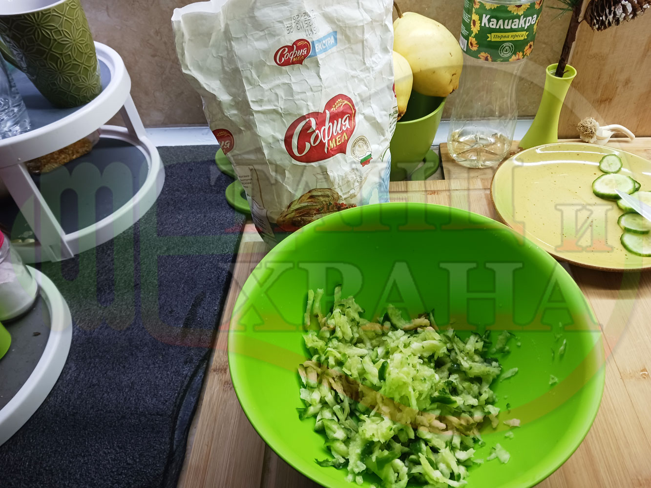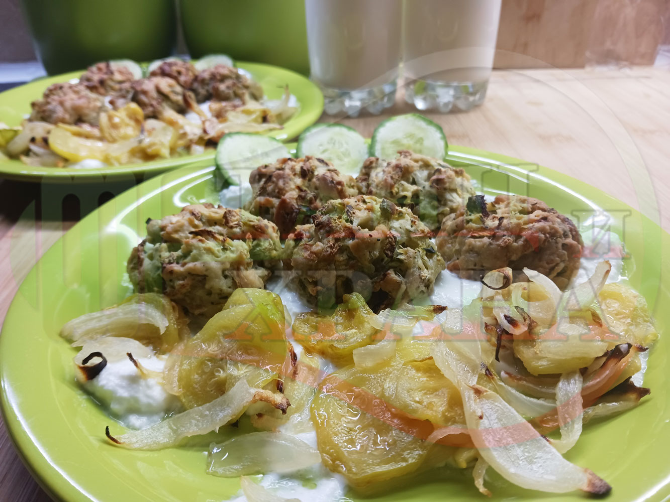 Зеленчукови кюфтенца "Краставичночеснови БГмерудийни" приготвени с пресни краставици, ронена чубрица, слънчогледово олио и стар чесън подходящи за постещи хора гарнирани с млечна основа с кисело мляко от България за непостещи