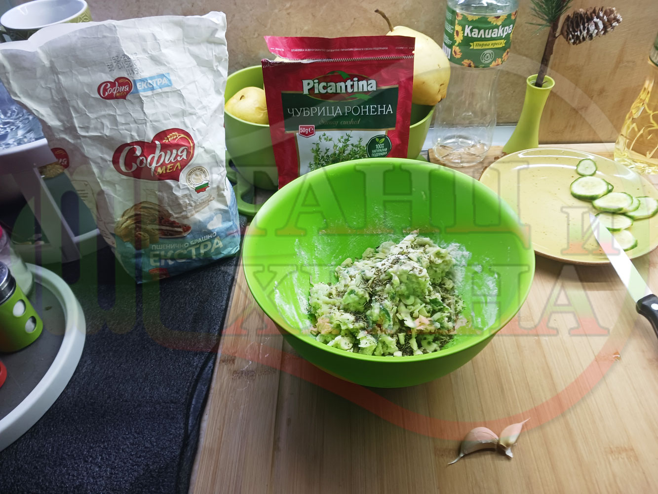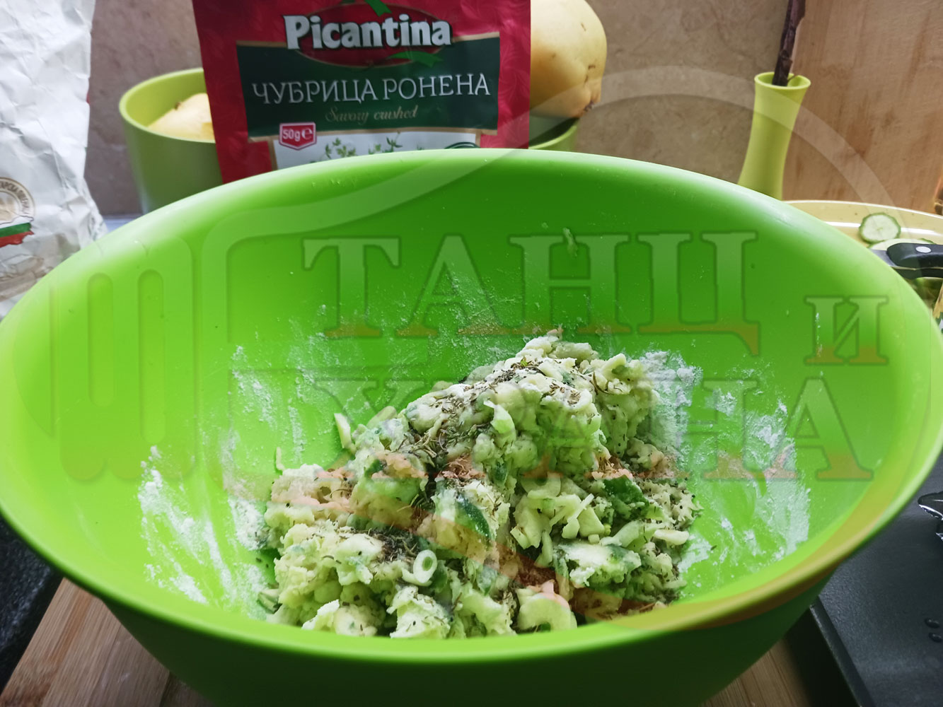 Измийте краставицата, настържете я на едро в купа, сипете слънчогледовото олио, брашното и ронената чубрица и добавете обеления и нарязан на едро стар чесън (нарежете част от краставицата на кръгчета за украса). Започнете да замесвате тестото и поръсвайте с брашно при необходимост до пълното отлепяне на тестото от купата (готовото тесто се отлепя лесно от купата). Оформете топка от тестото и го разпределете на малки топчета според броя на кюфтенцата, които искате да приготвите (от описаните количества се получават 10 малки към средно големи кюфтенца).