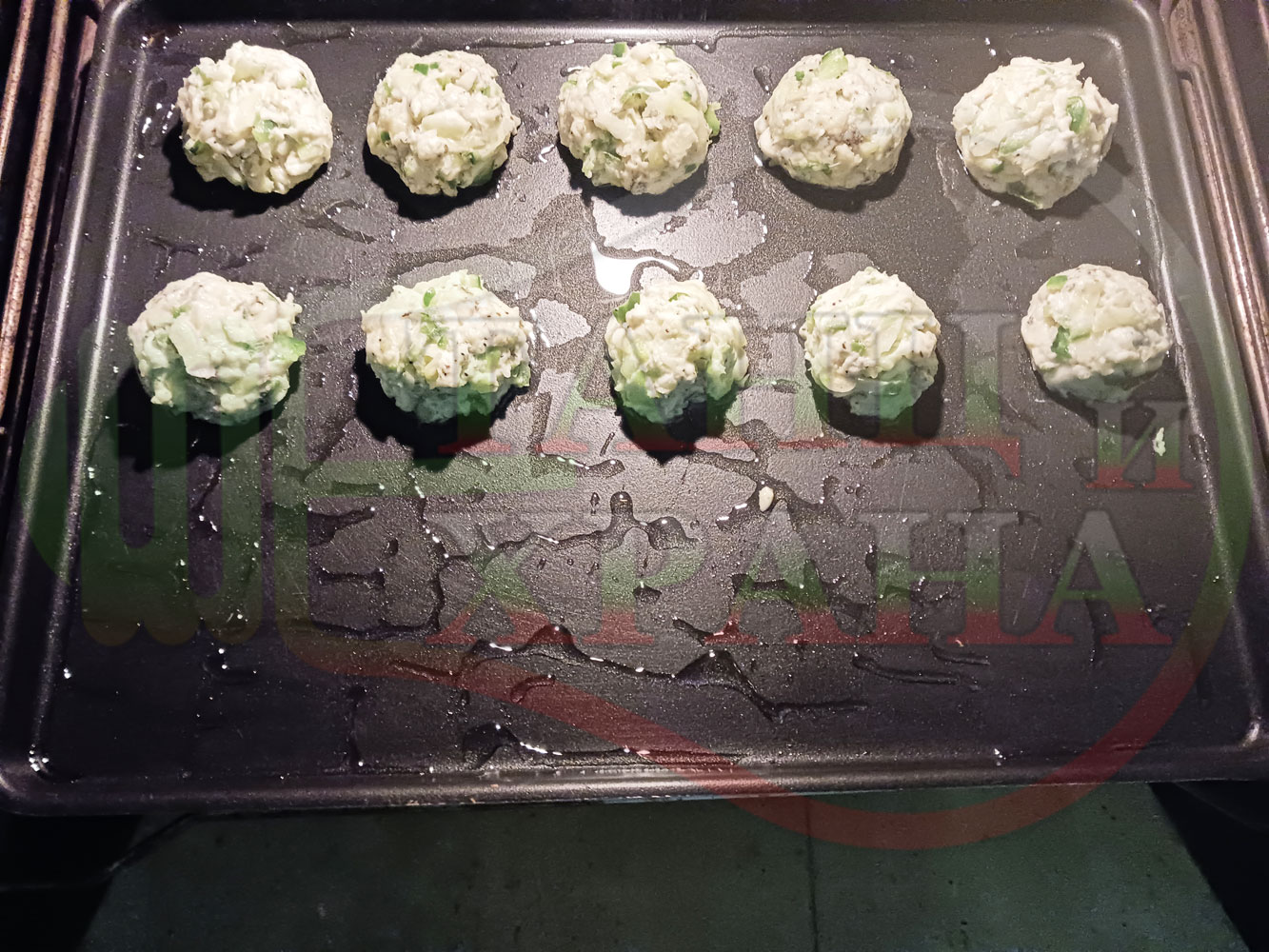 Сипете слънчогледово олио в тава за печене и го размажете равномерно по тавата чрез накланяне или с четка. Оформете от топчетата средни към големи кюфтенца и ги подредете в тавата с отстояние между тях. Поставете тавата в предварително загрятата фурна (загрейте я за поне 5 минути). Запечете на фурна без вентилатор на 180 градуса за около 35 минути.