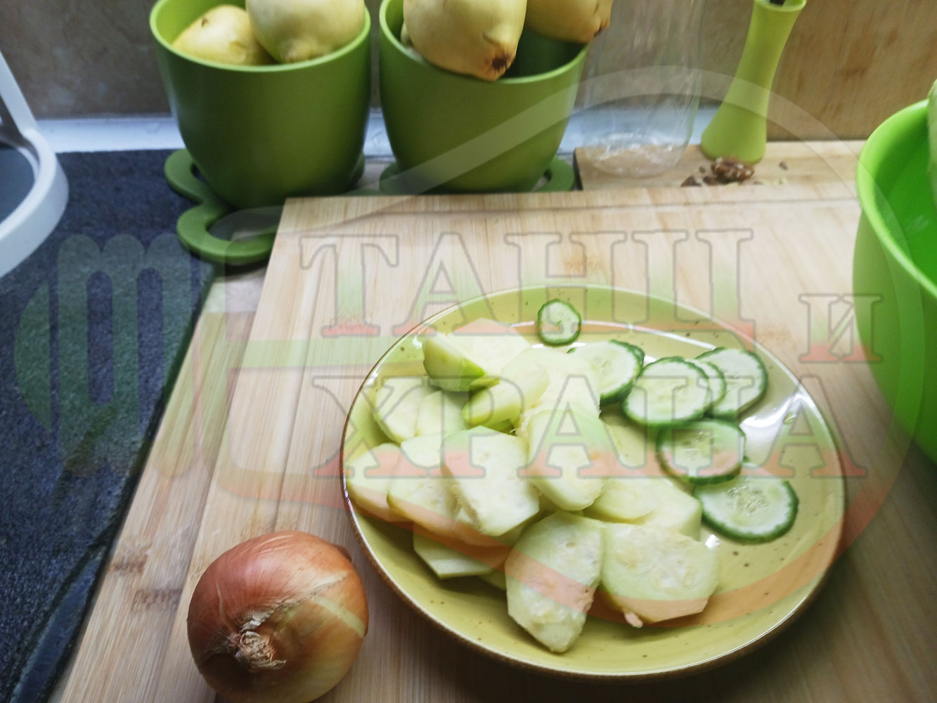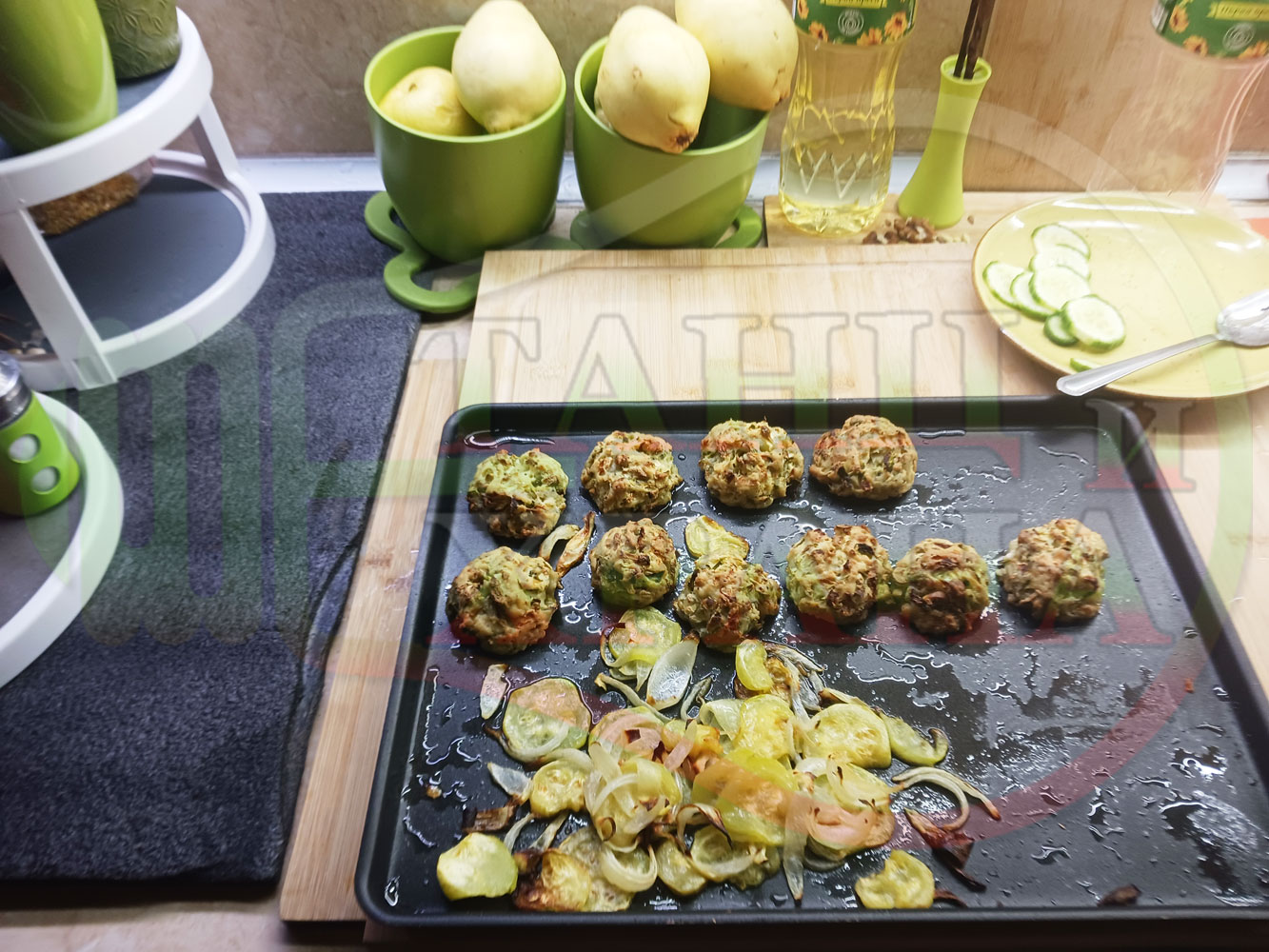 Измийте тиквичката, обелете кората, в случай че има по-големи нарянявания, нарежете я на кръгчета и я добавете към краставичните кюфтенца заедно с обеления, измит и нарязан на ивички кромид лук около 20 минути преди края на зададеното време. Дозапечете краставичните кюфтенца и гарнитурата до желаната от вас степен (средно запечени кюфтенца, тиквички и лук или по-запечени).