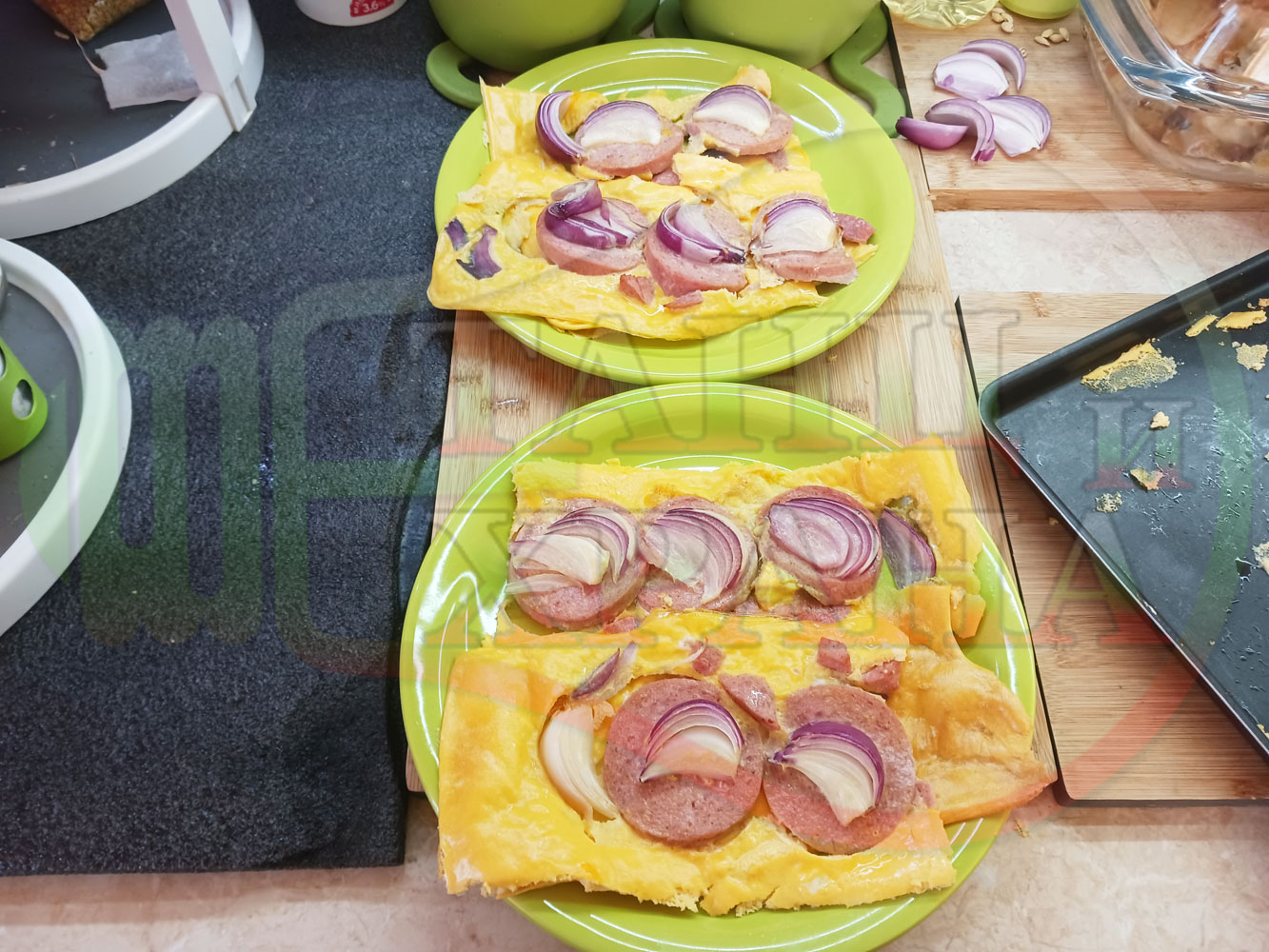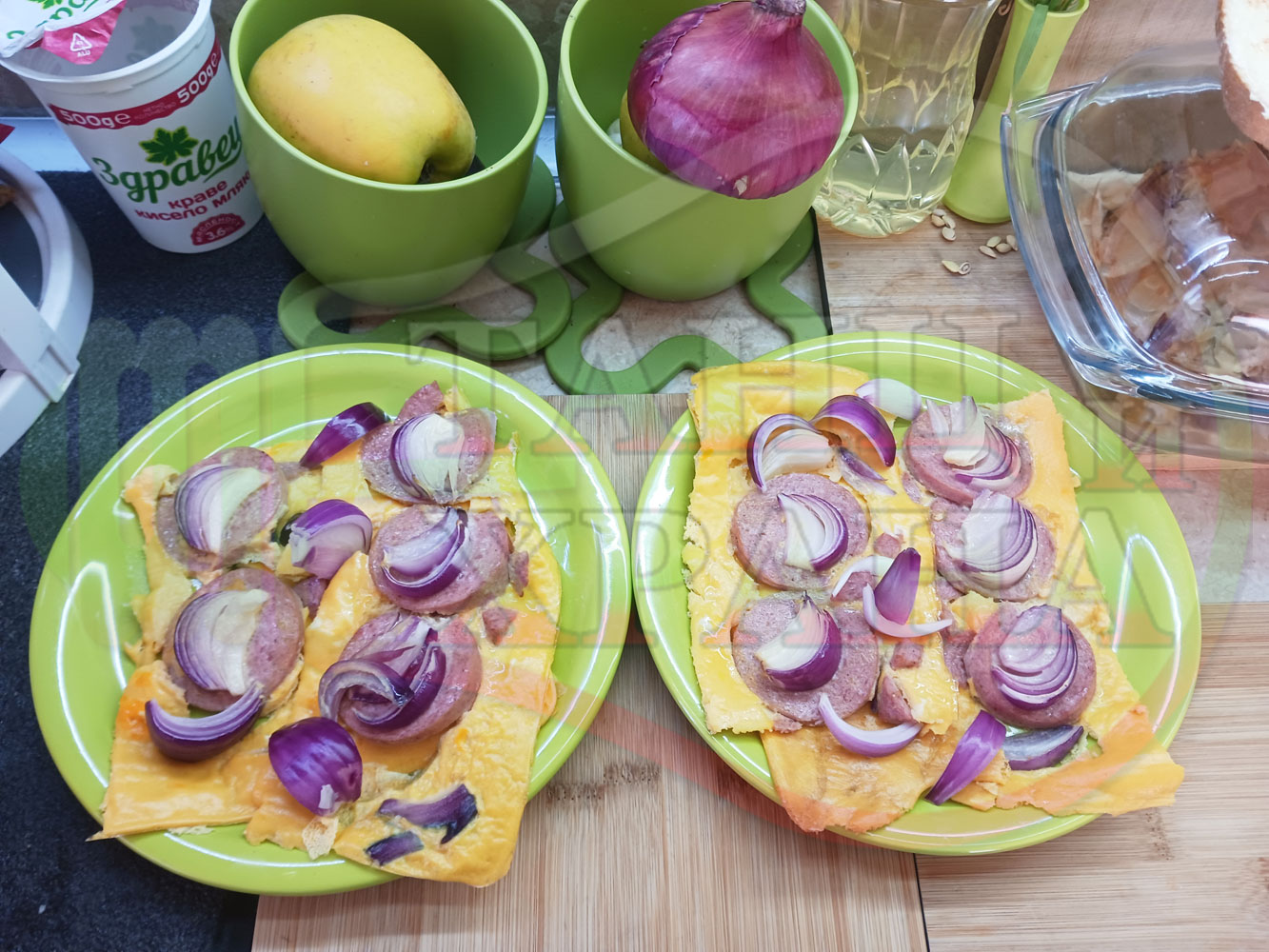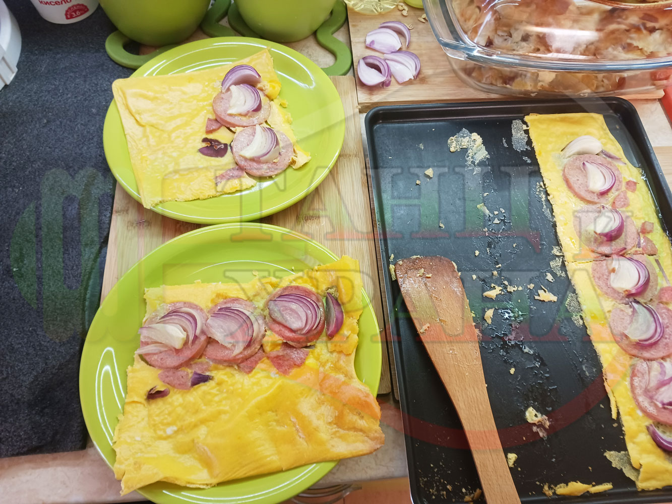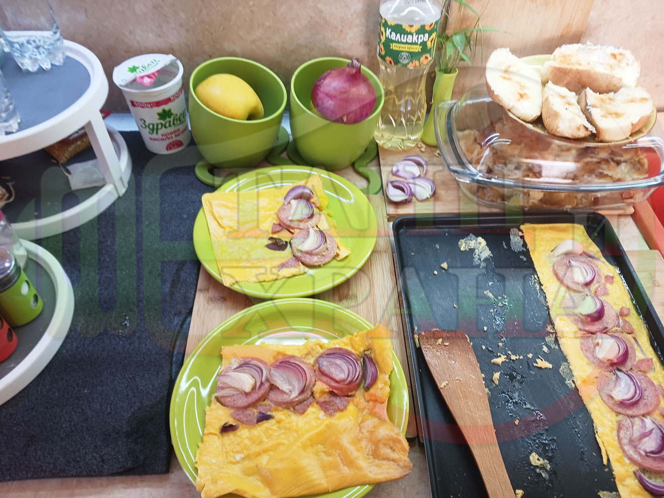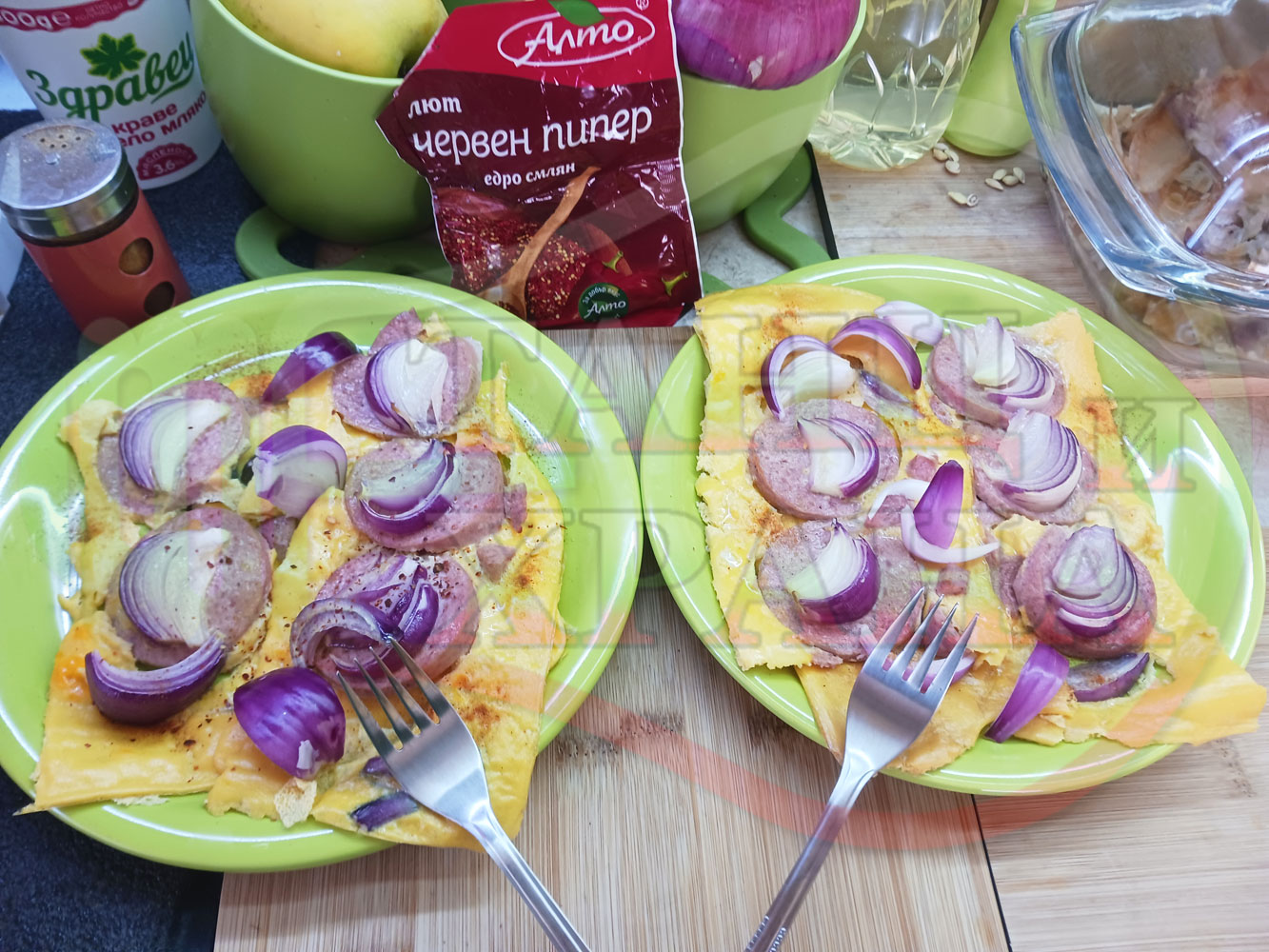 Толкова протеини, толкова вкус, толкова полезни съставки, включени в набързо спретнатата яйчена пита с така обичания още от детските ми години салам "Камчия"... аромат на запечен лук и салам се носи из кухнята... отново се получи голяма вкусно, вкусна, вкусотия (вкуснотия). ![]()