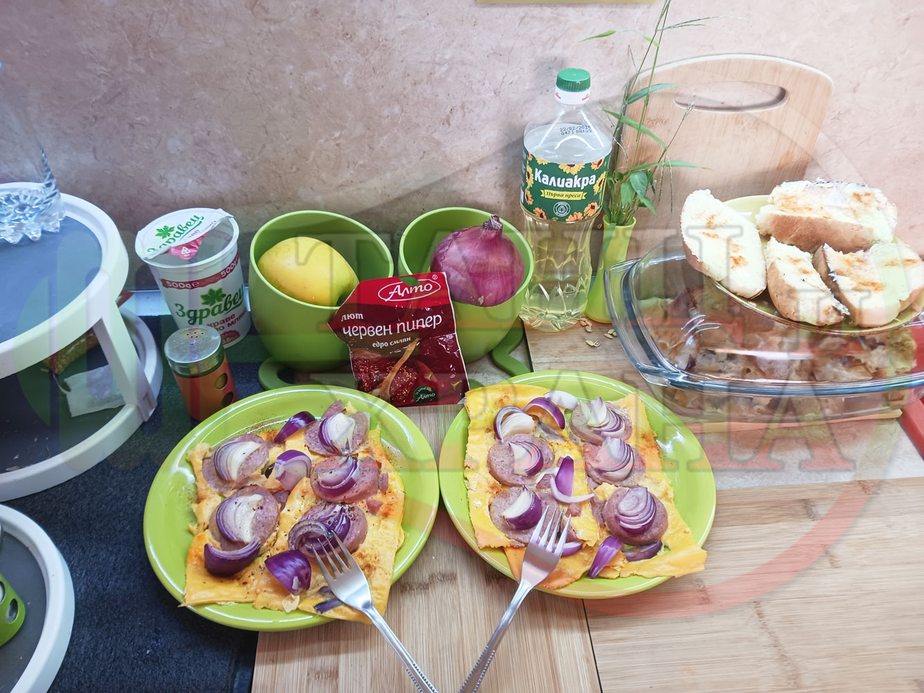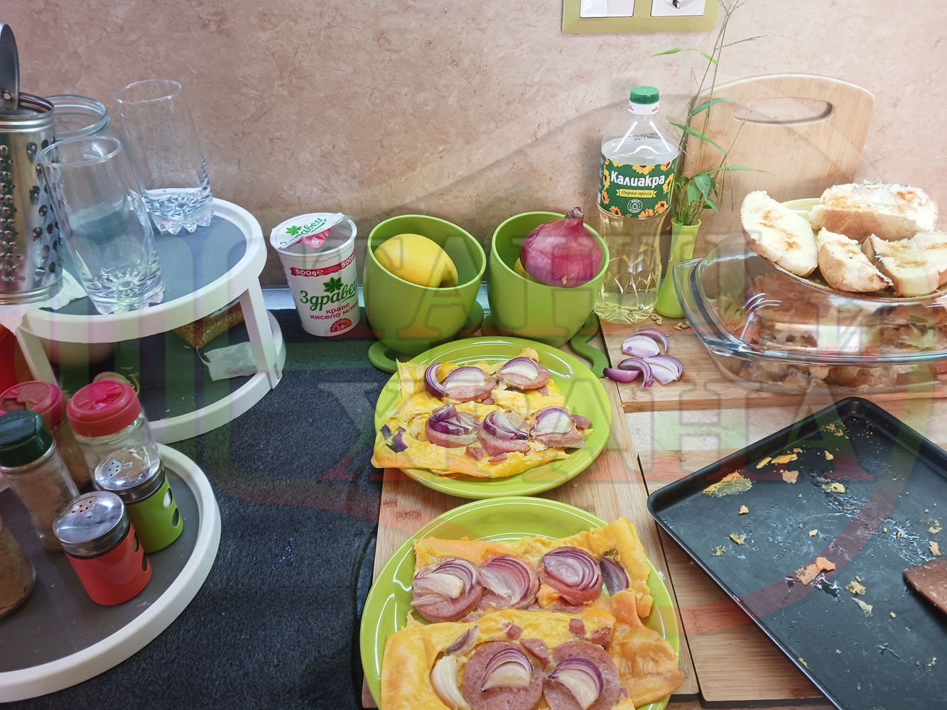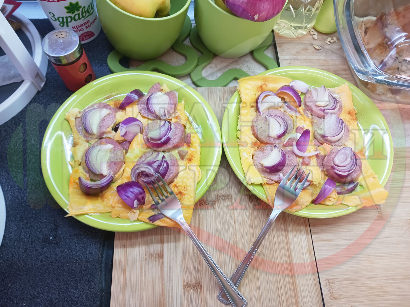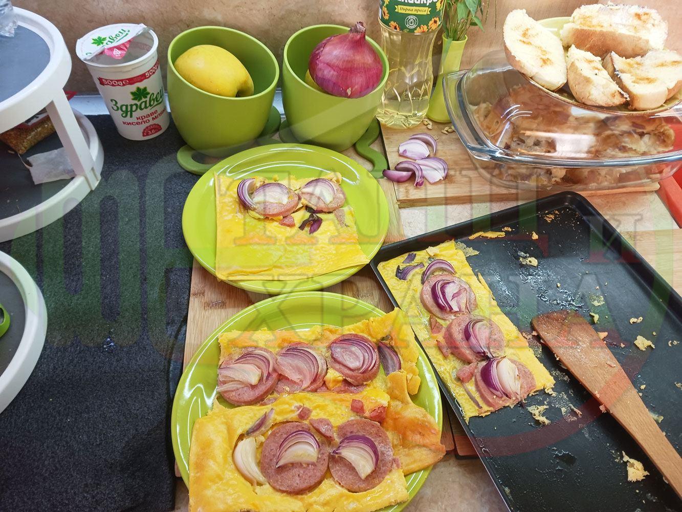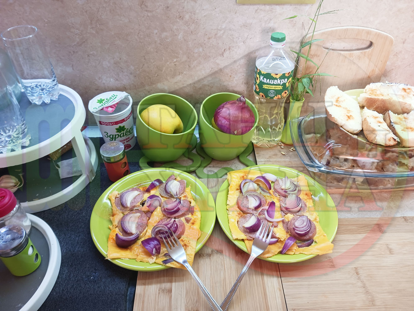 Толкова протеини, толкова вкус, толкова полезни съставки, включени в набързо спретнатата яйчена пита с така обичания още от детските ми години салам "Камчия"... аромат на запечен лук и салам се носи из кухнята... отново се получи голяма вкусно, вкусна, вкусотия (вкуснотия). ![]()