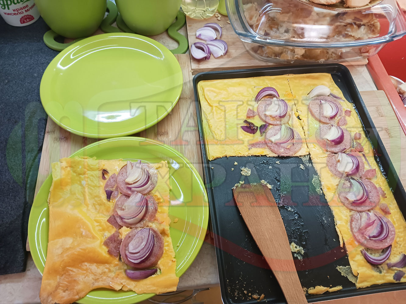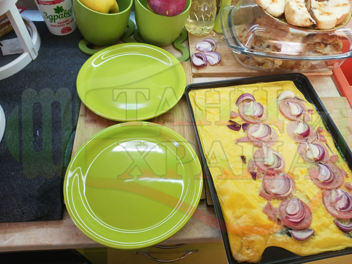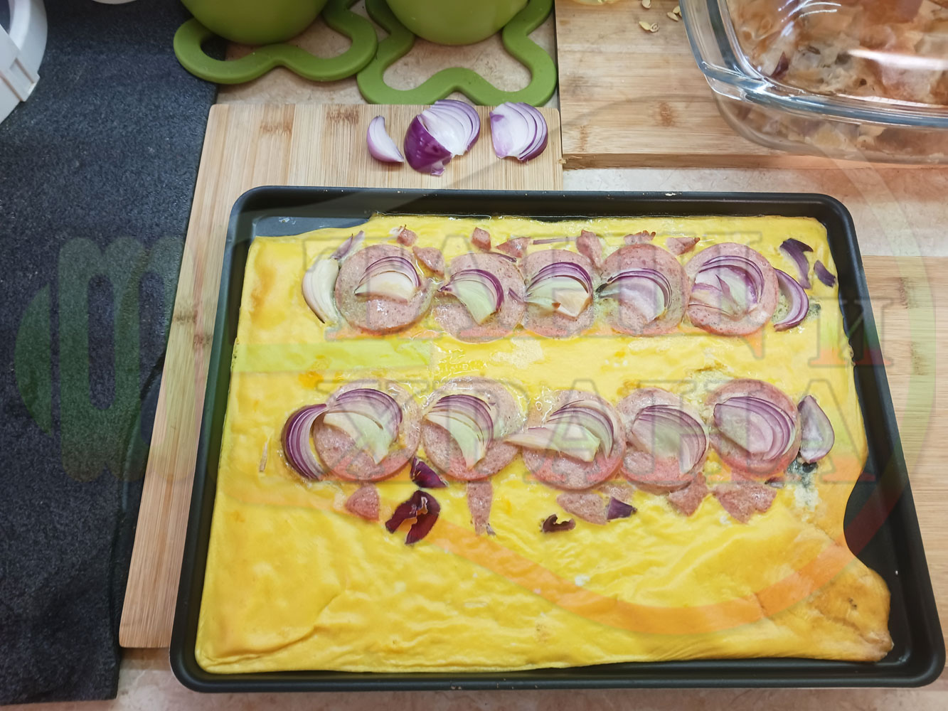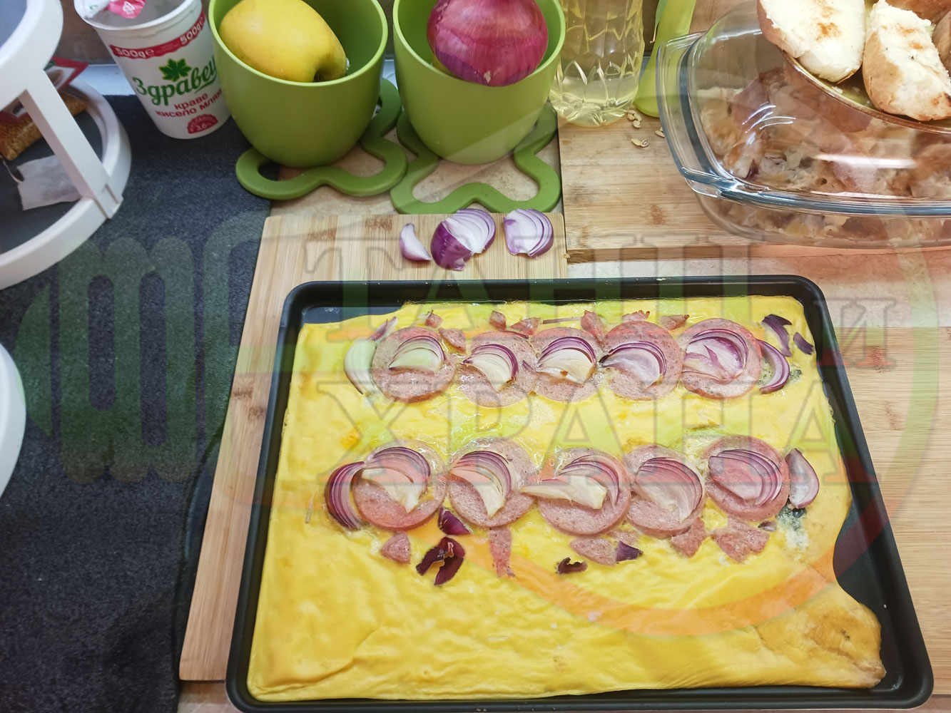 Българска яйчена пита "Камчиевосаламена воднолучена" запечена на фурна с пикантен чеснов салам, воден кромид лук и яйца приготвена от 3 основни продукта