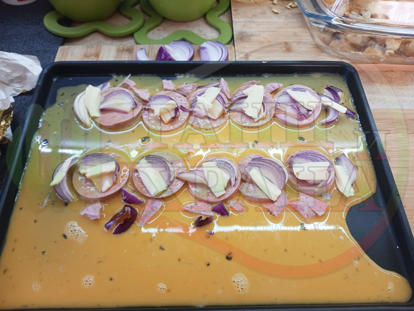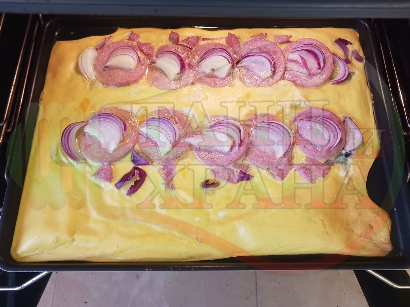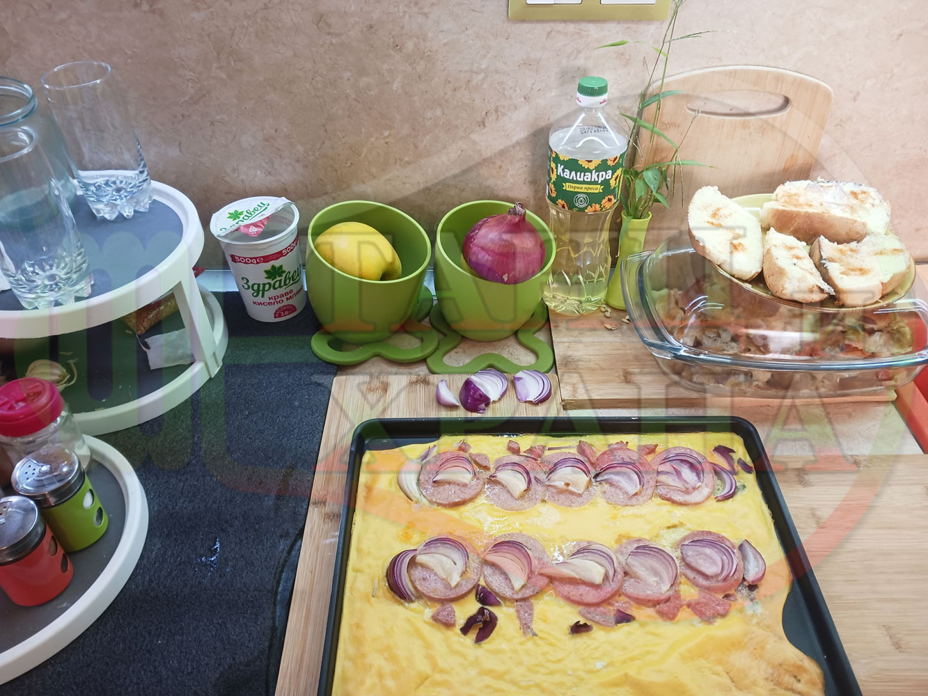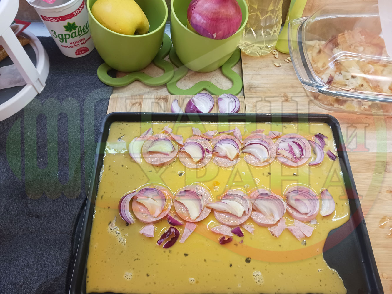 Българска яйчена пита "Камчиевосаламена воднолучена" запечена на фурна с пикантен чеснов салам, воден кромид лук и яйца приготвена от 3 основни продукта