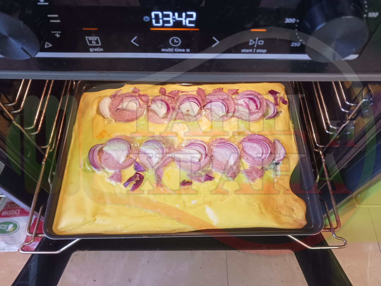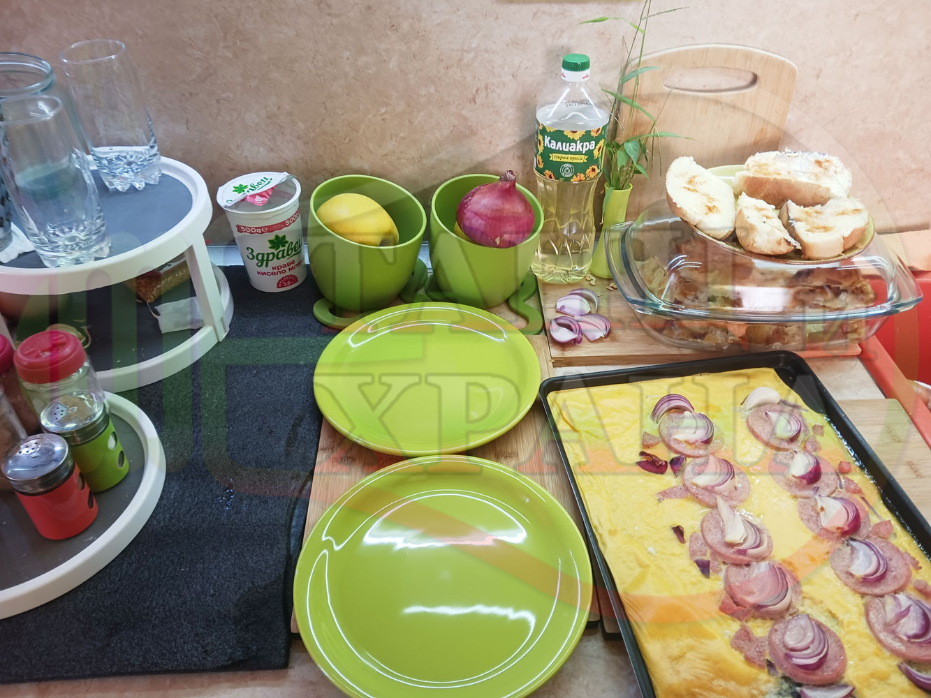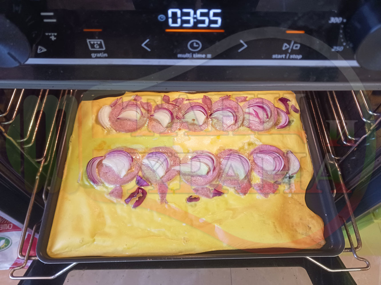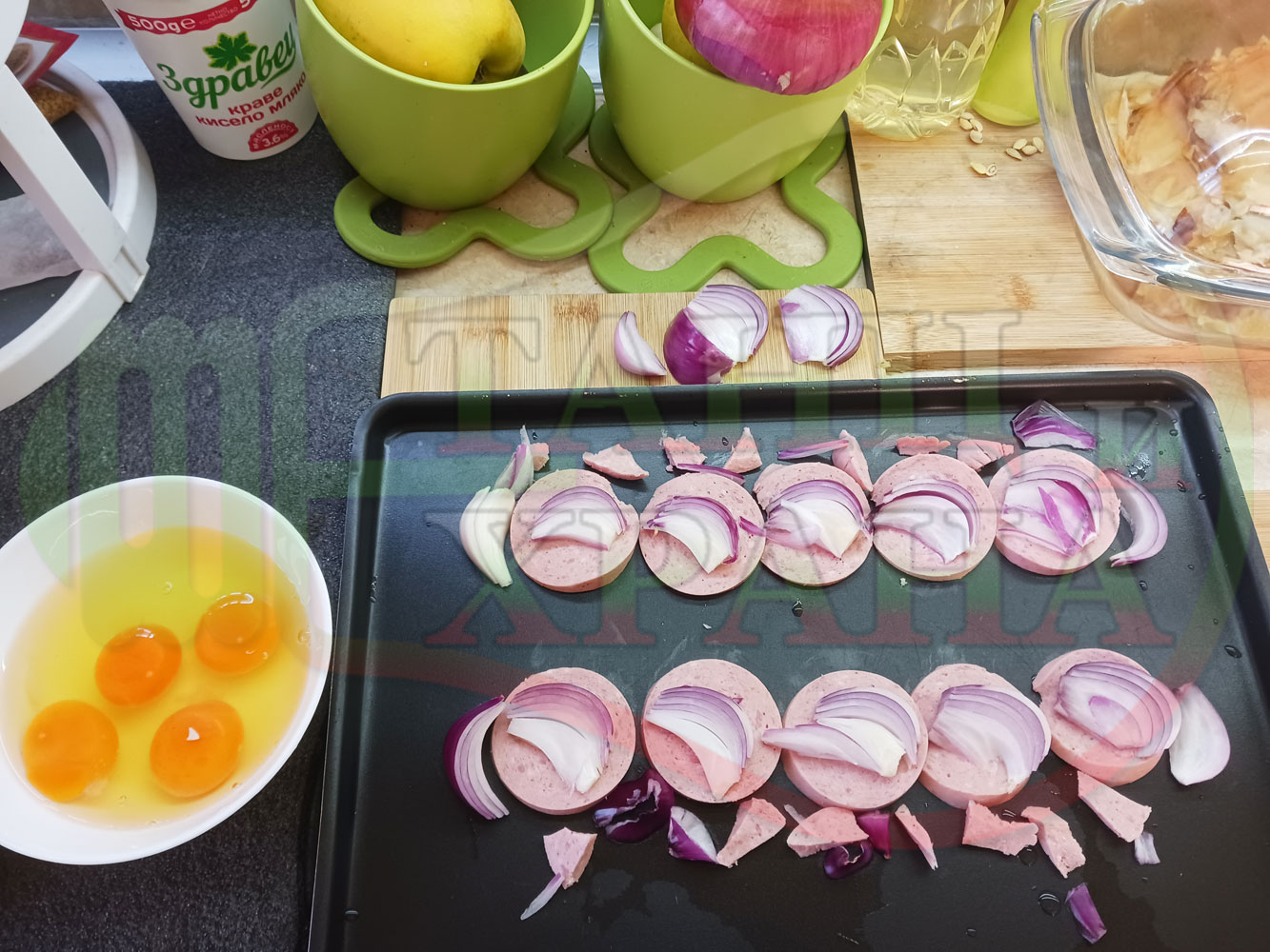 Българска яйчена пита "Камчиевосаламена воднолучена" запечена на фурна с пикантен чеснов салам, воден кромид лук и яйца приготвена от 3 основни продукта