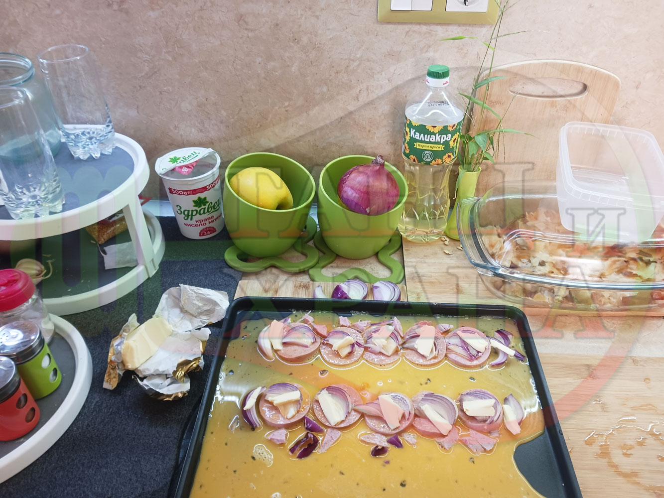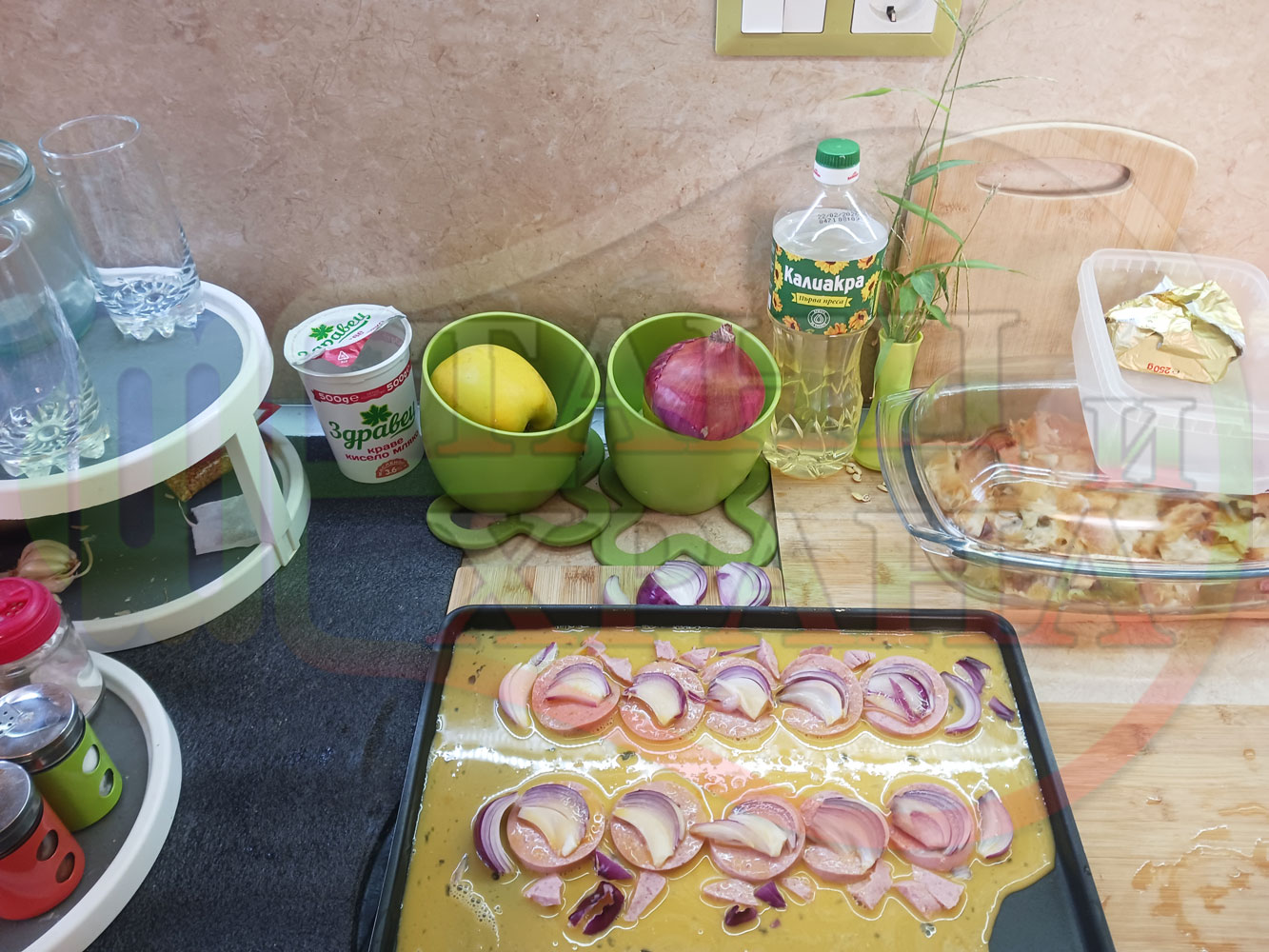 Оформете порциите с равно количество от кръгчетата и запечения лук и ги украсете със суровата, вътрешна част на лука (украсете по ваше желание и усмотрение).