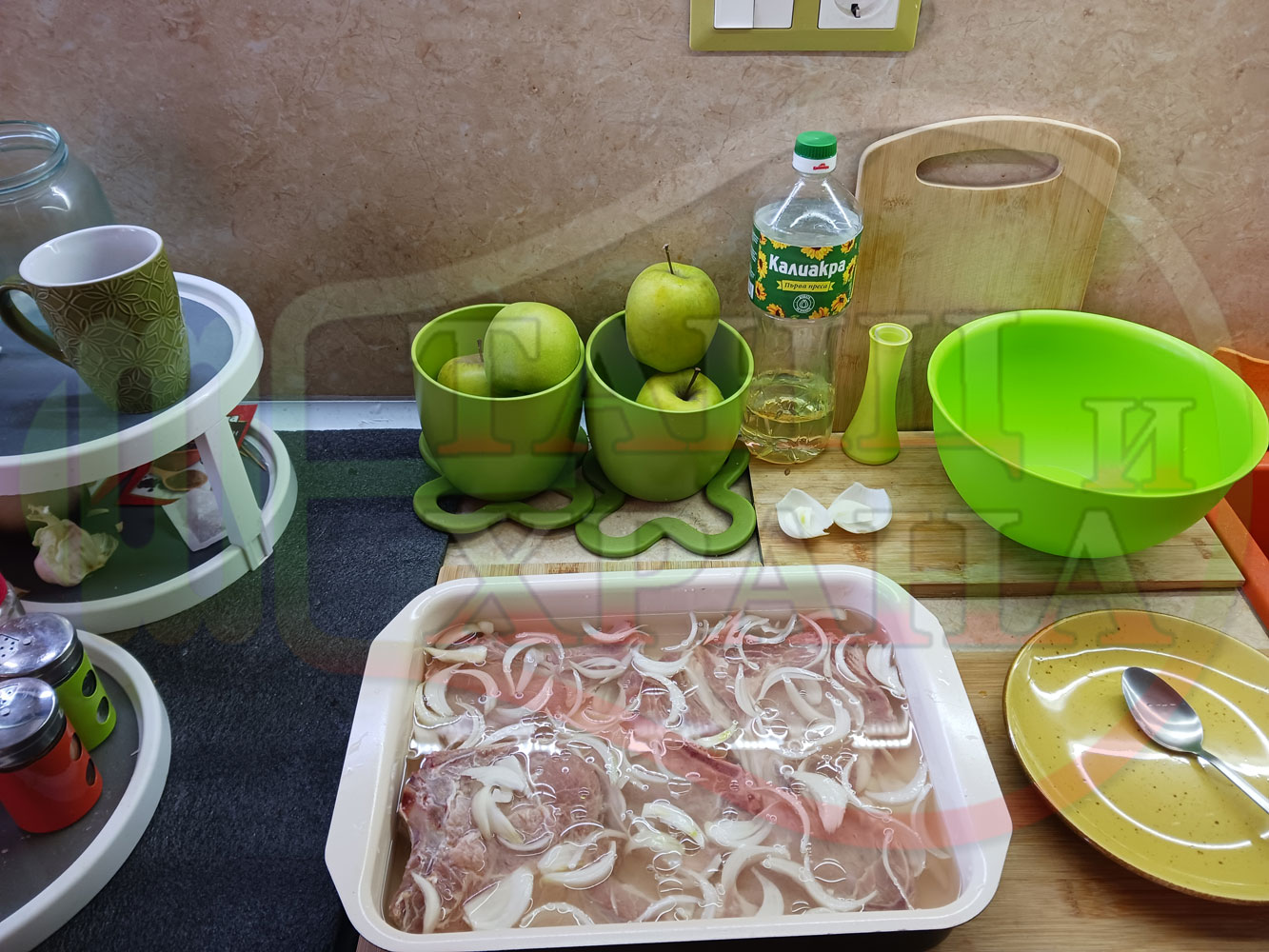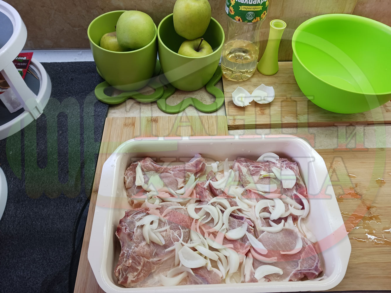 Измийте пържолите, отцедете ги и ги подредете в средно дълбока тава. Обелете, измийте, нарежете лука на ленти и го добавете в тавата заедно със солта и слънчогледовото олио (запазете част от вътрешността на лука за украса). Налейте топла към гореща вода от чешма, разбъркайте и поставете тавата в предварително загрятата фурна (загрейте я за поне 5 минути). Сварете и запечете на фурна без вентилатор на 180 градуса за около 80 минути.