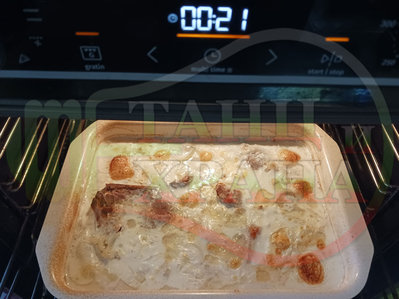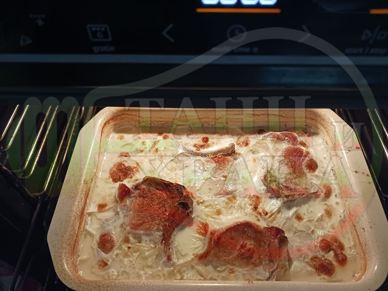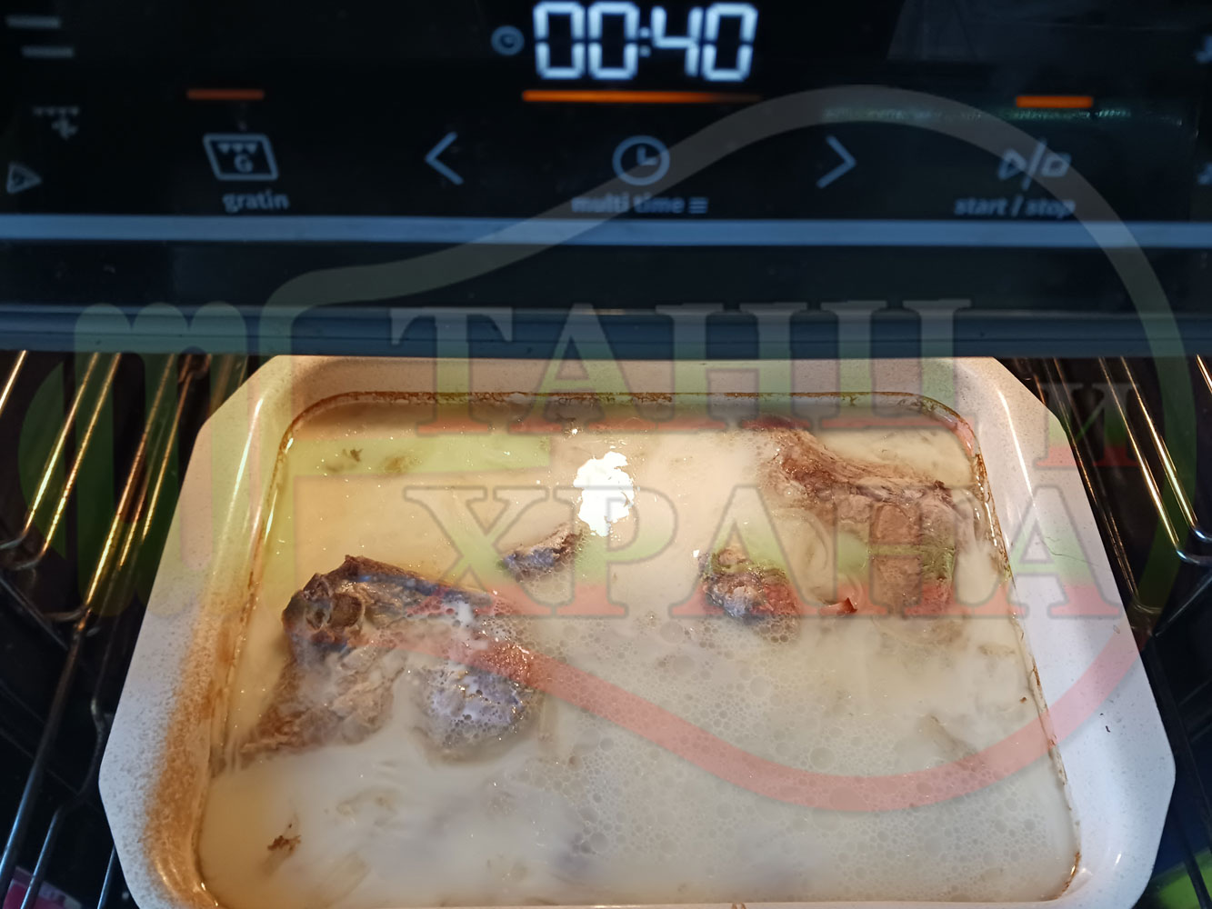 Сипете прясното мляко върху пържолите около 40 минути преди края на зададеното време, разбъркайте и ги дозапечете до желаната от вас степен (по-сурови или по-препечени пържоли).