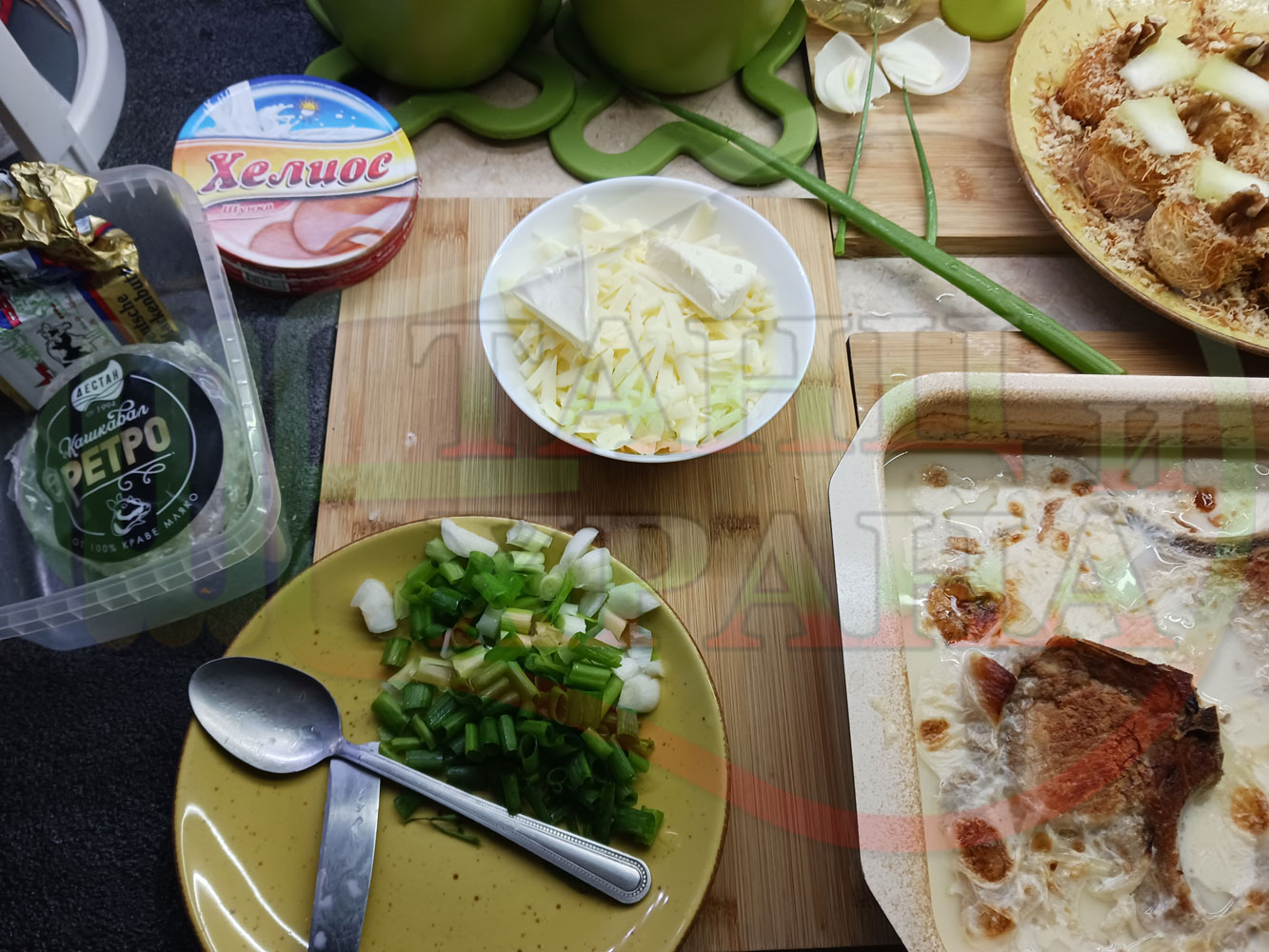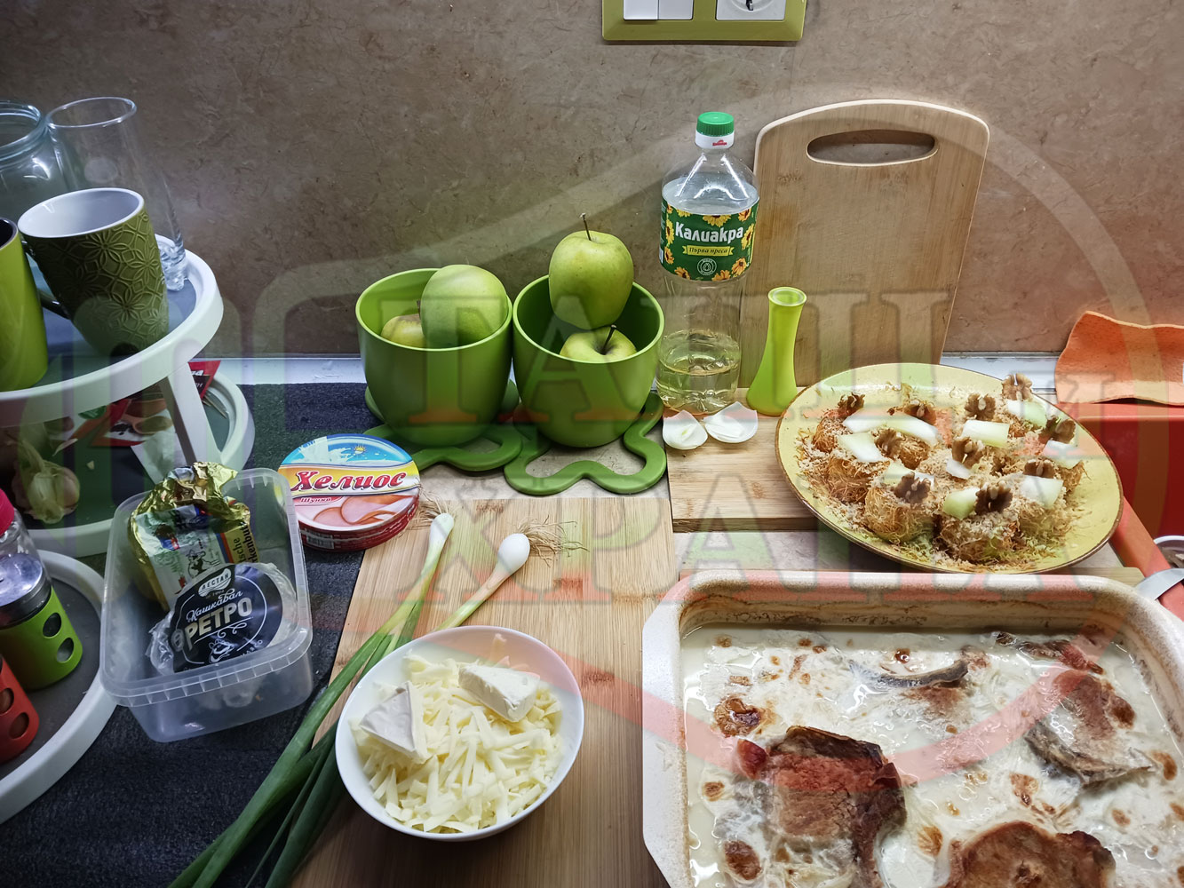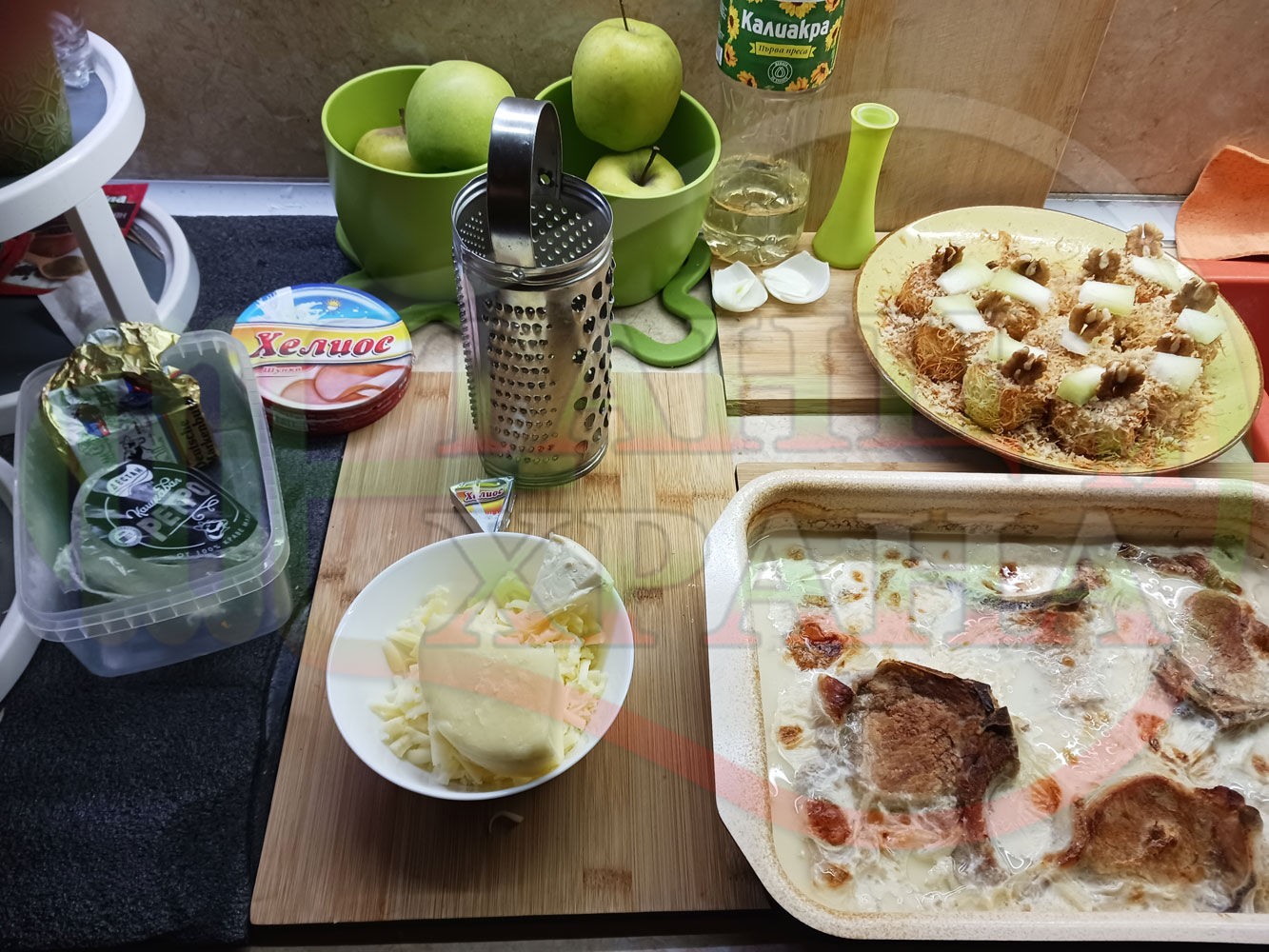 Млечни пържоли "Свинскокромидлучени кашкаваленотопеносиренови" запечени на фурна с кромид лук и прясно мляко гарнирани в кладенче от кашкавал, пресен лук и топено сирене - основно