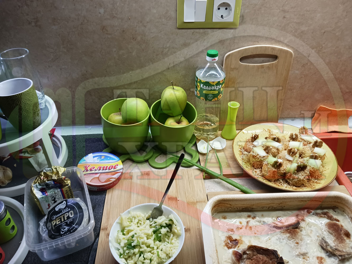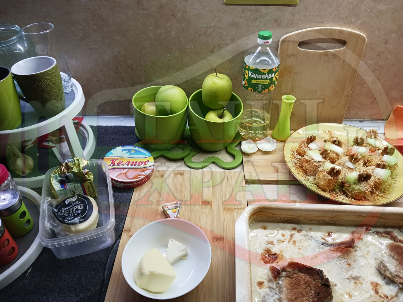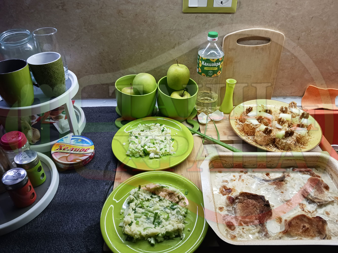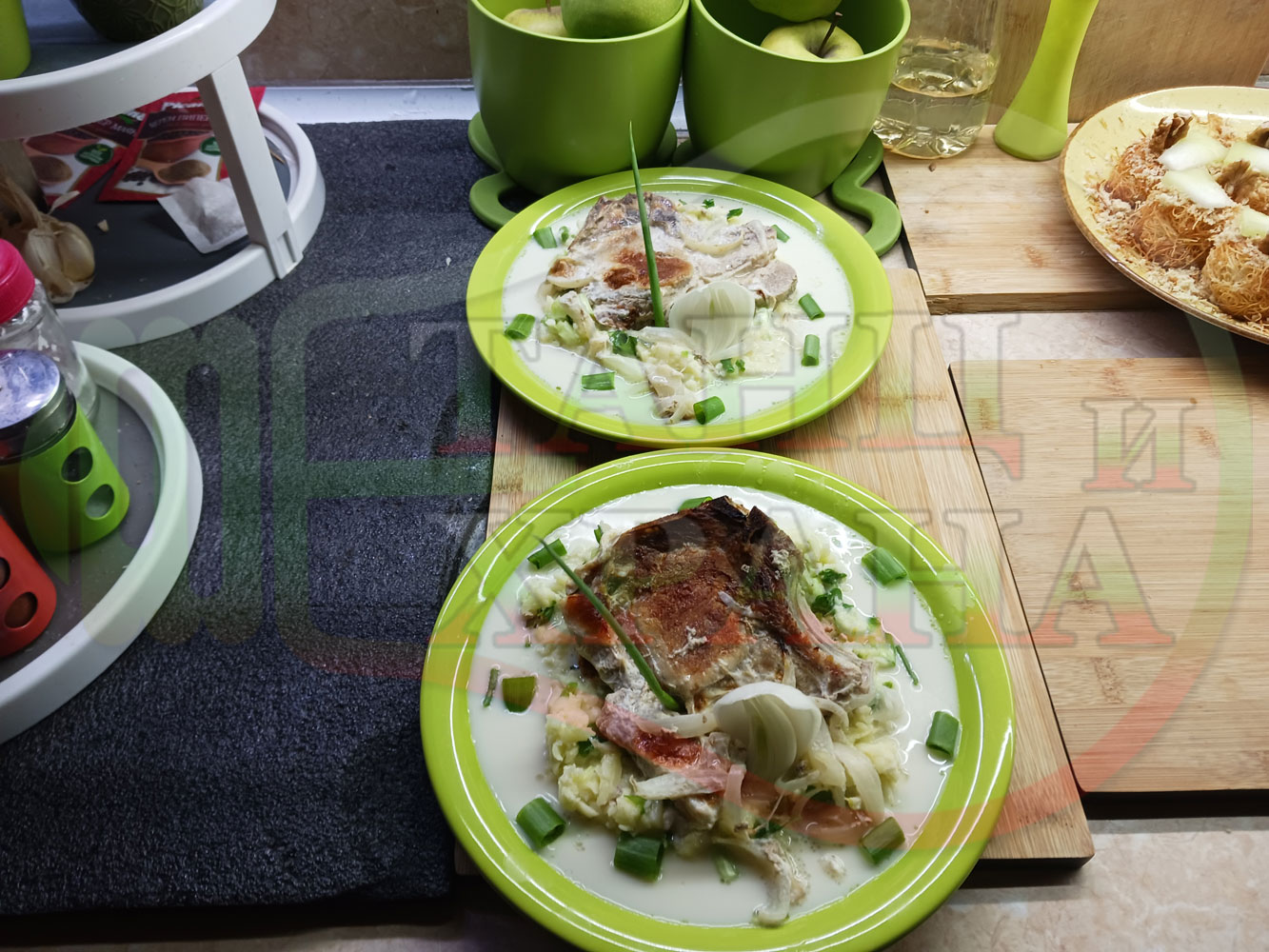 Млечни пържоли "Свинскокромидлучени кашкаваленотопеносиренови" запечени на фурна с кромид лук и прясно мляко гарнирани в кладенче от кашкавал, пресен лук и топено сирене - основно